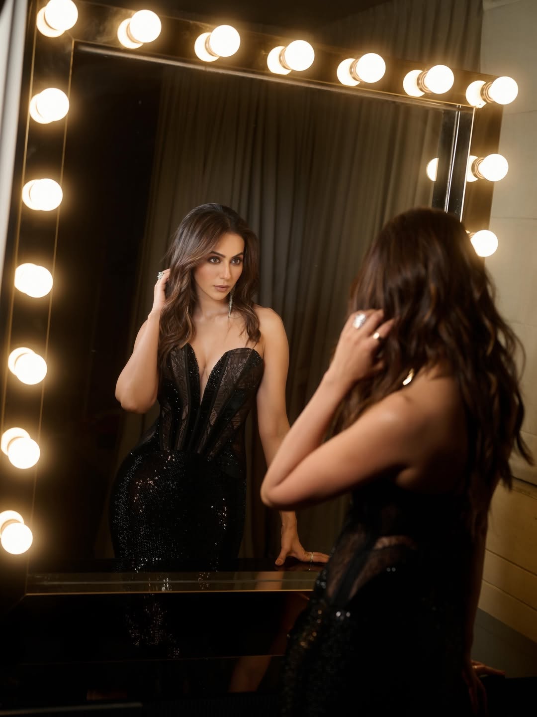 In the featured shot, she stuns in a sleek black strapless outfit with a deep neckline, detailed with delicate sequins or lace that add shimmer and sophistication. The ensemble accentuates her toned silhouette, reflecting her dedication to fitness and her confidence in carrying statement looks. Captured gazing into a mirror framed with classic vanity lights, her pose balances poise with playful charm, underscoring her natural ease in front of the camera.
