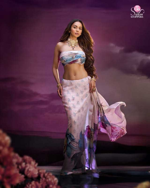 For the shoot, Rakul channels vintage elegance in a black-and-white draped saree by Studio 113 (@studio113calcutta), styled with a sculptural silver bustier from Roseroom by Isha Jajodia (@roseroom__official).