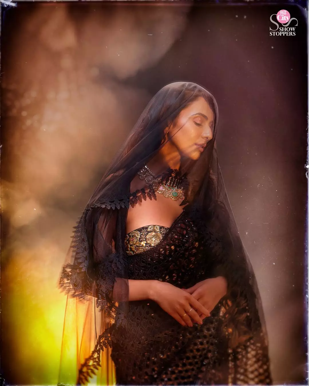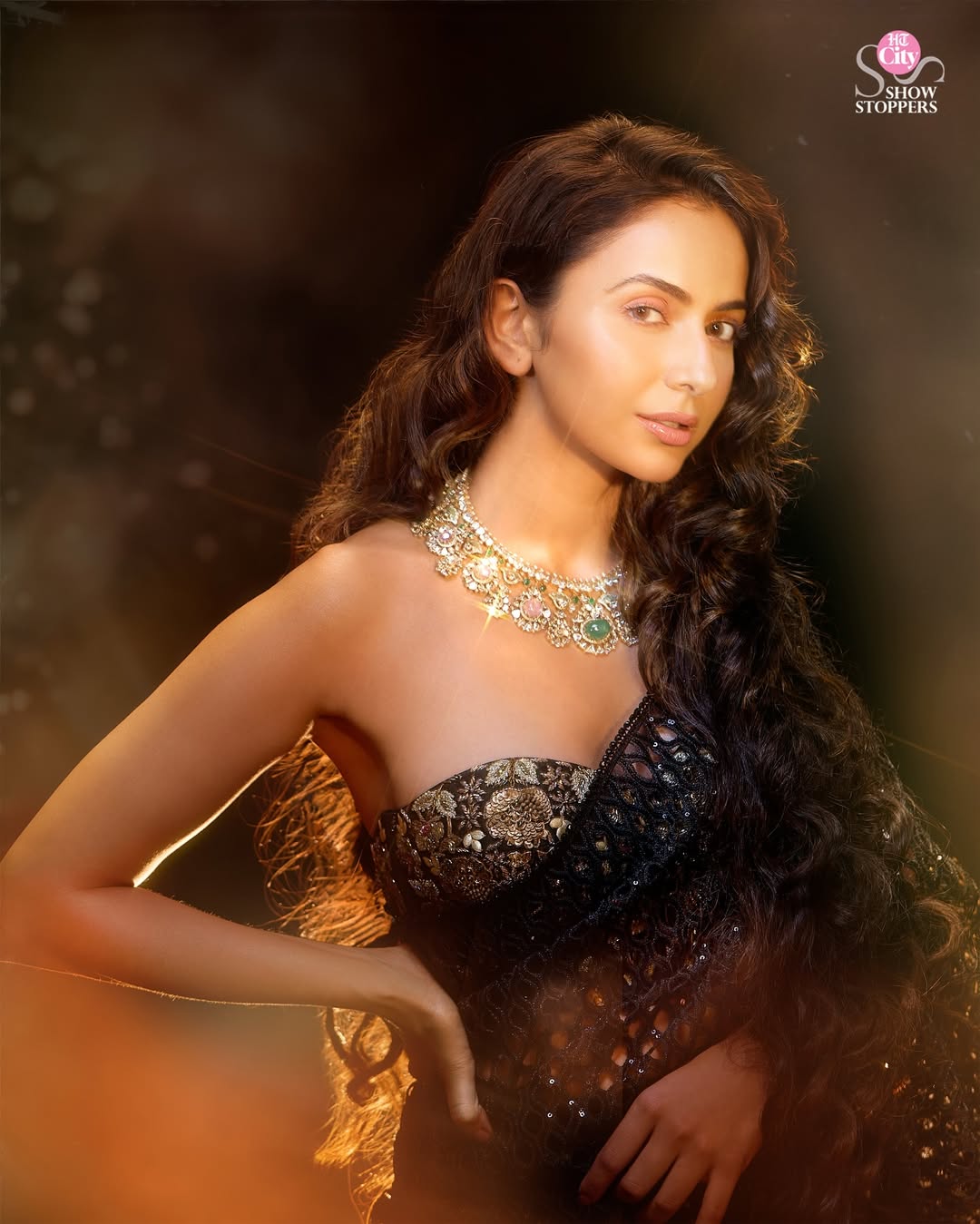 Rakul Preet Singh never fails to impress with her style and grace. Recently, HT City Showstoppers shared pictures of Rakul in a black saree designed by Nidhika Shekhar. The saree featured a detailed corset and beautiful cutwork pallu, making her look elegant. To complete her look, she wore a Noor-e-Nizam necklace by ASV Polkis. The necklace had green stones, morganites, and a rare Russian emerald, which made the outfit even more special.