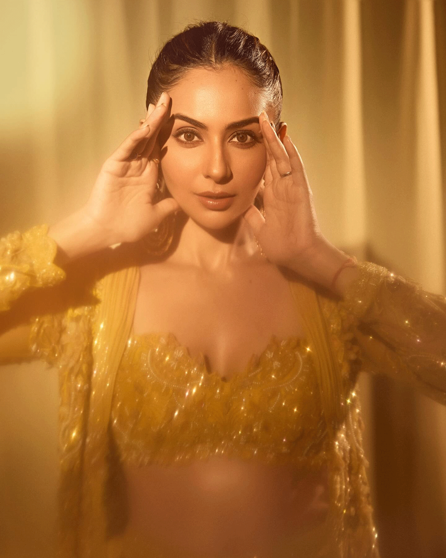 Rakul wore a sculptured blouse with pearl and mirror embroidery. She paired it with a richly embroidered lehenga. A satin dupatta completed the look.