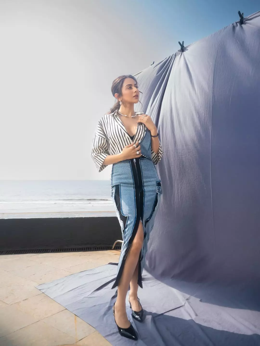 Rakul Preet Singh just hijacked the beach for DDPD2 promotions—Samundar kinare vibes on max! A half-unbuttoned stripe shirt flirts with a black lace bralette, while that ripped-patchwork denim skirt screams “I woke up like this… on a movie set.”