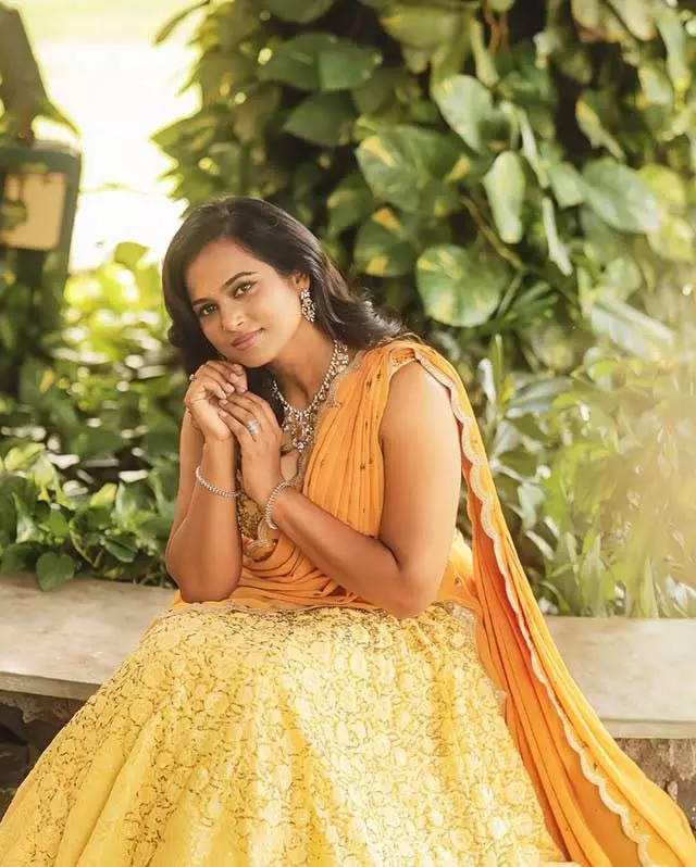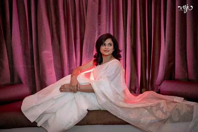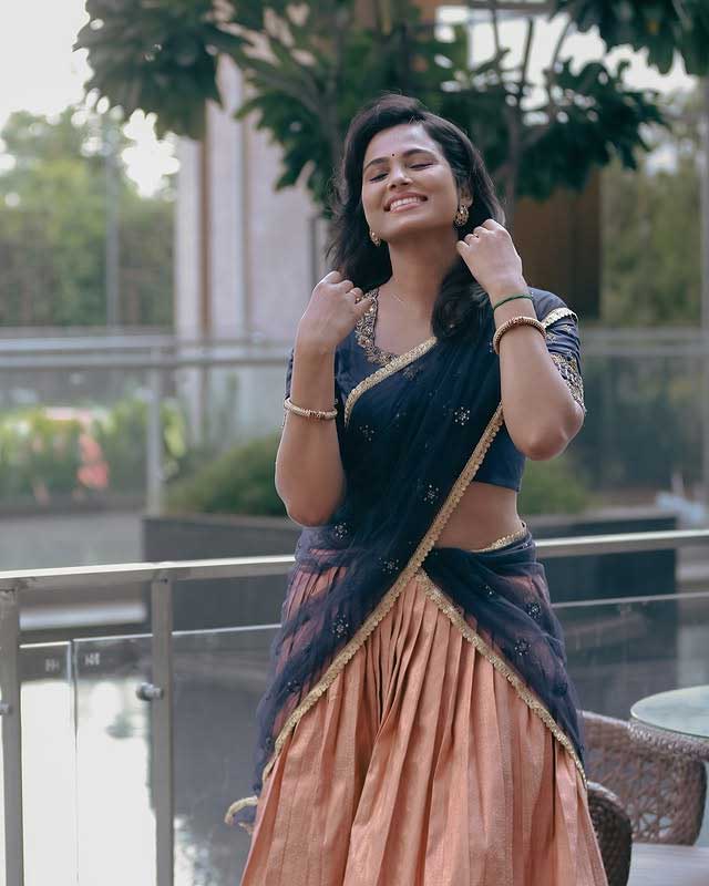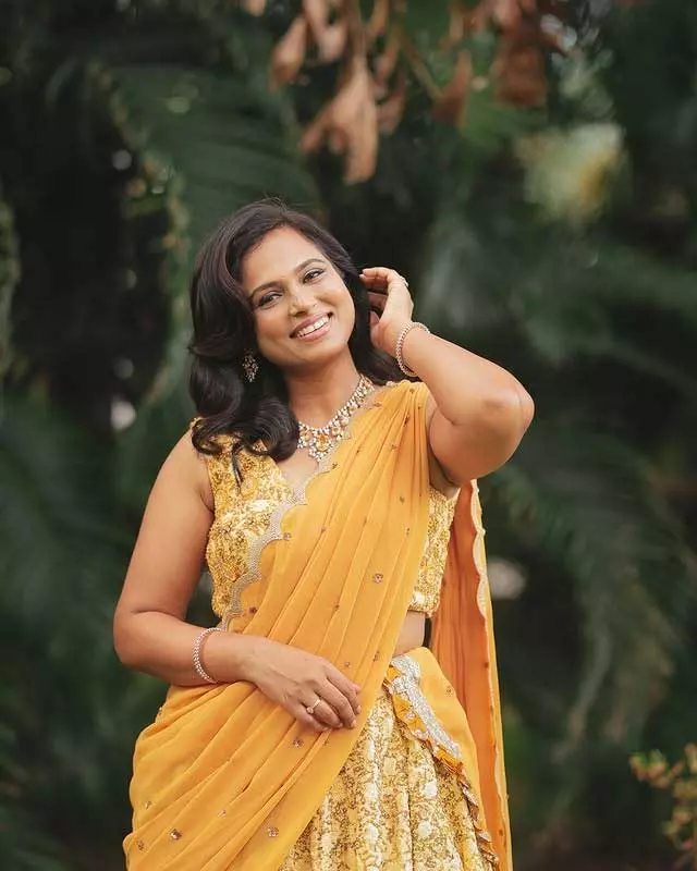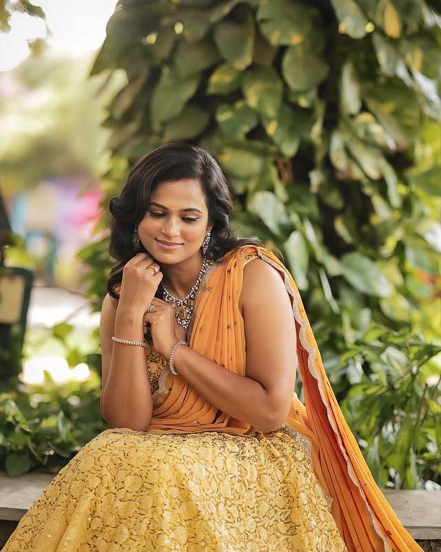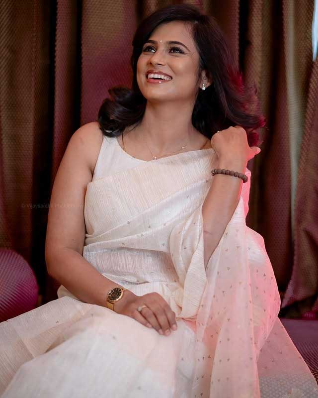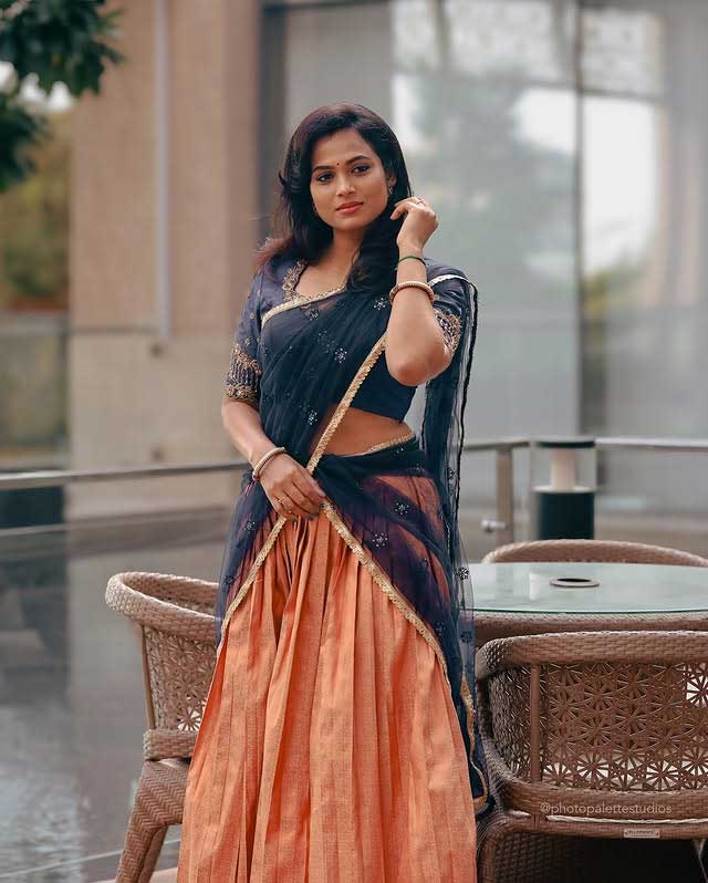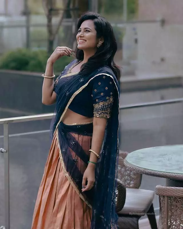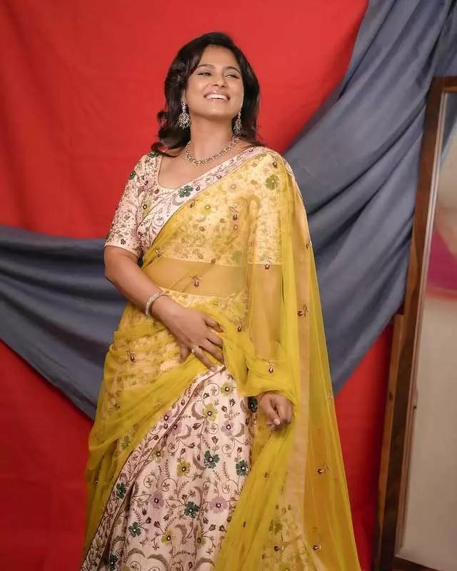 In this post, Ramya wore a saree designed by Madhurya Creations, paired with a chic blouse by Zarigai by Gitanjali. The subtle combination of the saree's pink hues and the intricate work on the blouse gave her an effortlessly elegant look. The styling was done by Joshua Maxwell, who brought out the best in Ramya with a sophisticated touch, while her makeup was done by Noor Makeup Sculpture, giving her a natural yet radiant look. The photography was skillfully captured by Photos by Mandee.