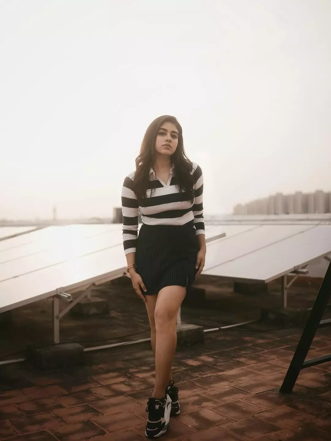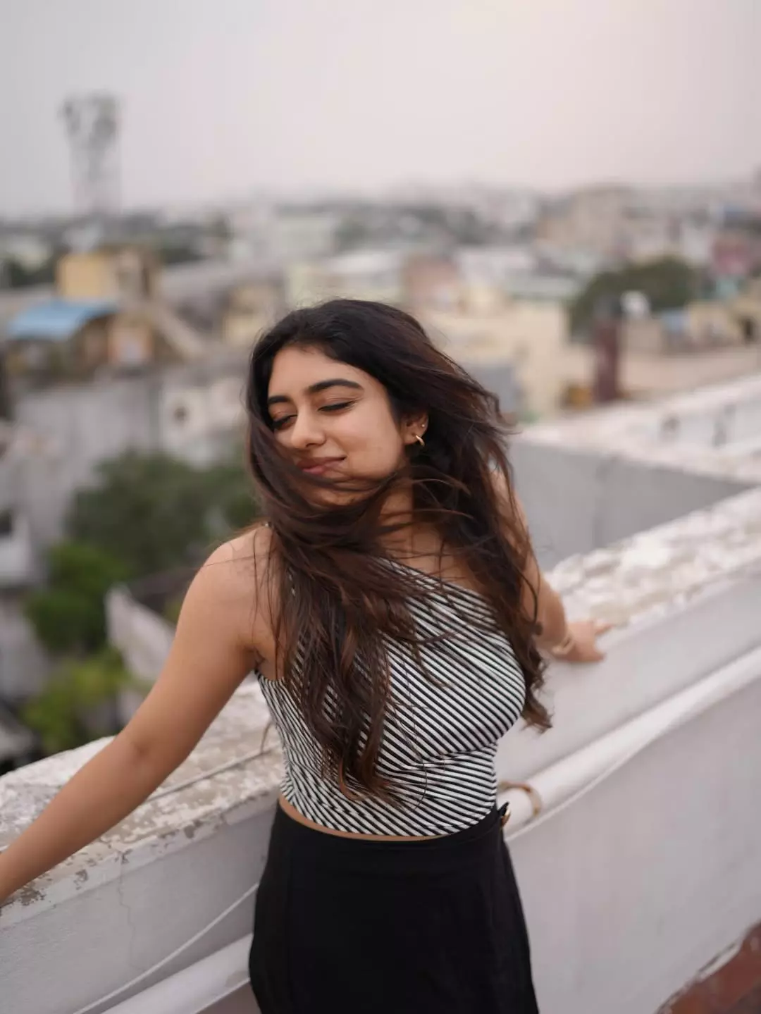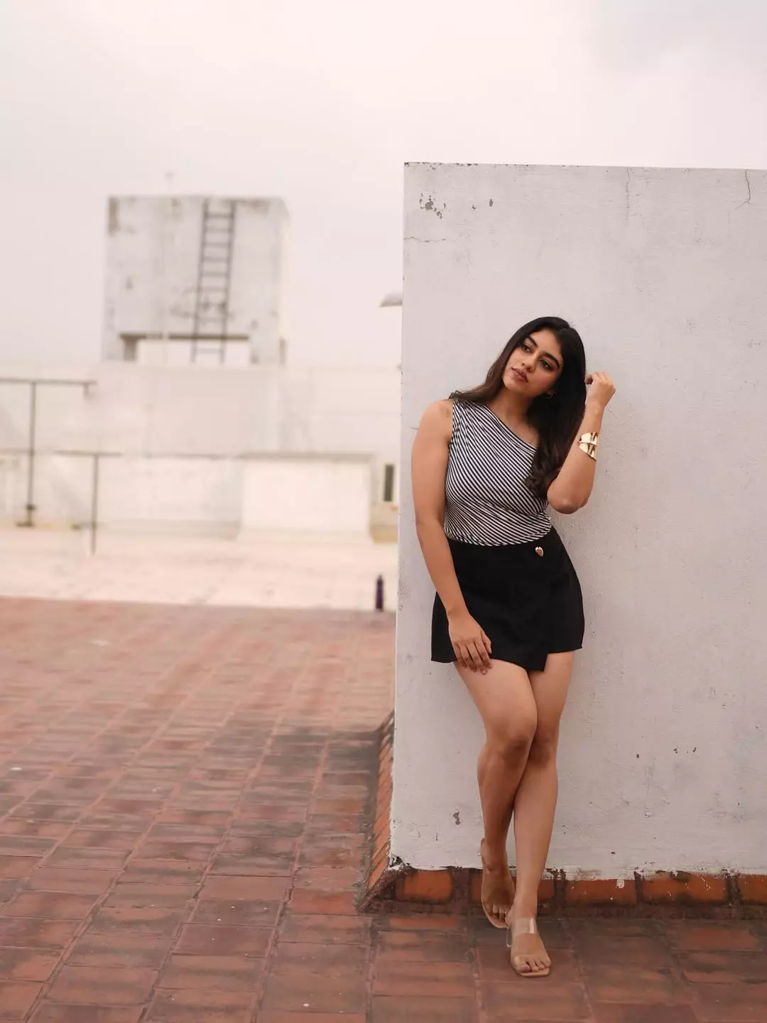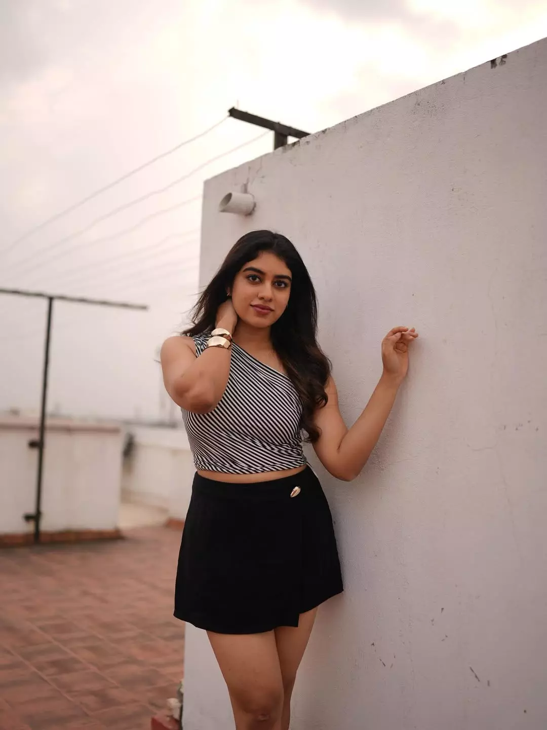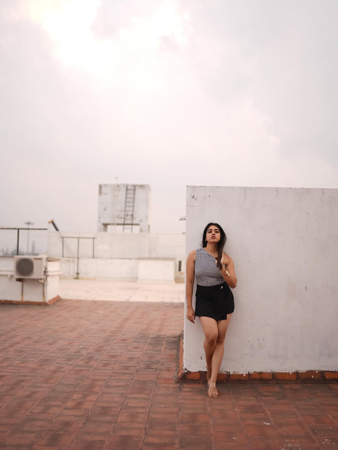 Combining elegance and eye-catching looks, Ramya has slipped into a wrappable short black skirt and a striped short one-shoulder top, flaunting her glamorous looks effortlessly. She coupled the look with a Santa cap to make it Christmas-centric, as she says, “Dear Santa, it's a long story.” Going by the pictures, it looks like she is having a whale of a time on the top floor of her apartment.