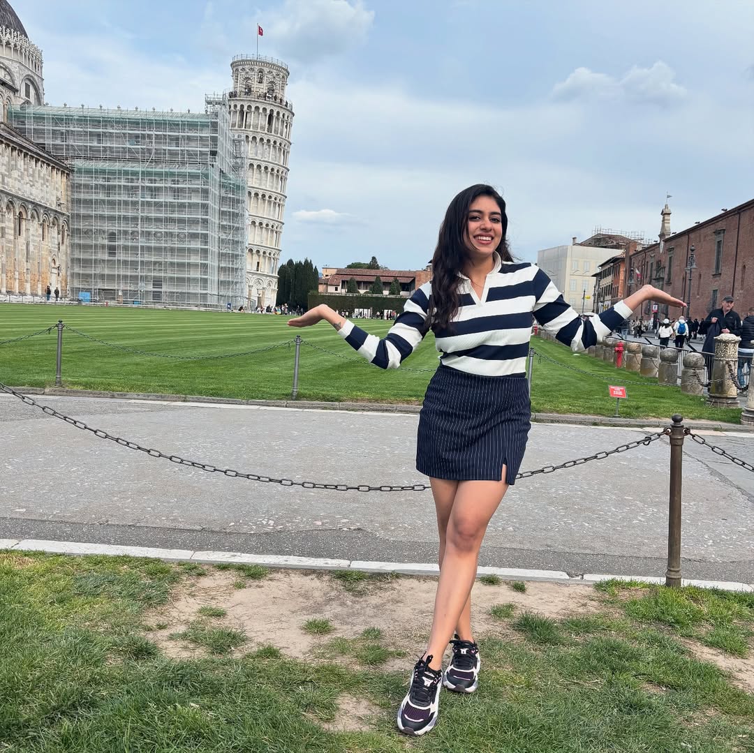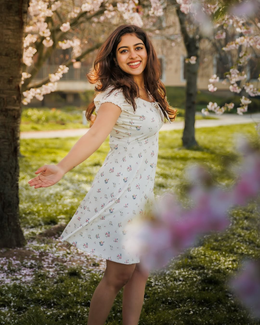 In this radiant close-up captured amid the sparkle of a jewelry store, Ramya Ranganathan exudes effortless elegance in a sleek one-shoulder cobalt-blue dress that hugs her silhouette like a second skin, its asymmetric neckline framing a delicate sapphire pendant necklace that catches the light like a secret promise. With her hair swept into a polished bun, a subtle 'M' tattoo peeking from her arm, and a genuine, dimpled smile lighting her expressive eyes, she fiddles playfully with dangling earrings—embodying youthful charm and quiet confidence. @the.lensational, the image is a perfect snapshot of the 25-year-old Chennai native's magnetic appeal, blending modern poise with timeless grace.