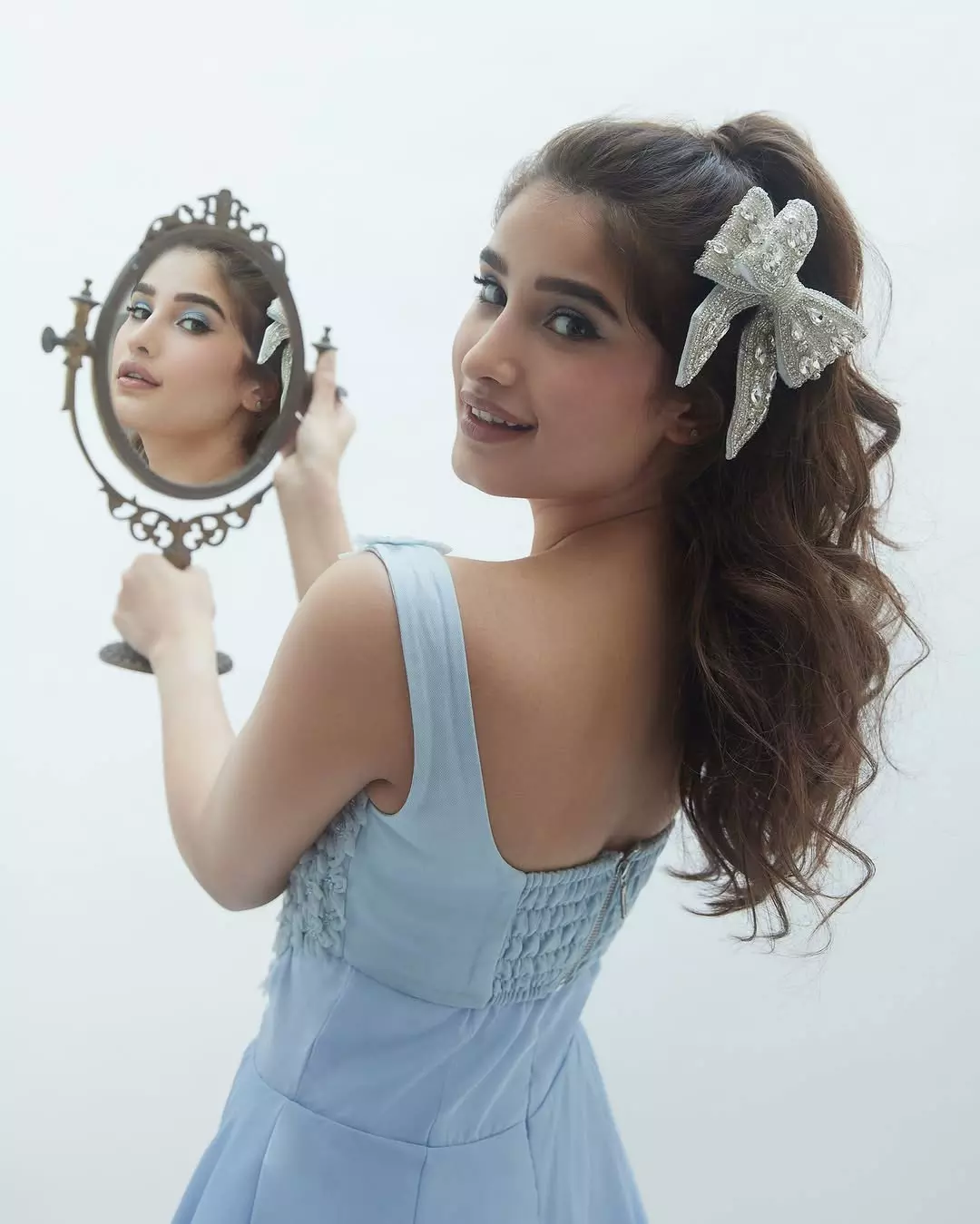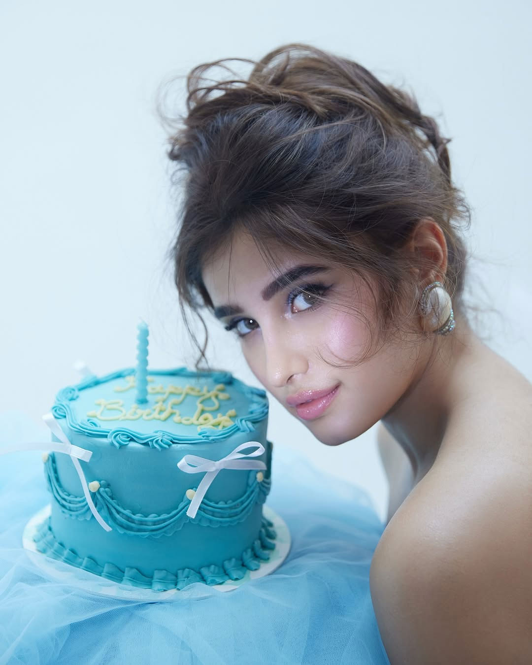 Rasha Thadani recently shared a dreamy photo on Instagram that instantly grabbed attention. She is seen lounging gracefully among vintage lamps, a lace umbrella, fluffy cushions and a bunch of white flowers on soft white sheets. Her caption read, “oh boy💙”