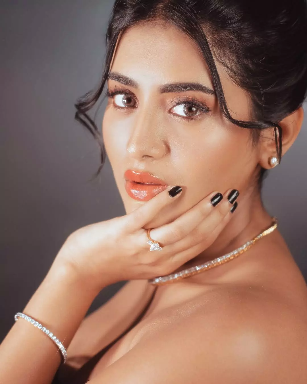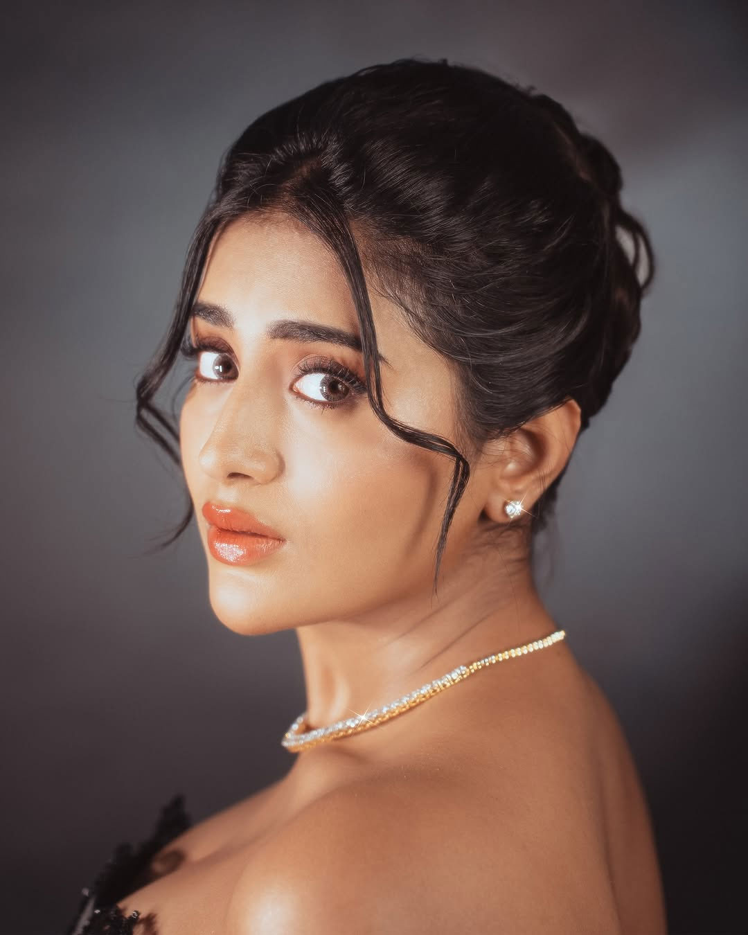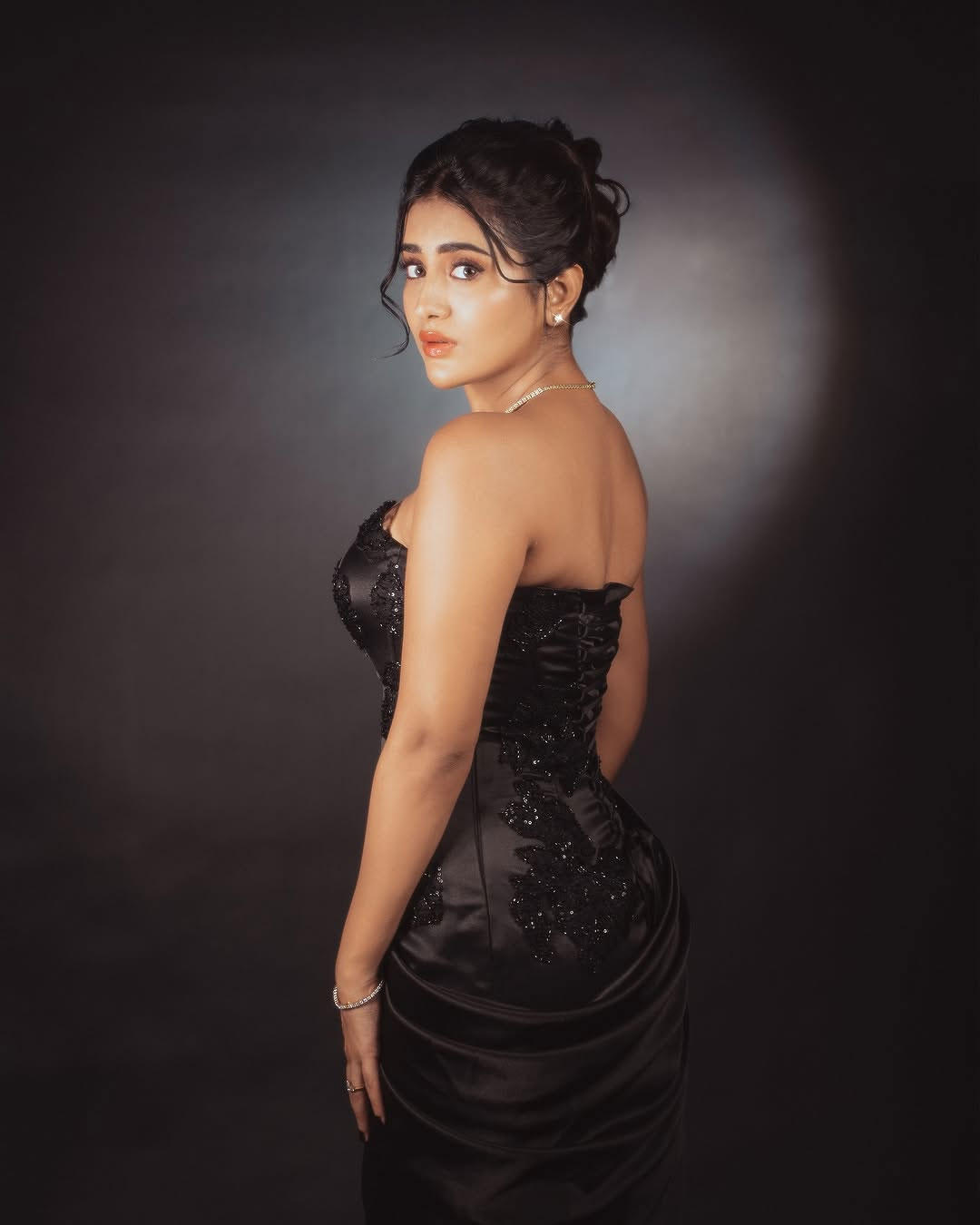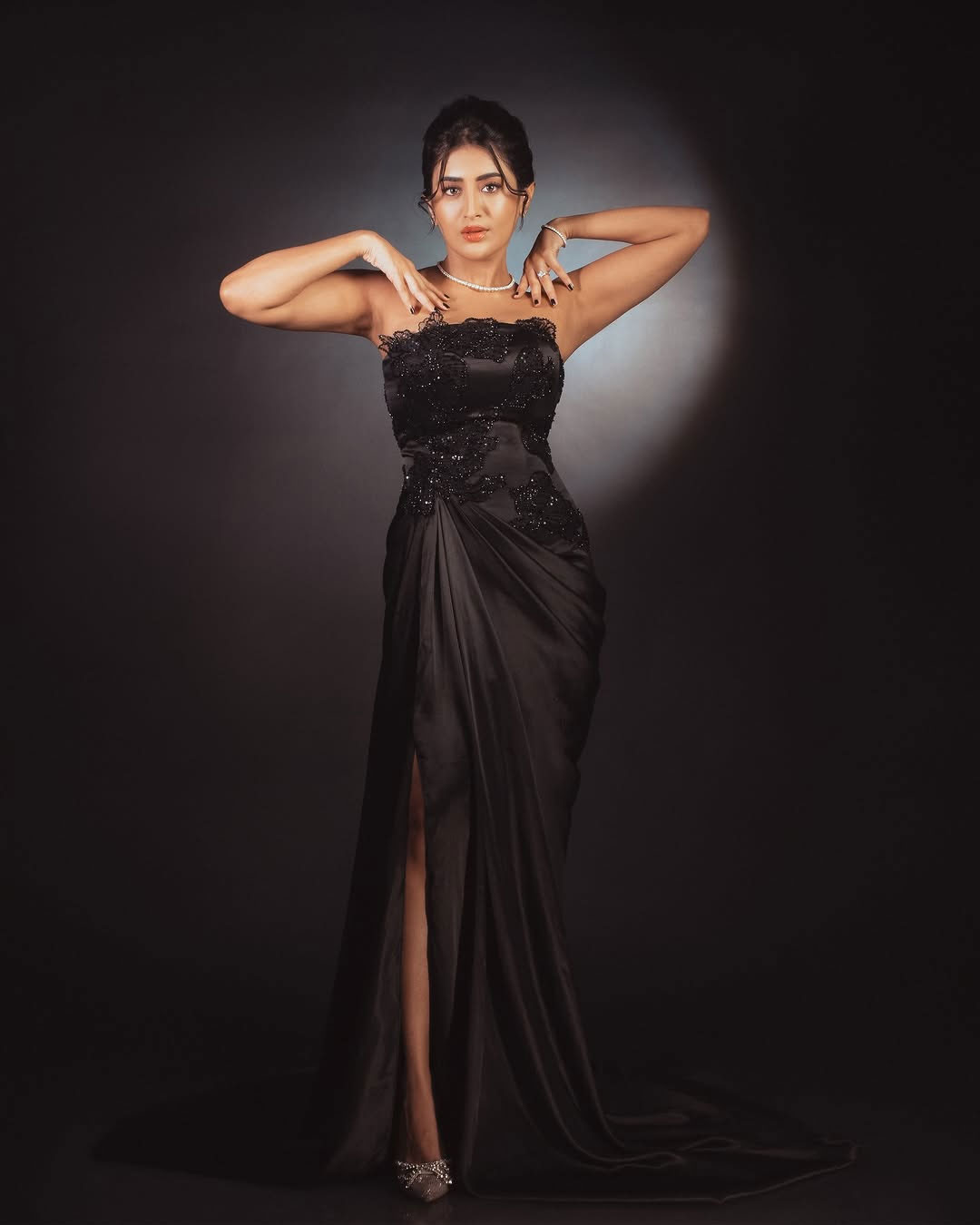 Her styling was done by @soigne-_official-_. She was assisted by @gnan-_u-_. The gown she wore was from @label-_natalia-_livingston. She added a touch of sparkle with jewellery from @aykaa.global. Her makeup was handled by @makeupbysidraayman. Her hairstyle was created by @hairby.aneesa. The pictures were captured by @tdf.studioz.