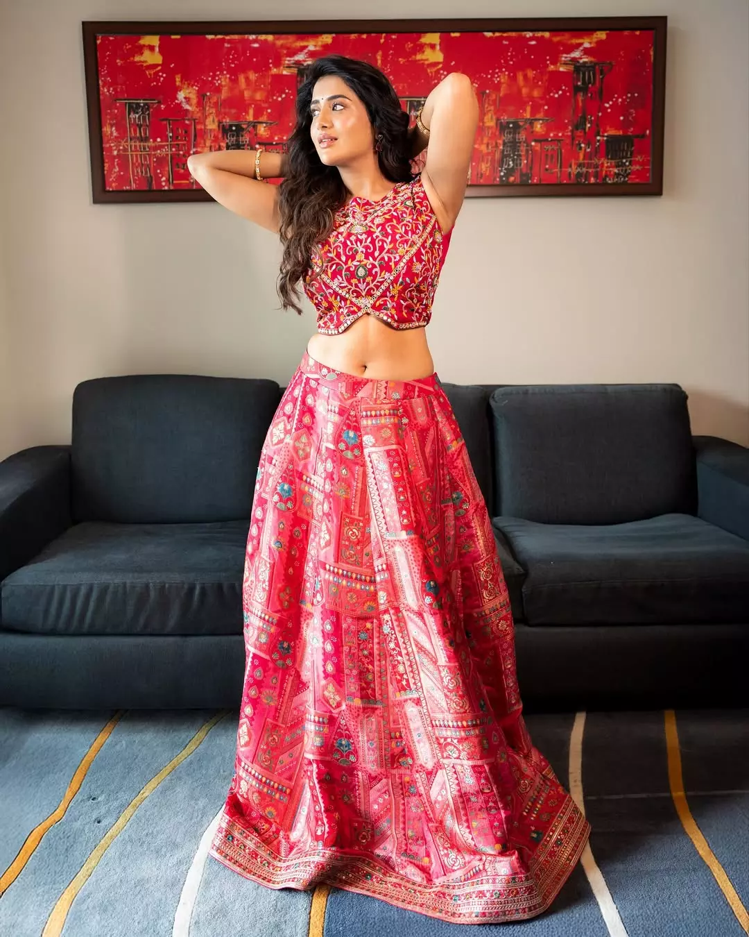 Rashi Singh is painting the town red – literally – and we’re here for every fiery second of it! Draped in a breathtaking pink-red lehenga set by @labelvishwa with intricate patchwork and vibrant embroidery, she’s giving pure festive royalty vibes.