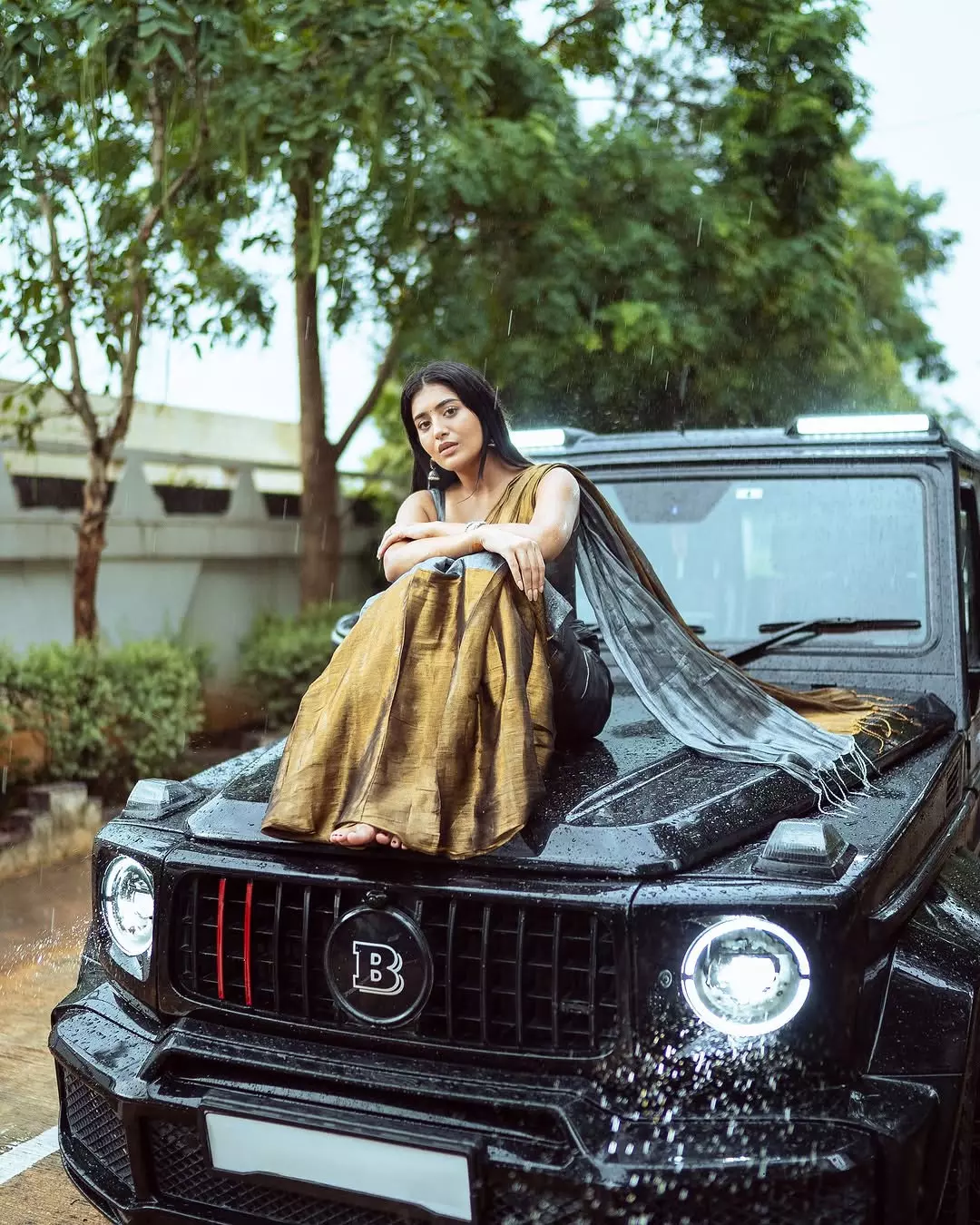 Rashi Singh shared a striking photo on Instagram that quickly caught attention. She is seen sitting on the hood of a black car in the rain. She wore a grey and gold saree styled in a modern way. The background with trees and raindrops created a moody vibe.