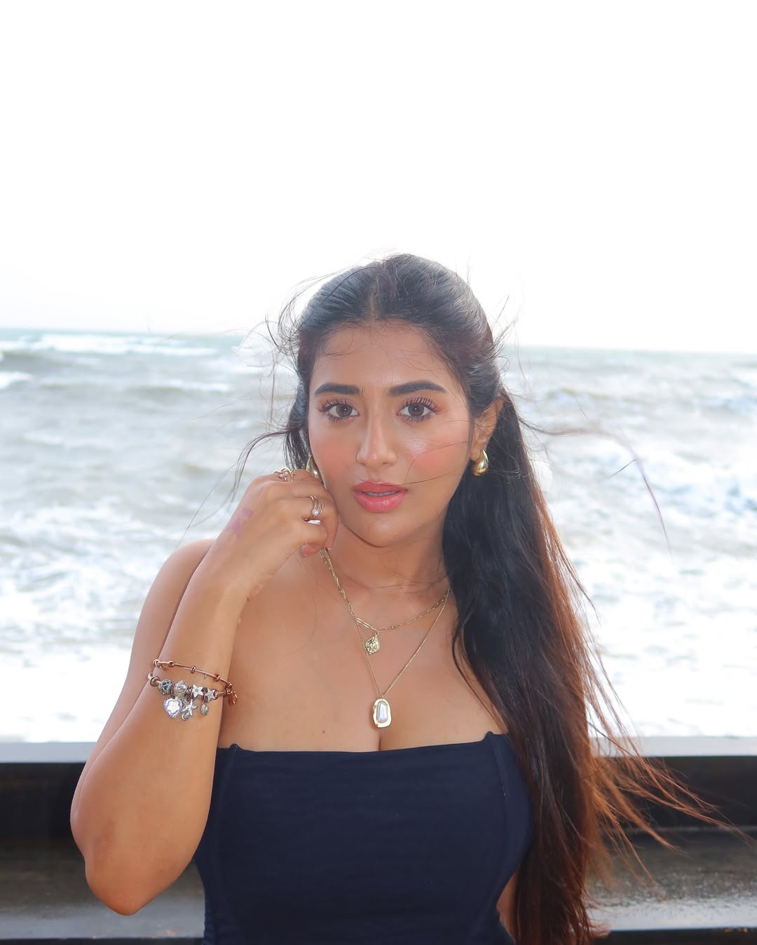 The minimal accessories — delicate hoop earrings and subtle bracelets — complement her look without overpowering it. The picturesque backdrop of endless waters and distant hills enhances the dreamy vibe of the frame. It’s not just a photo; it’s a mood. Rashi’s glowing skin, natural makeup, and poised body language elevate the aesthetic, making it a true summer statement.