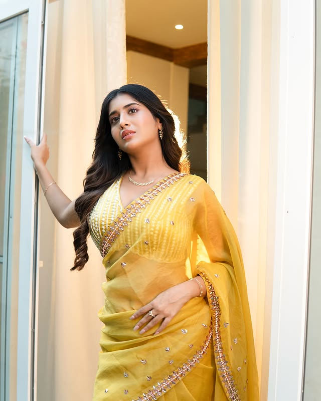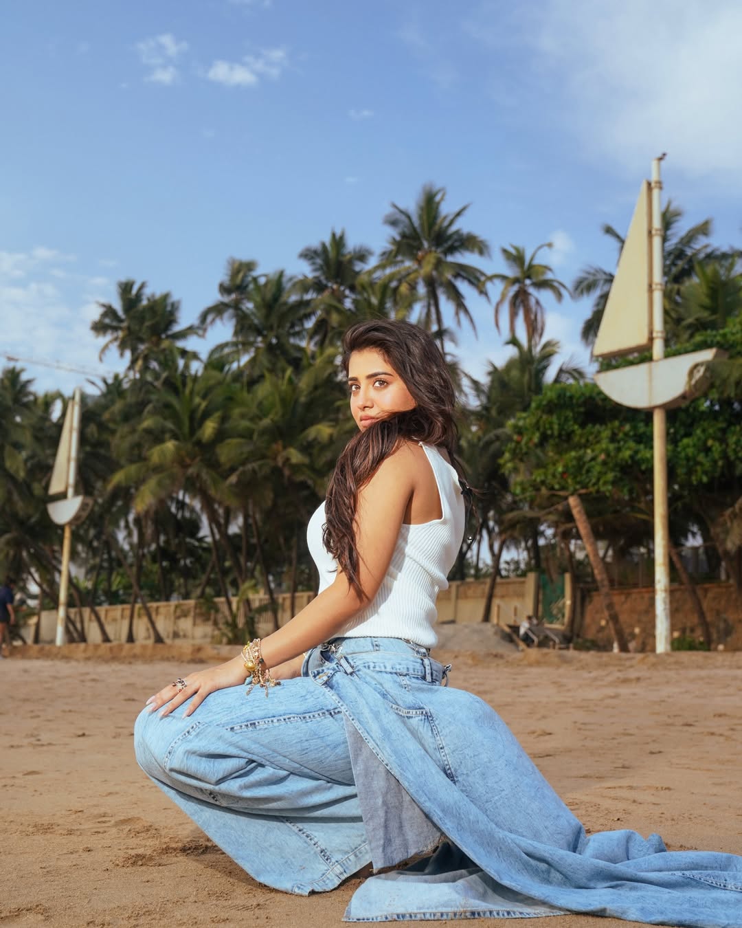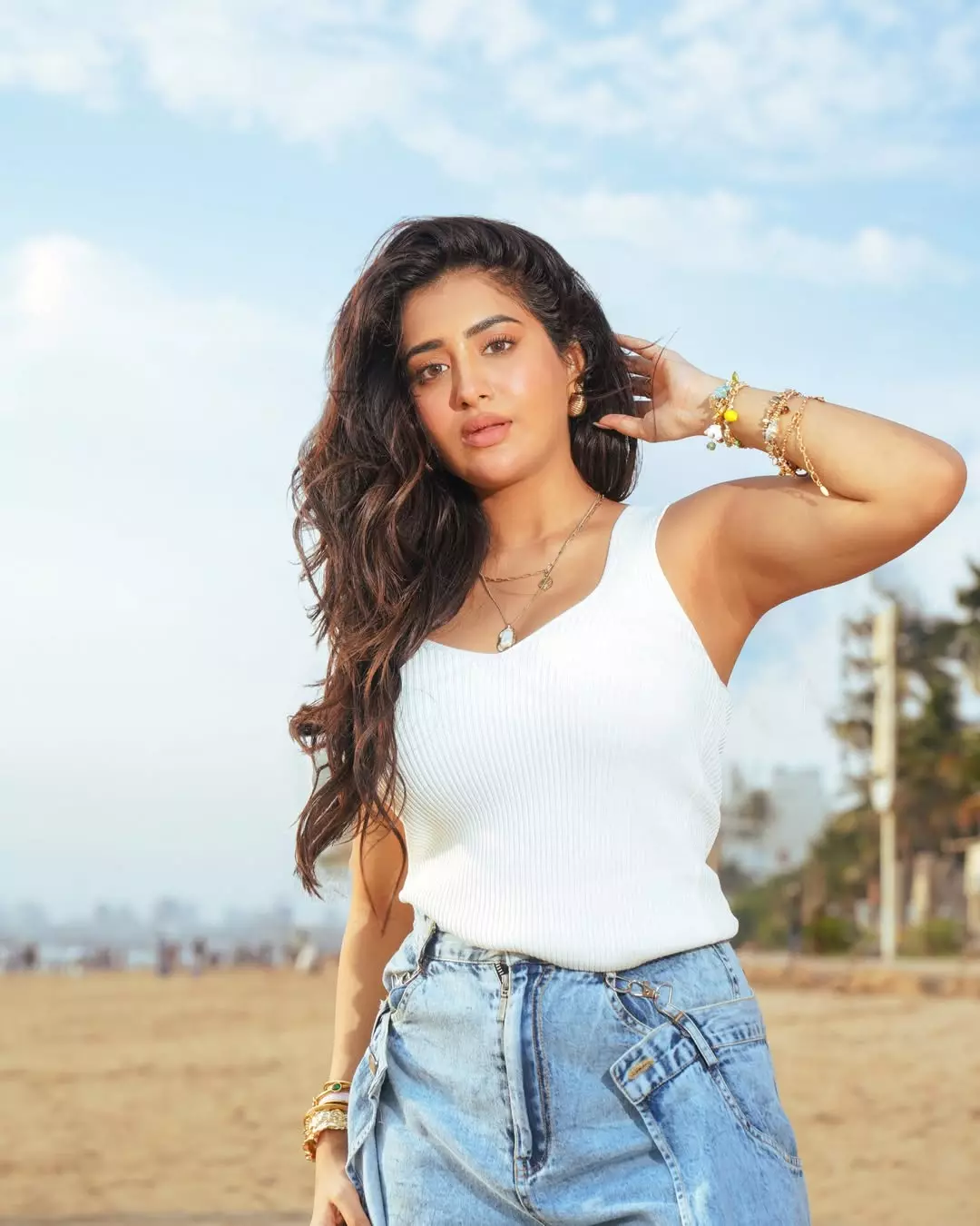 Rashi Singh exudes effortless charm and confidence in this vibrant beachside photograph. With her flowing dark hair cascading over one shoulder, a crisp white ribbed tank top paired with high-waisted denim, and statement gold jewellery, she brings a fresh, summery vibe that perfectly captures her youthful energy and style.