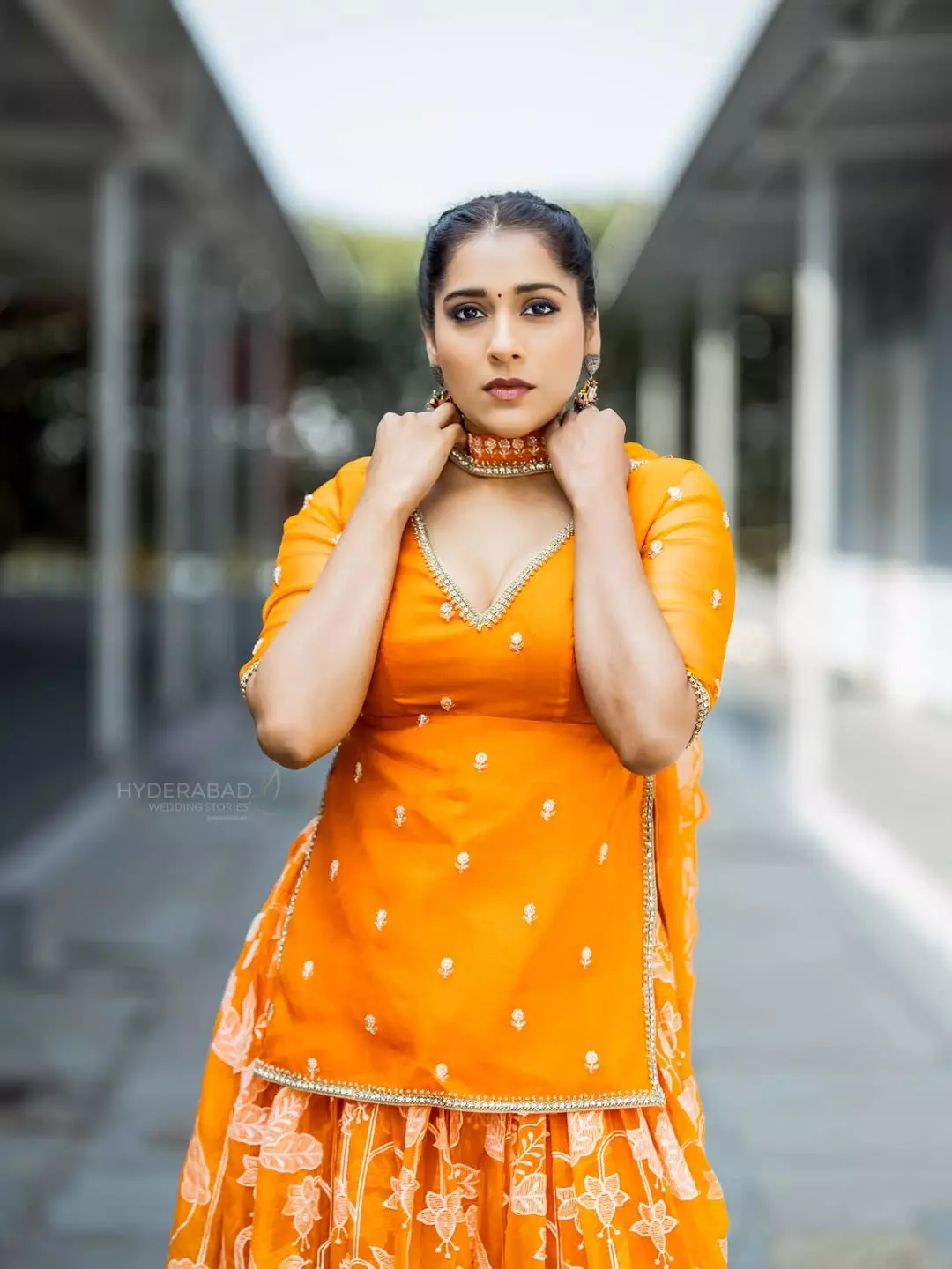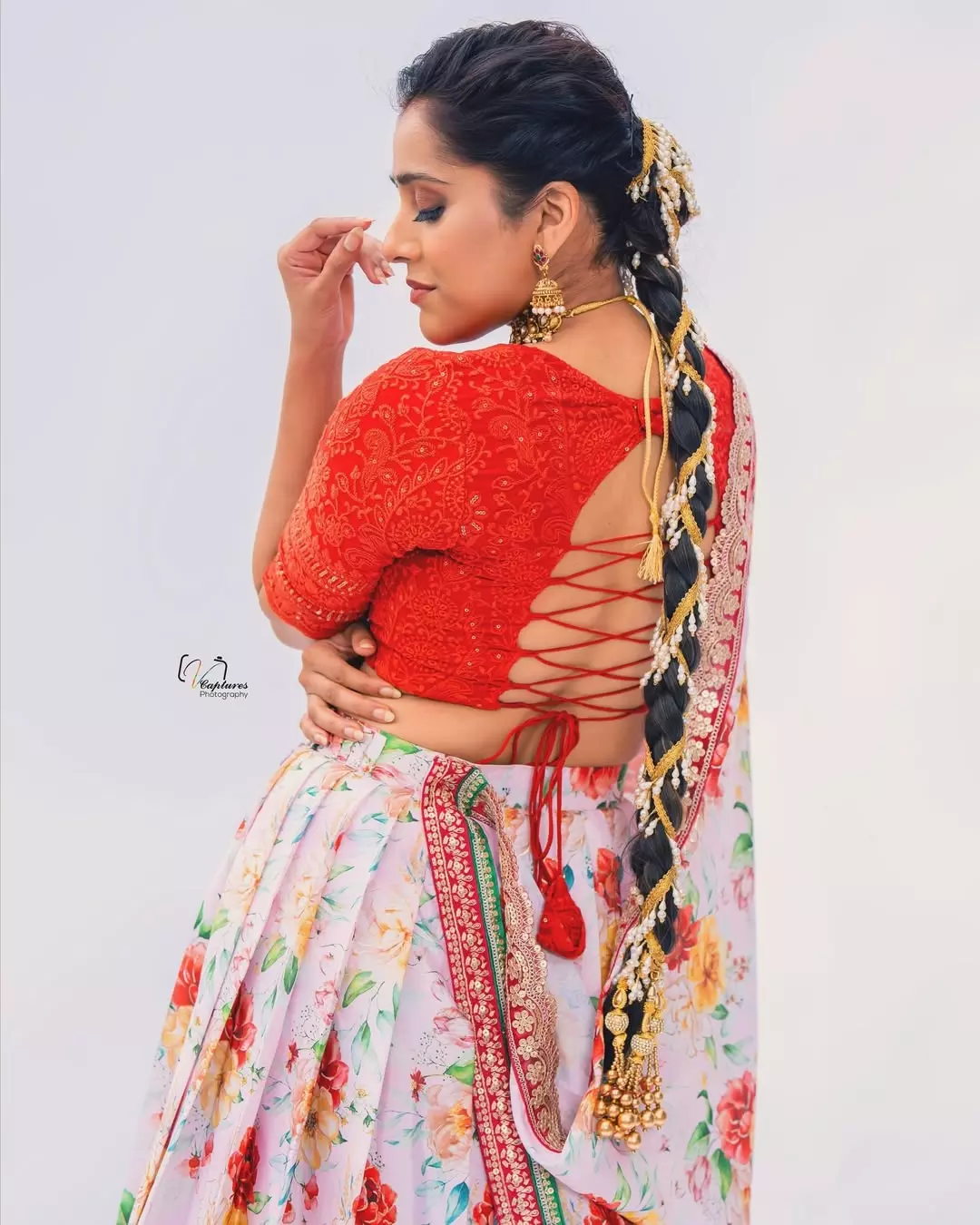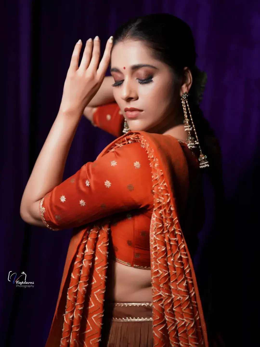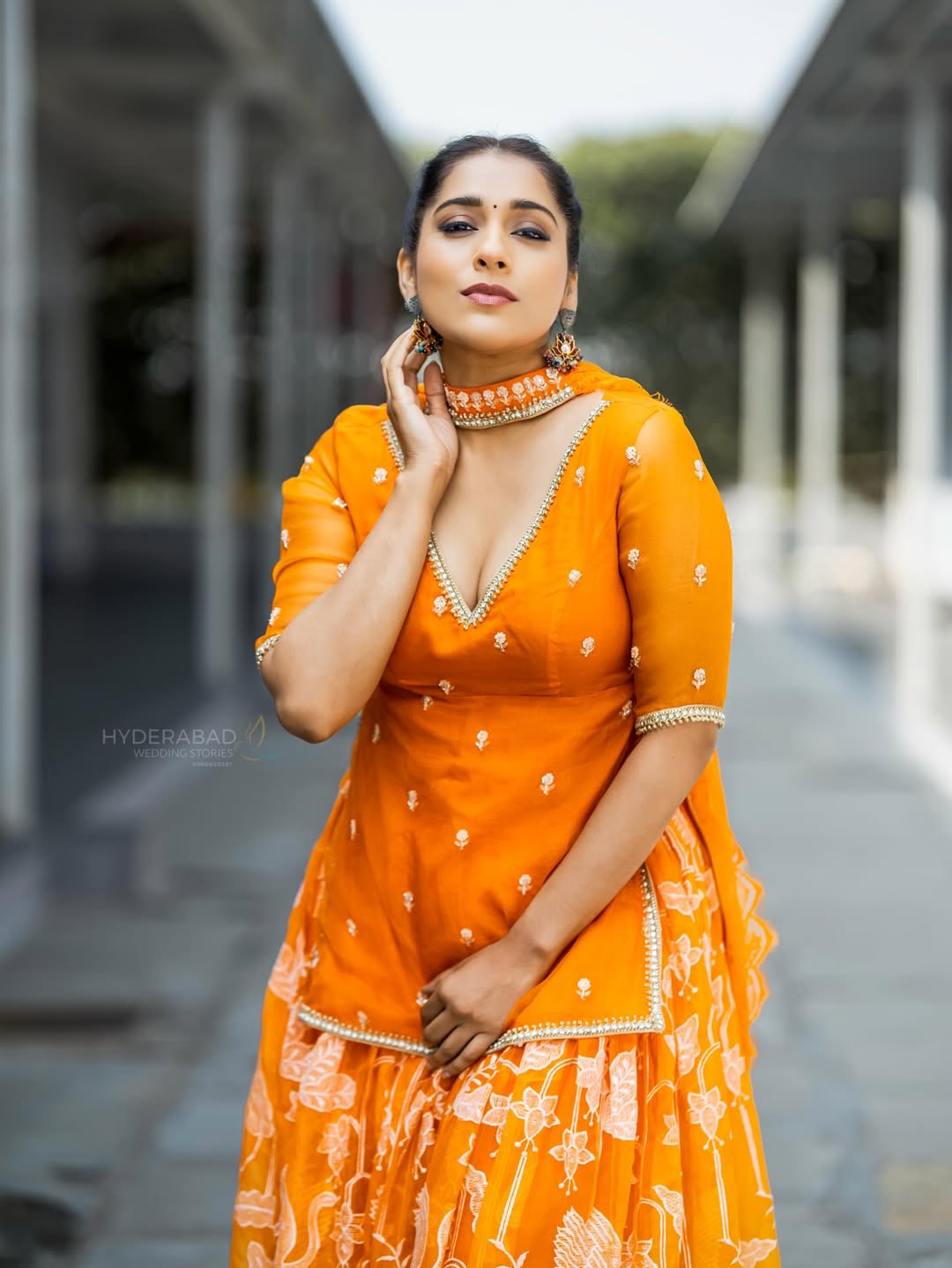 Telugu actress and popular TV host Rashmi Gautam stuns in her latest photoshoot, donning a breathtaking orange traditional outfit from @varahi_couture.