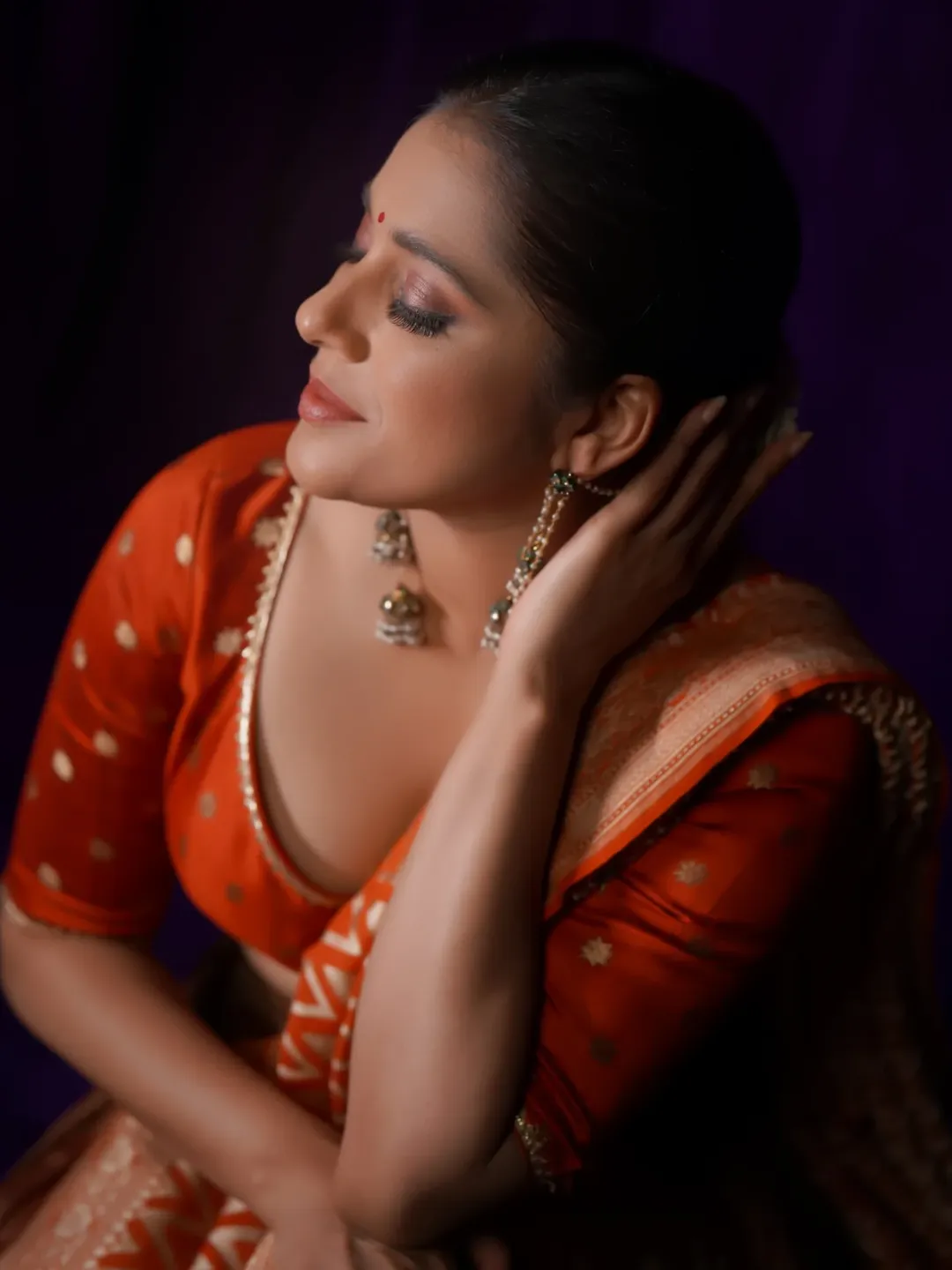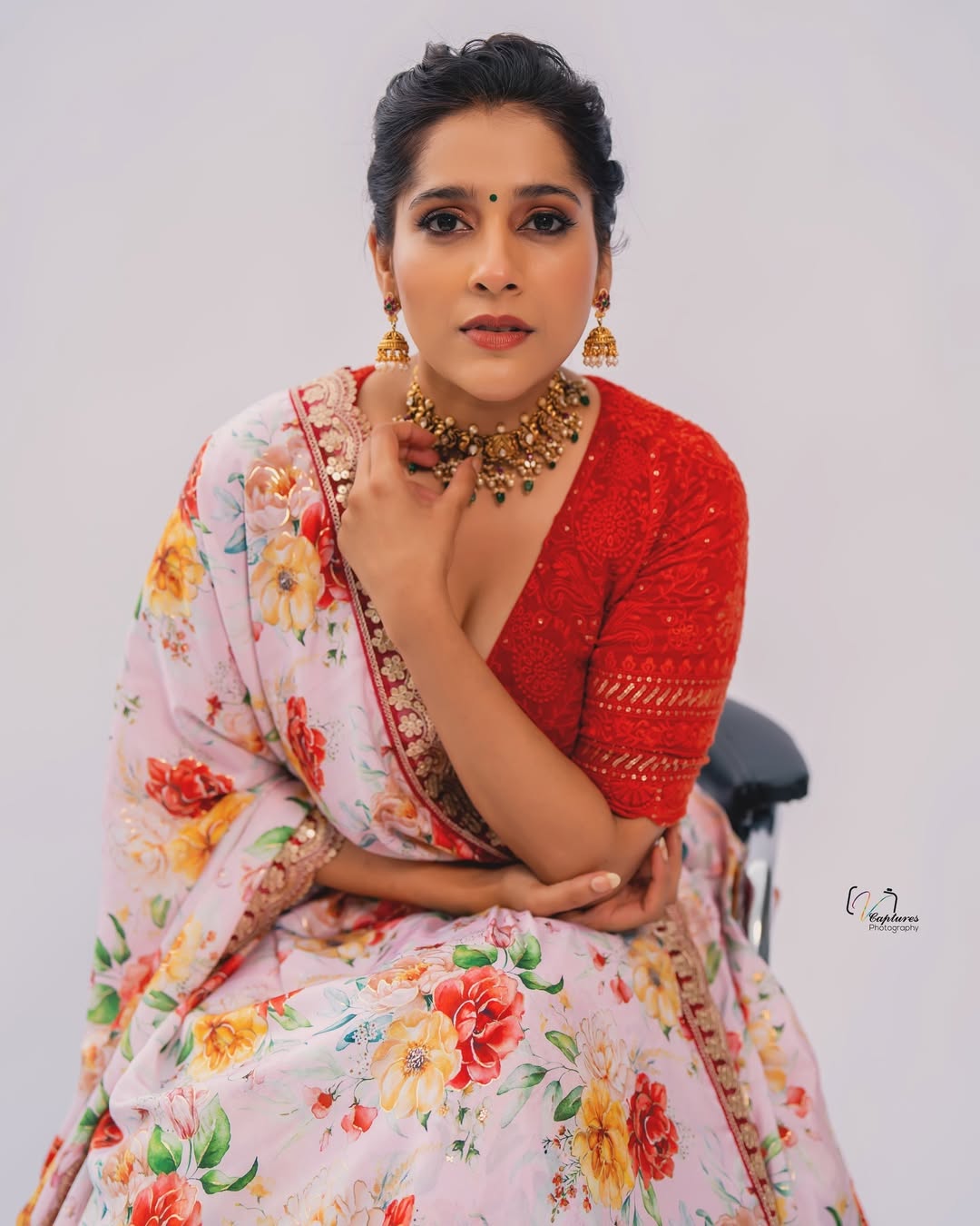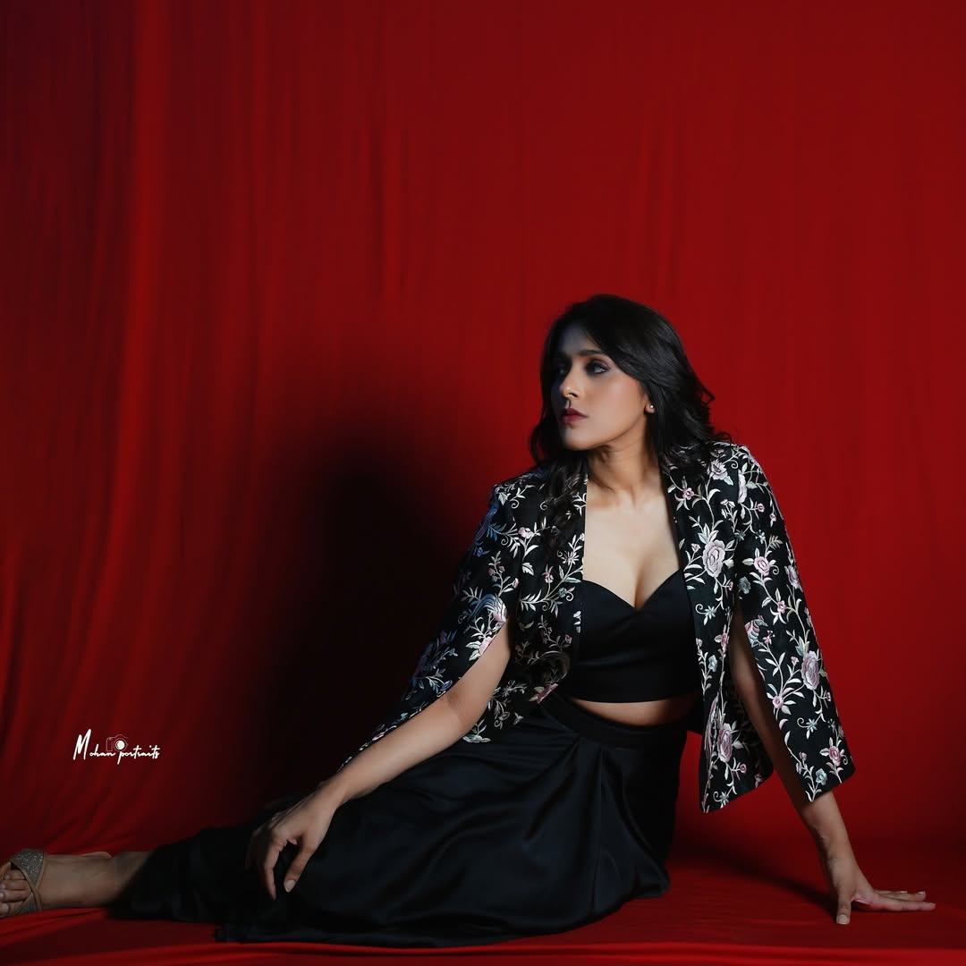 Telugu actress and popular TV host Rashmi Gautam stuns in her latest photoshoot, donning a breathtaking orange traditional outfit from @varahi_couture.