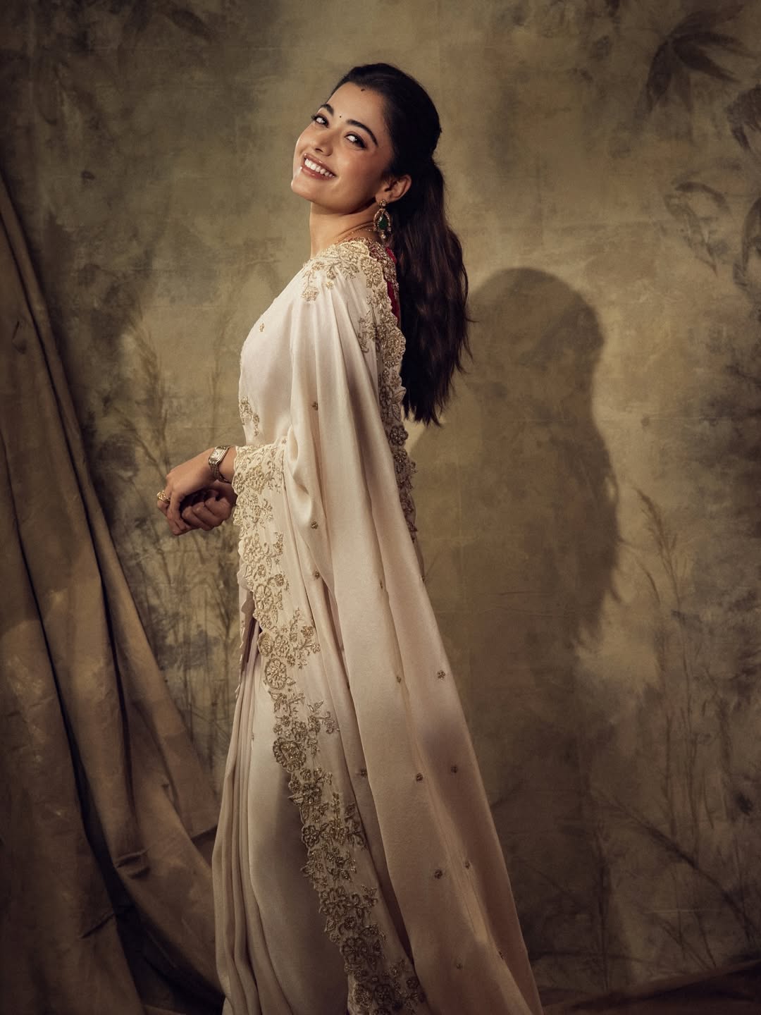 By: Tupaki Gallery Desk | 27 April 2026 11:10 PM ISTNational Crush Rashmika Mandanna is glowing in this stunning behind-the-scenes or promotional still from a recent photoshoot. Draped in a graceful off-white anarkali suit with delicate lace and embroidery work, the actress flashes her signature bright smile while looking over her shoulder. The warm, artistic backdrop adds a timeless charm to the image.