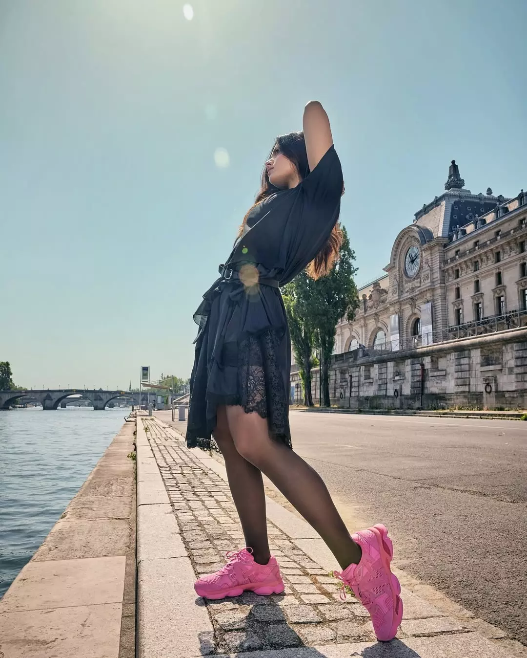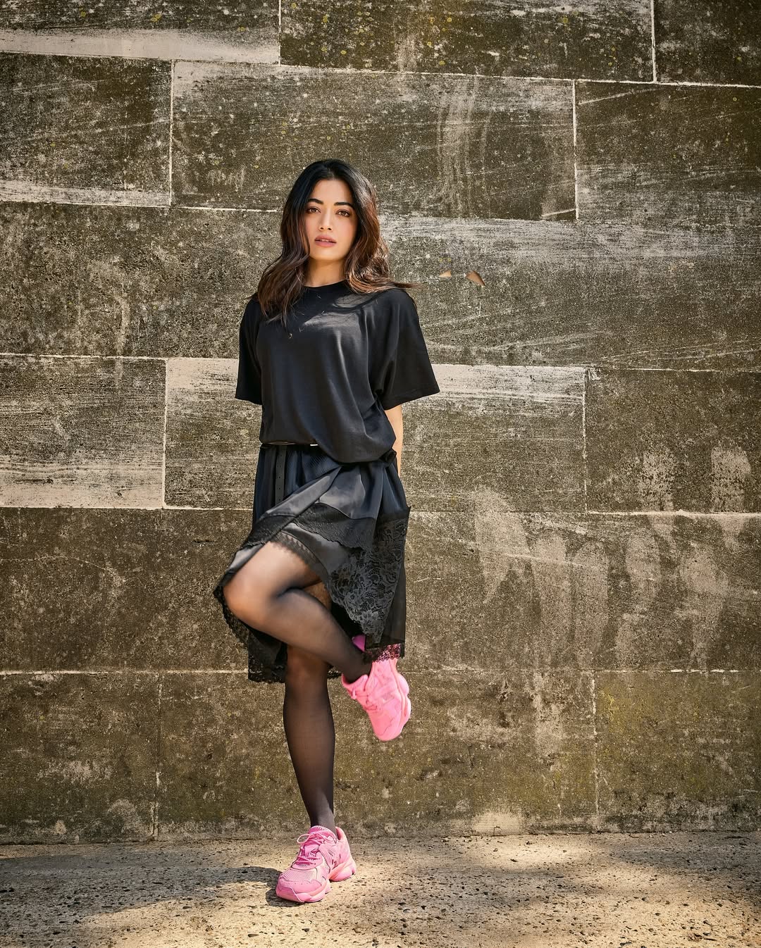 Rashmika Mandanna shared new photos from her latest brand shoot. She wore a casual black dress and posed near a peaceful riverside. She paired the look with bright pink TIGRUN shoes. These shoes are from the ULTI RS Series by Onitsuka Tiger.