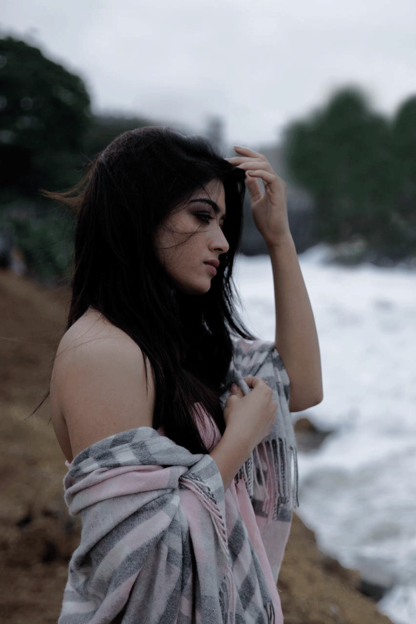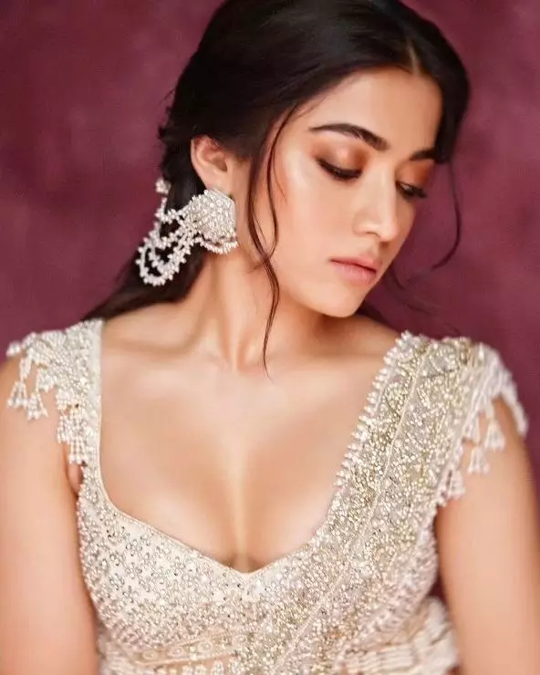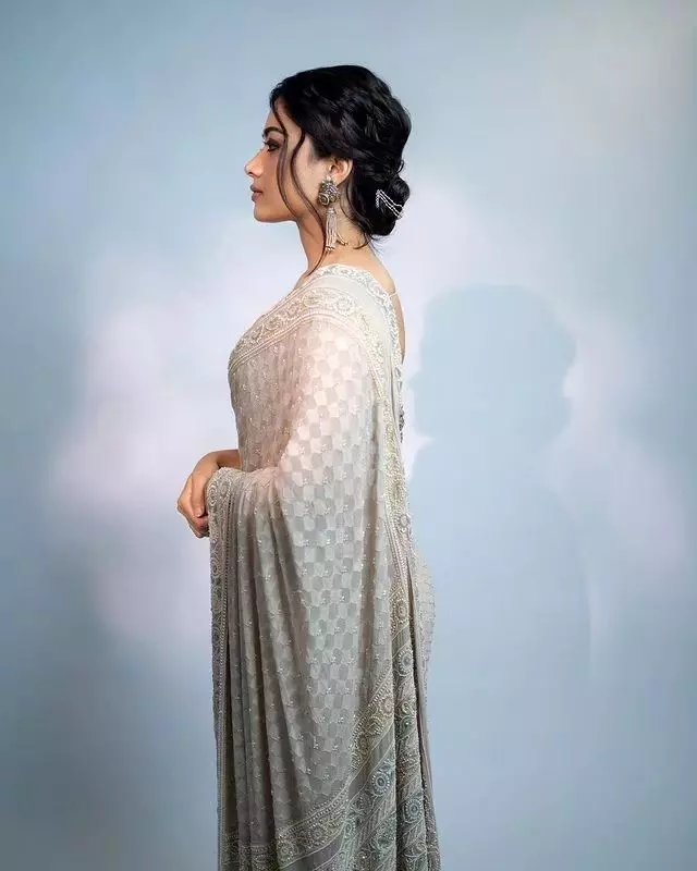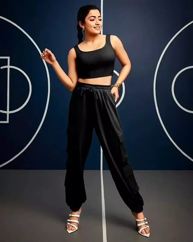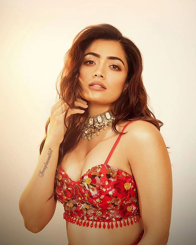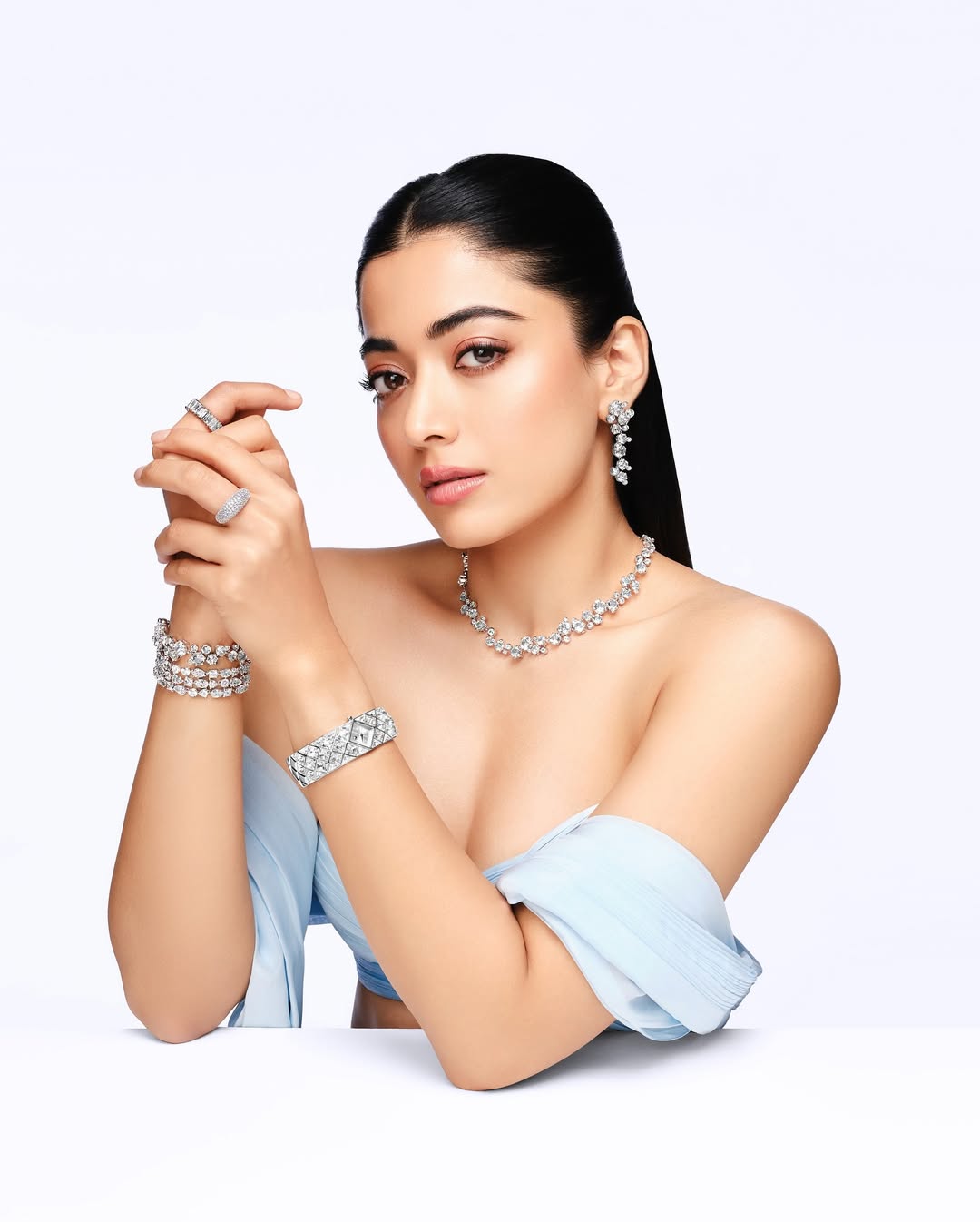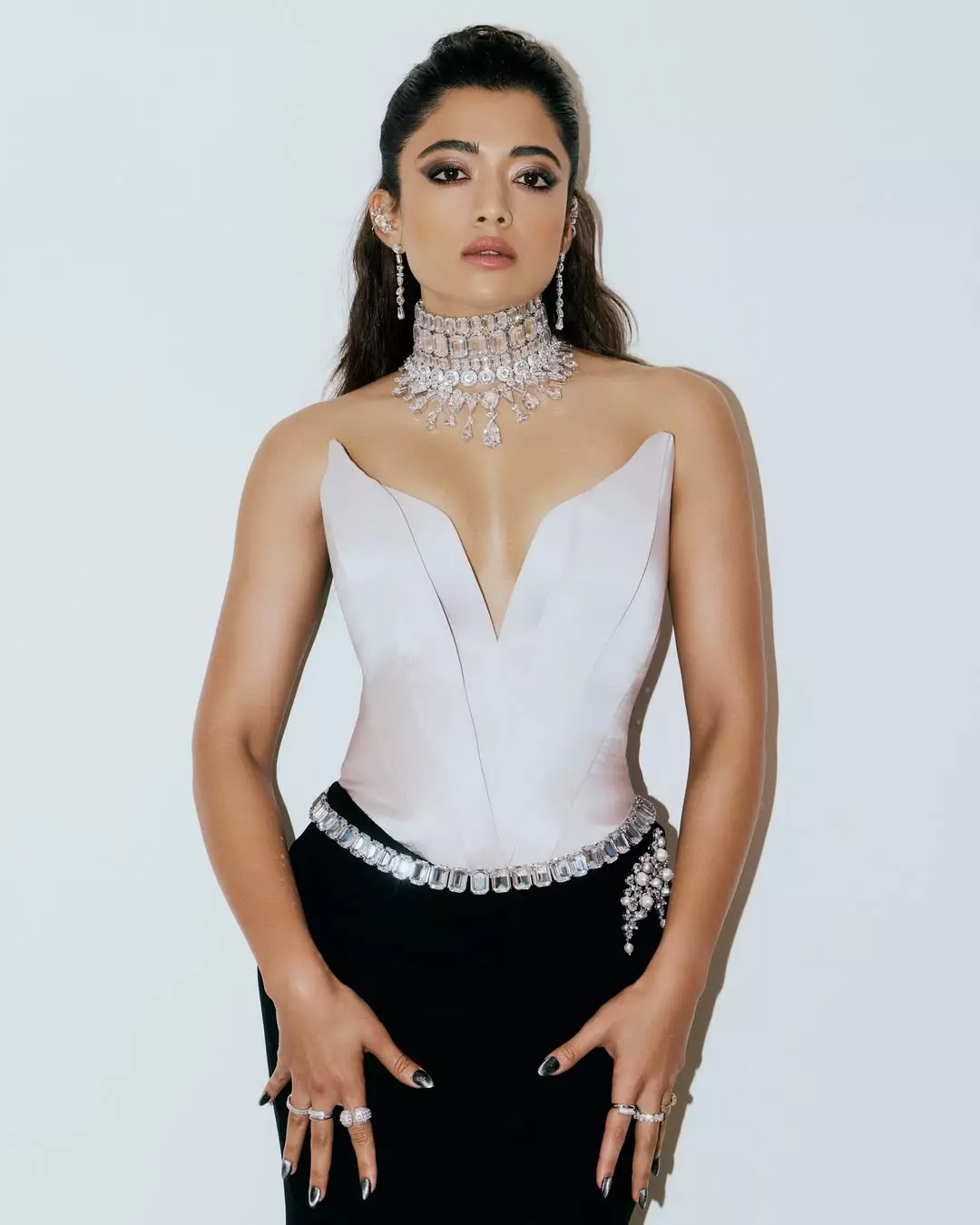 Rashmika is seen wearing a sleek white structured top paired with a black skirt that has crystals around the waist. She styled with striking diamond jewellery from Swarovski. The heavy crystal choker, drop earrings and matching ear cuff gave her a timeless yet modern look.
