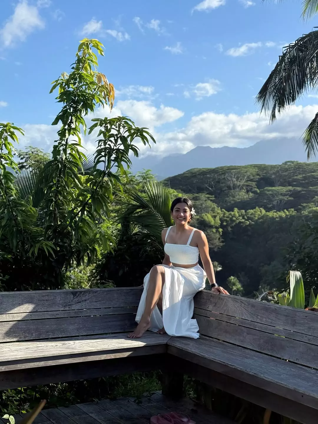 By: Priya Chowdhary Nuthalapti | 9 Dec 2025 9:09 AM ISTRashmika Mandanna once again touched hearts with her latest peaceful travel photo. In the picture, she is seen sitting calmly on a wooden bench surrounded by green trees, hills and a bright blue sky. She is dressed in a simple white two-piece dress and looks relaxed and happy.