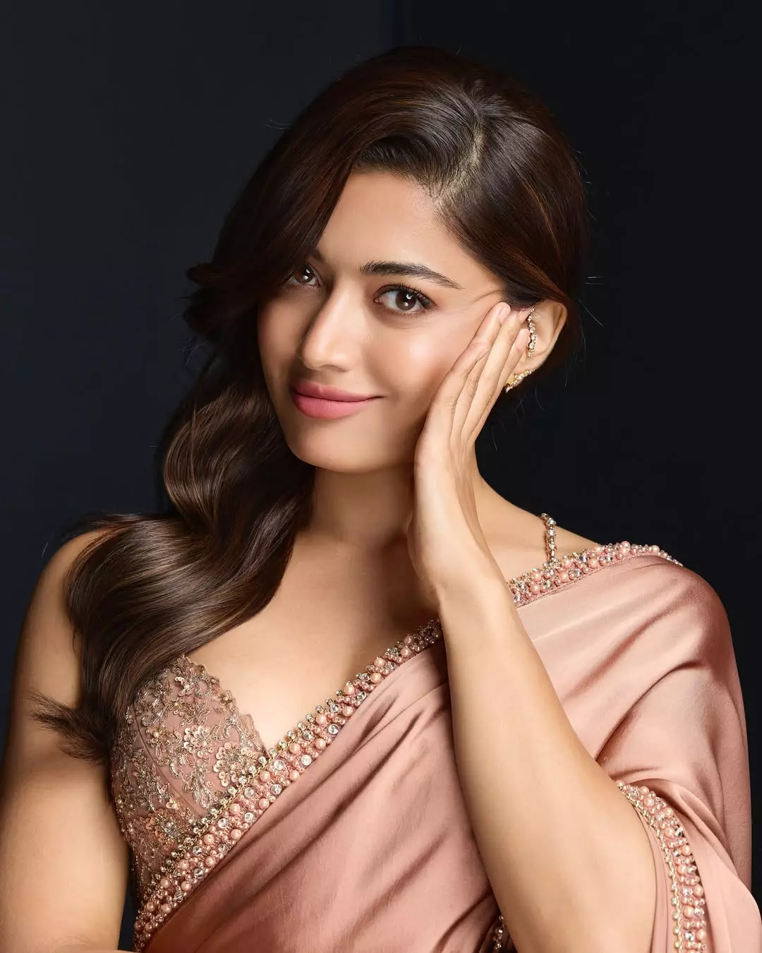 Rashmika looked adorable in a bronze silk saree designed by Tarun Tahiliani. Rashmika’s appearance at the awards show her strong fashion sense. Her makeup artist Mehak Oberoi gave her a glowing base with soft eyes, while Marce Pedrozo styled her hair into shiny curls falling naturally over one shoulder.