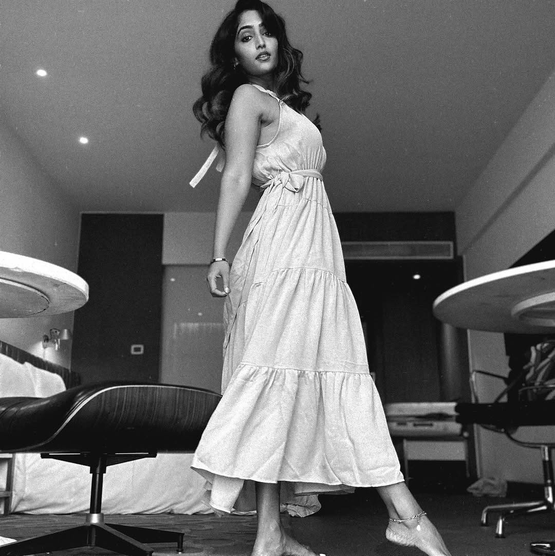 Now, Reba has shared a fresh set of pictures that has left fans impressed. She is seen wearing a light halter-neck dress with a tiered skirt. The photos are in black and white, which gives them a calm, classic feel. Her sharp features and gentle smile stand out naturally without the need for any heavy styling.