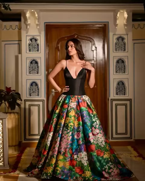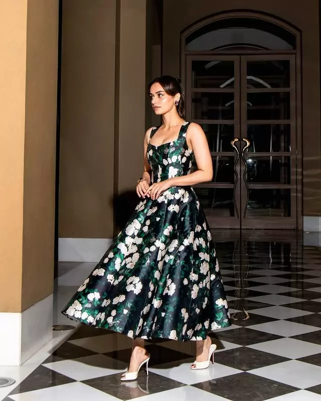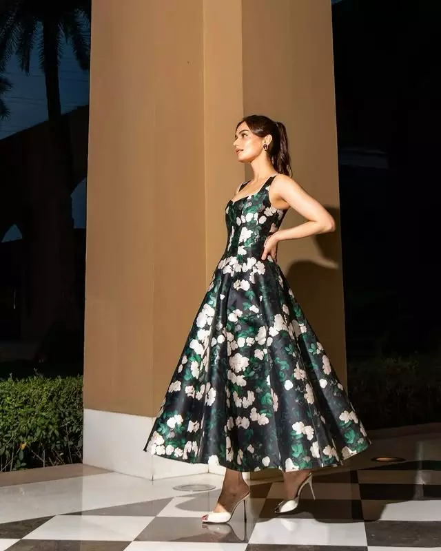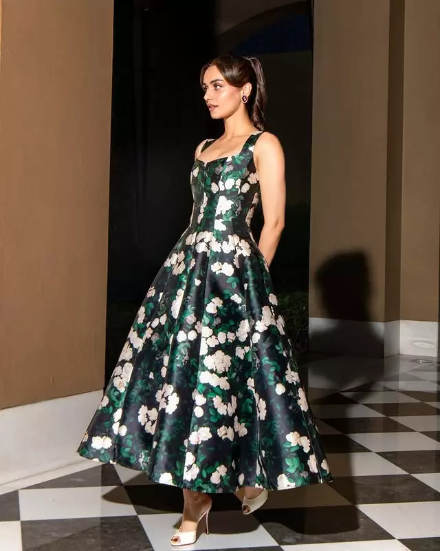 Manushi Chhillar never fails to captivate with her royal grace and sophisticated fashion choices. In this picture, she exudes timeless elegance in a stunning floral gown that combines a classic silhouette with modern charm.