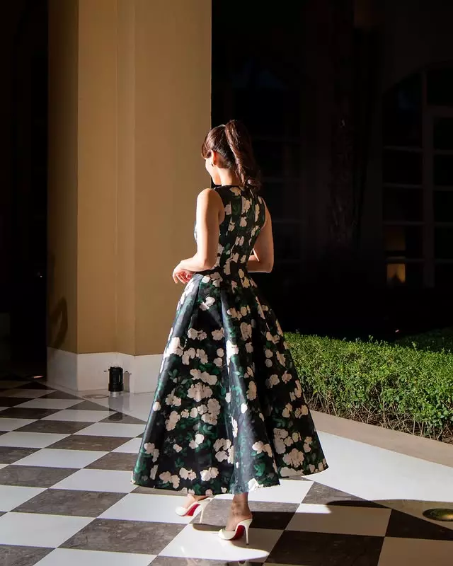 The rich dark base adorned with white blossoms enhances her regal aura, while her simple yet chic hairstyle and statement earrings complete the look perfectly.