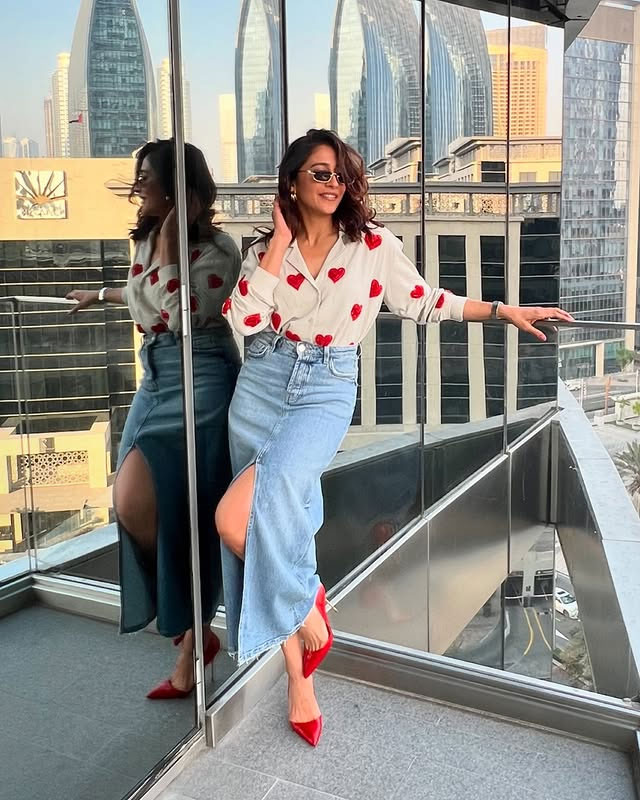 Her look is a masterclass in styling: the vibrant red dress paired with matching heels exudes playful elegance, while flawless makeup by @jenimakeupartist07 and a chic hairstyle by @hairbydrishya add the perfect finishing touches. Every frame, beautifully captured by @v_capturesphotography, highlights her ability to make a statement effortlessly. Accessories from @pranathivarma.k and a contemporary outfit from @pankhclothing bring the entire look together, celebrating classic Valentine’s Day colors with a modern twist.