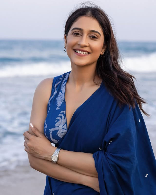 Regena Cassandrra stuns in this elegant navy blue saree, radiating grace and confidence. With one hand gracefully raised and the other on her hip, the actress looks poised and glamorous, her traditional attire adorned with intricate embellishments and dangling accessories.