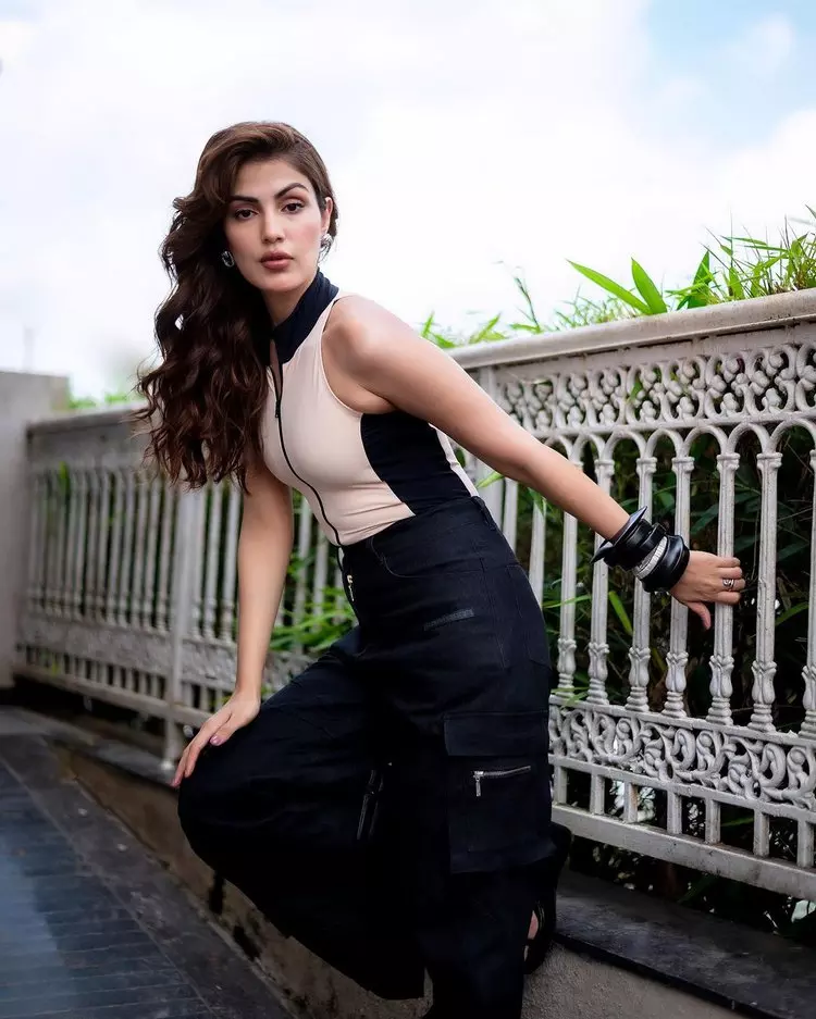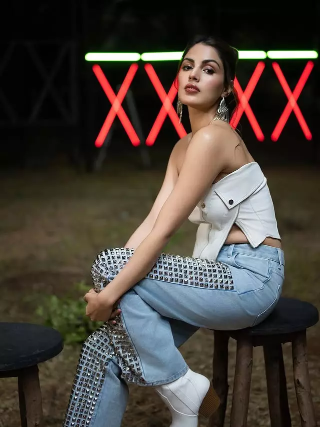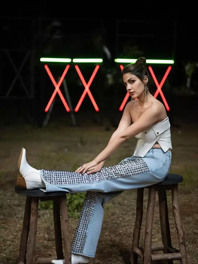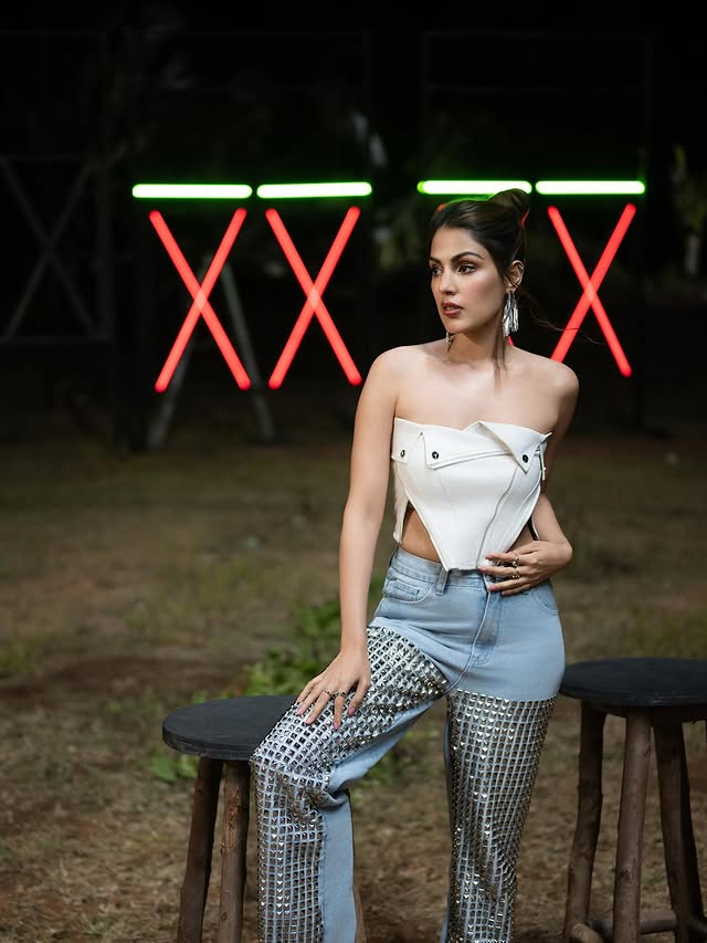 In this picture, Rhea exudes confidence in a striking, off-shoulder white bustier top paired with high-waisted blue jeans. The edgy design, complete with button and zip details, highlights her bold yet chic fashion sense.