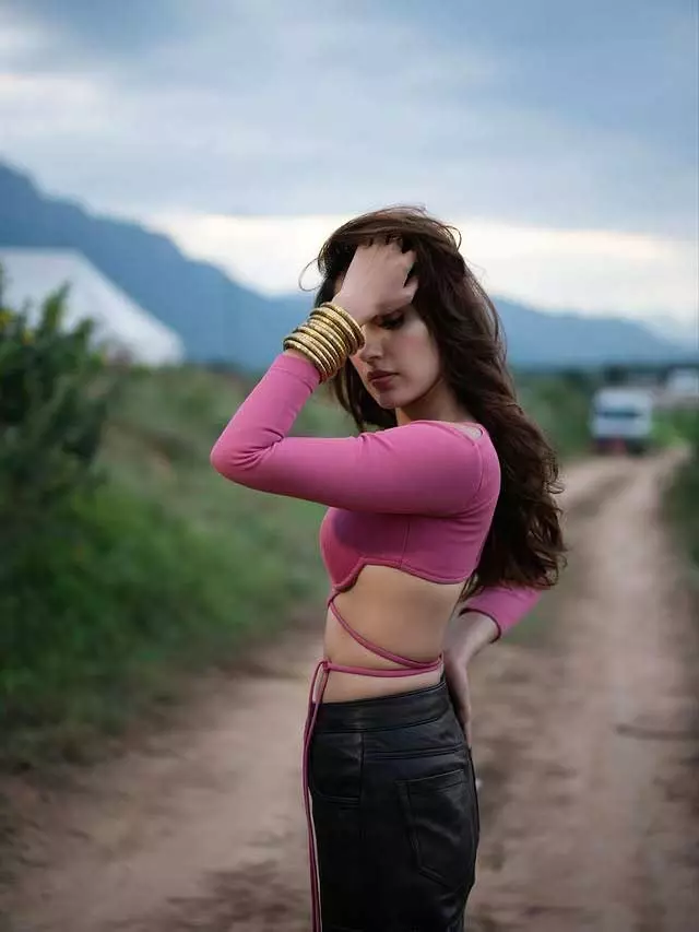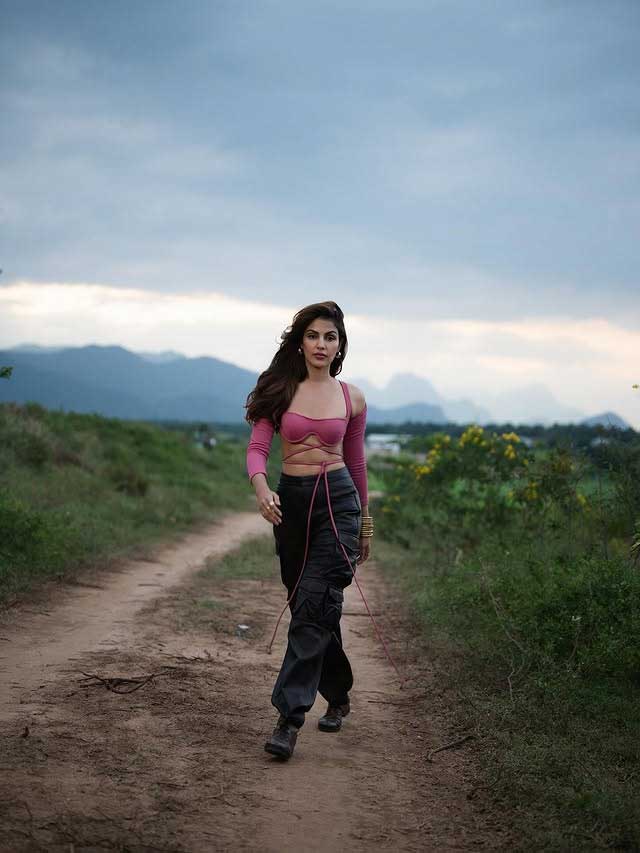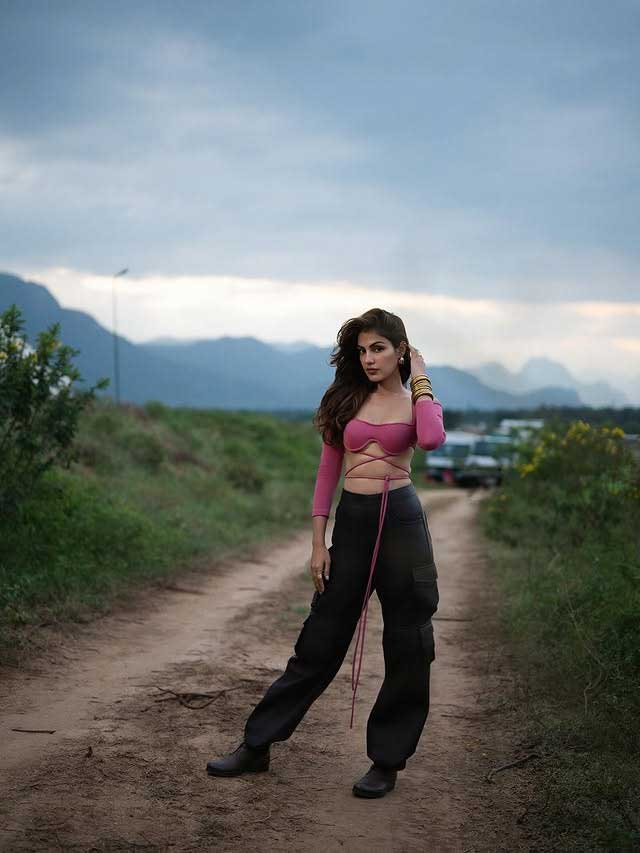 Rhea Chakraborty shared a striking new photo on Instagram that has her followers talking. Dressed in a trendy wrap-style top and a sleek black skirt, she posed confidently against a scenic backdrop of mountains and sky. Her caption read: