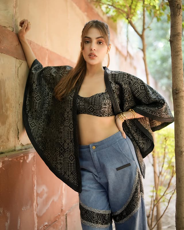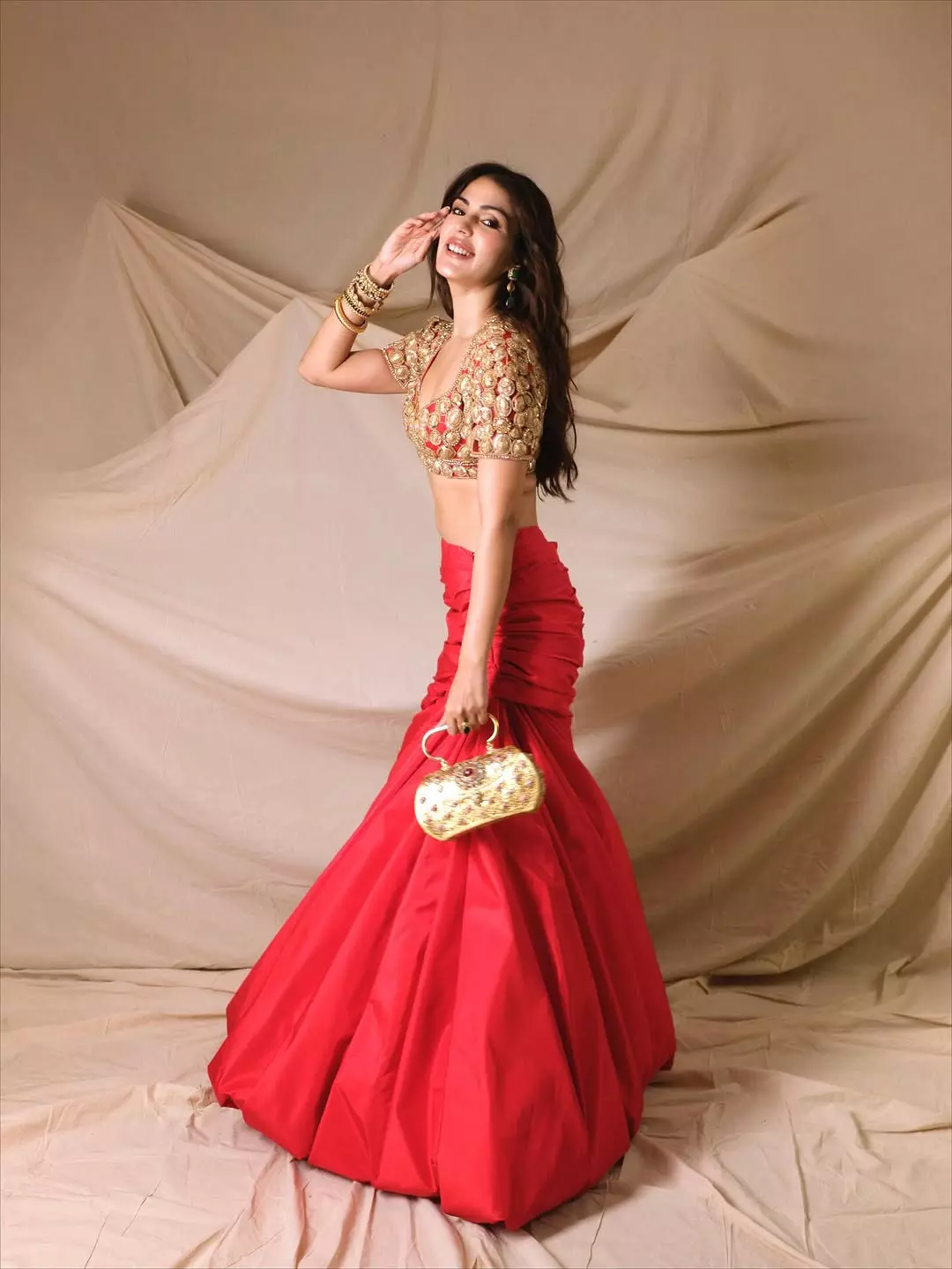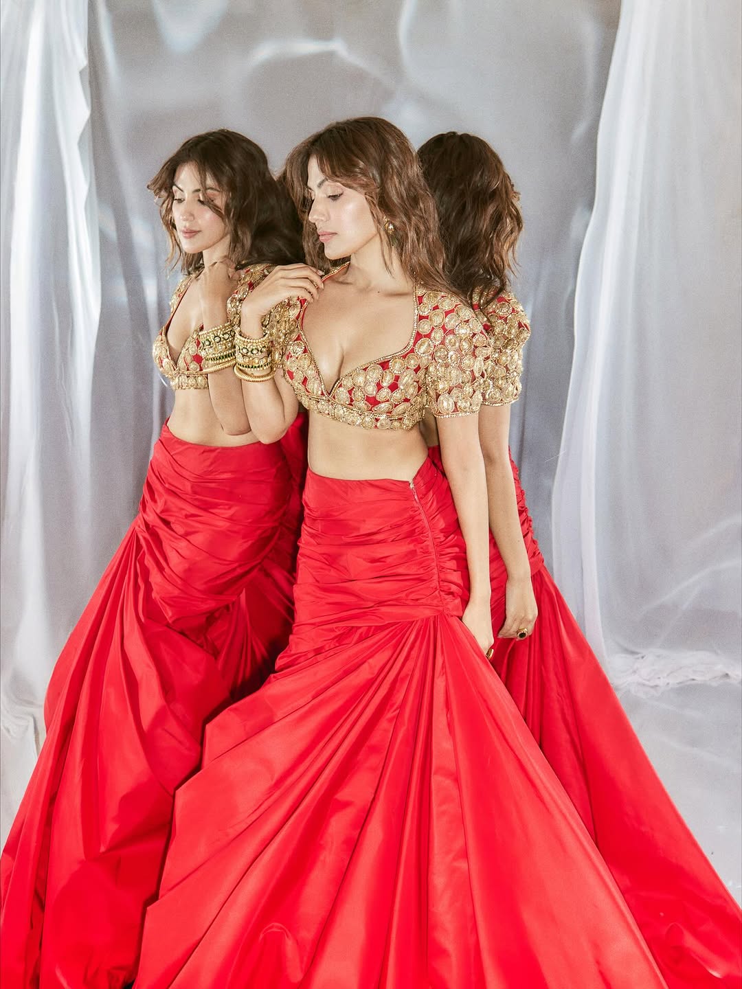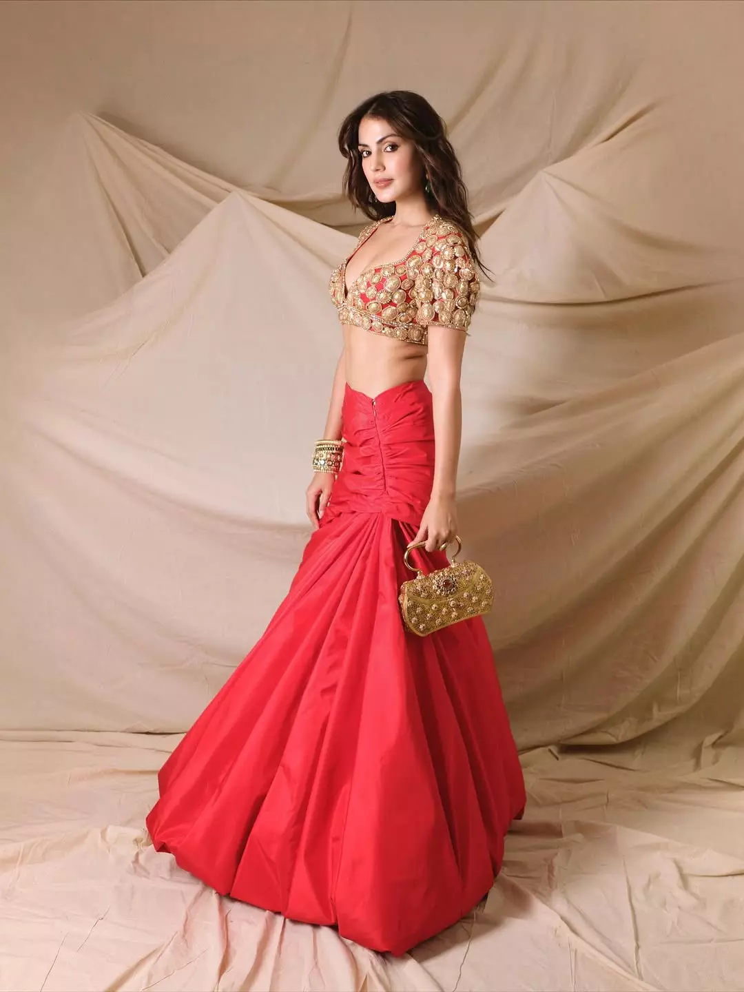 Actress Rhea Chakraborty stuns in her latest look, wearing a striking red ruched skirt paired with an intricately embellished gold blouse. The plunging neckline and mirror work add a bold yet traditional touch, blending glamour with heritage. Accessorized with statement bangles and emerald earrings, her look is a perfect example of modern Indian couture.