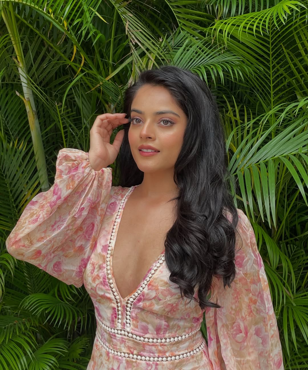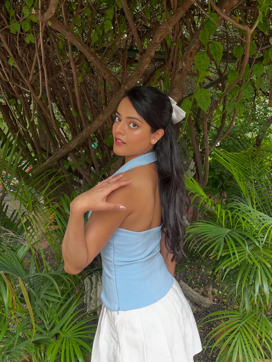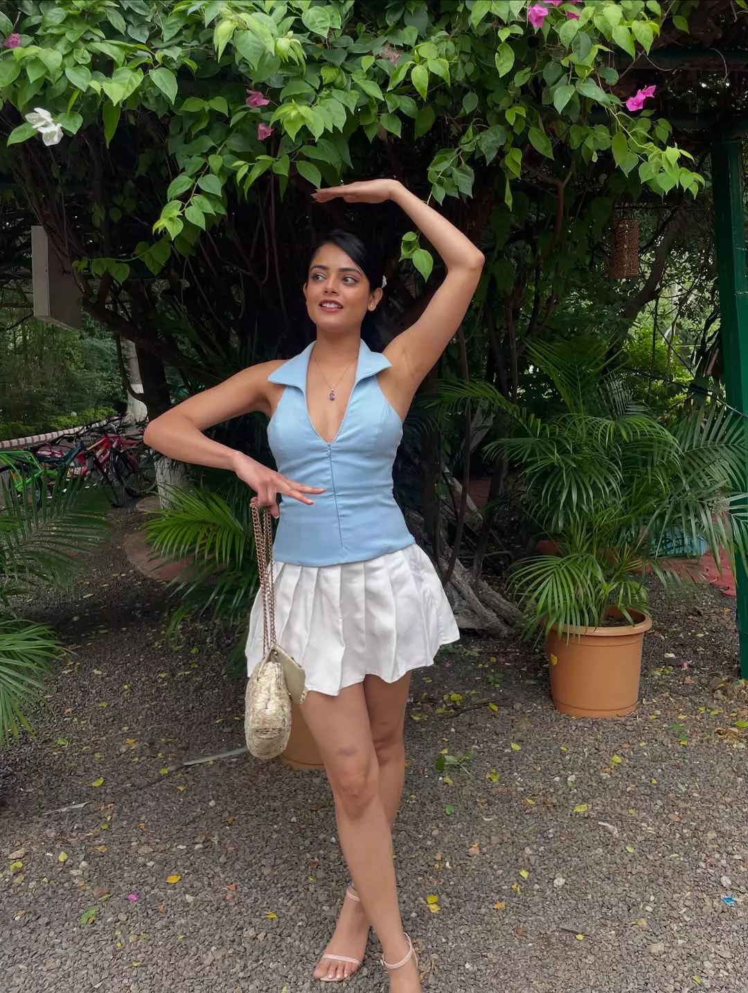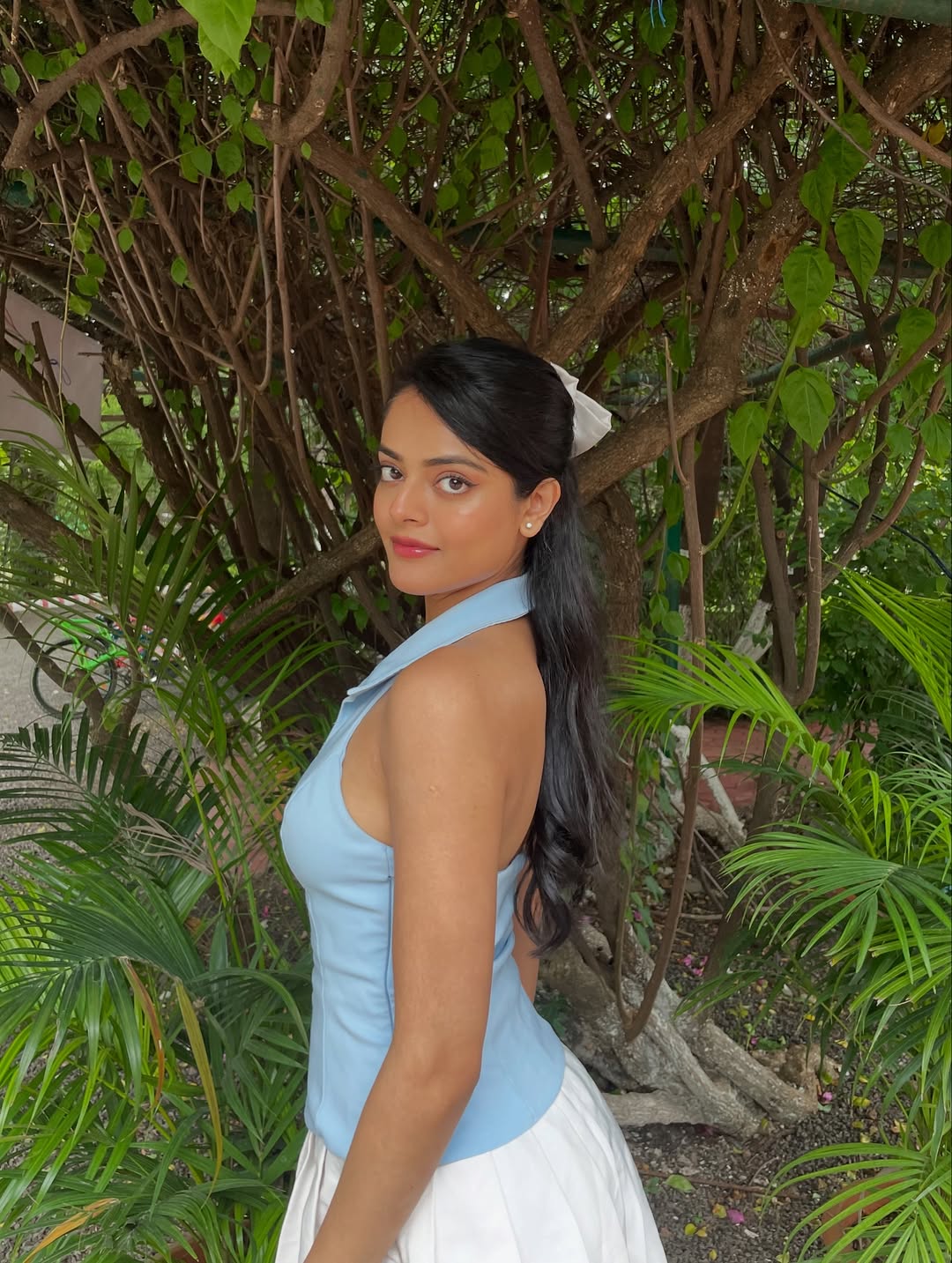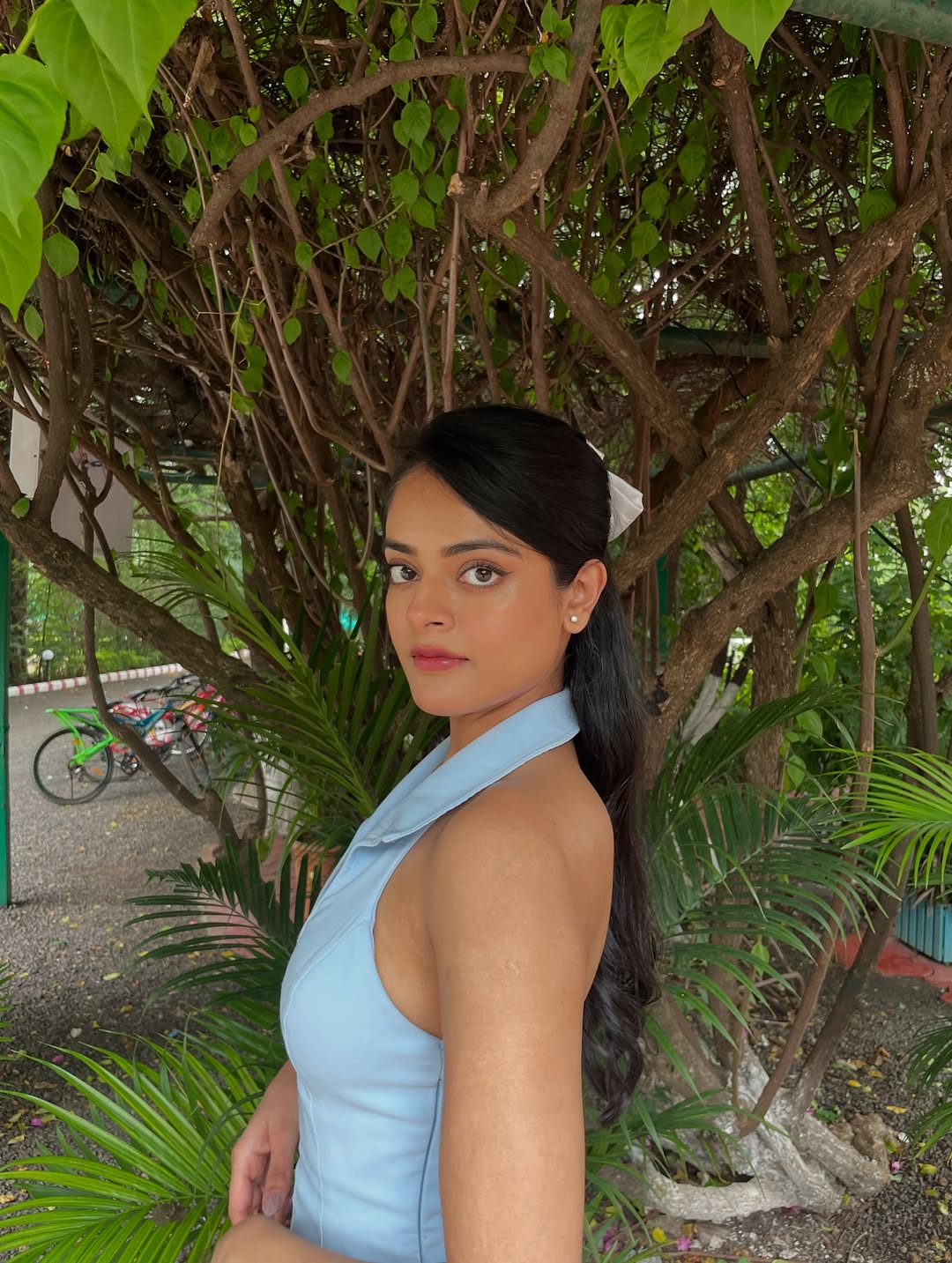 Riddhi Kumar recently shared a new picture on Instagram. She looked charming in a light blue and white dress. She posed with grace near a large tree surrounded by green plants. She carried a cream-colored handbag and wore nude heels.