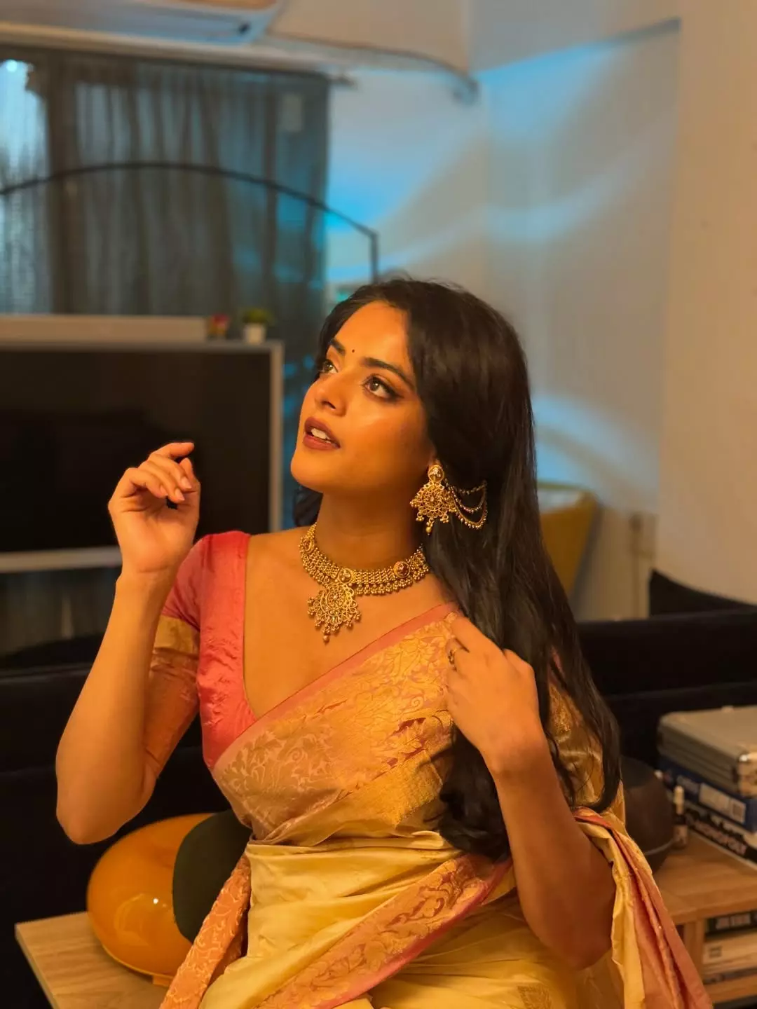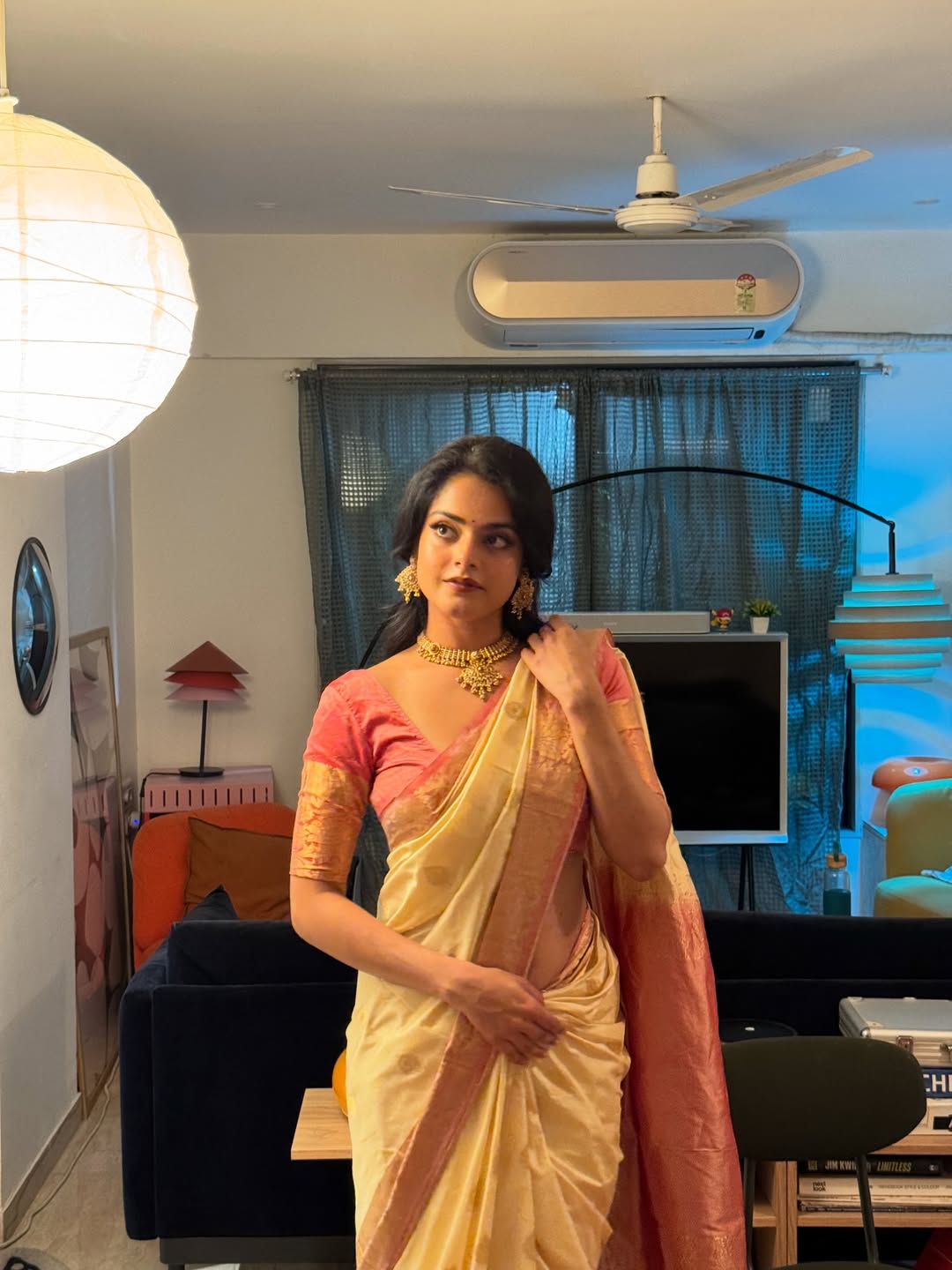Recently, Riddhi embraced the timeless charm of South Indian fashion, looking stunning in a traditional silk saree, likely a Kerala Kasavu variation. The cream-hued body with a prominent golden border, paired with a contrasting pink blouse and pallu, highlighted her elegance and poise. Its classic simplicity and refined details perfectly complemented her graceful demeanor and appreciation for cultural attire.