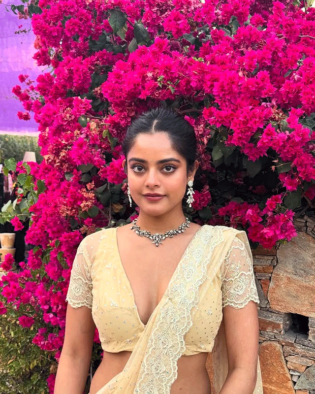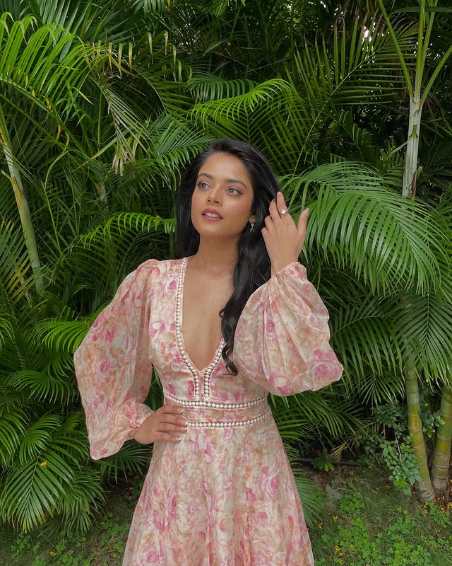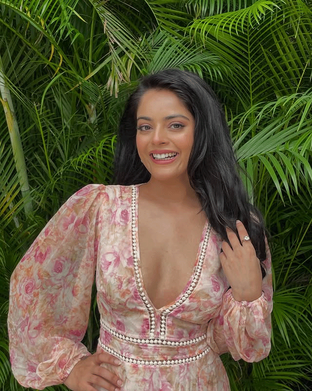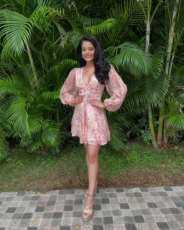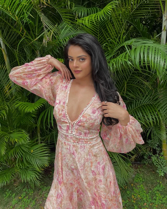 Riddhi Kumar shared a fresh and bright picture from Day 1 of her time at @missuniverseindiaorg. She is dressed in a soft floral dress with pearl detailing and is seen standing against a lush green backdrop at Unwind Resort. Her caption read: