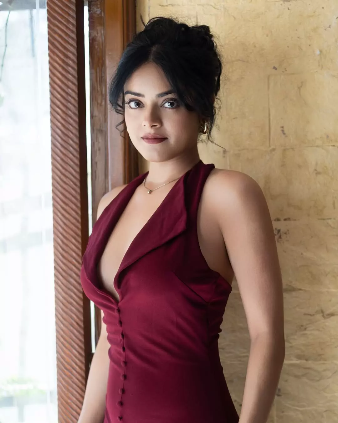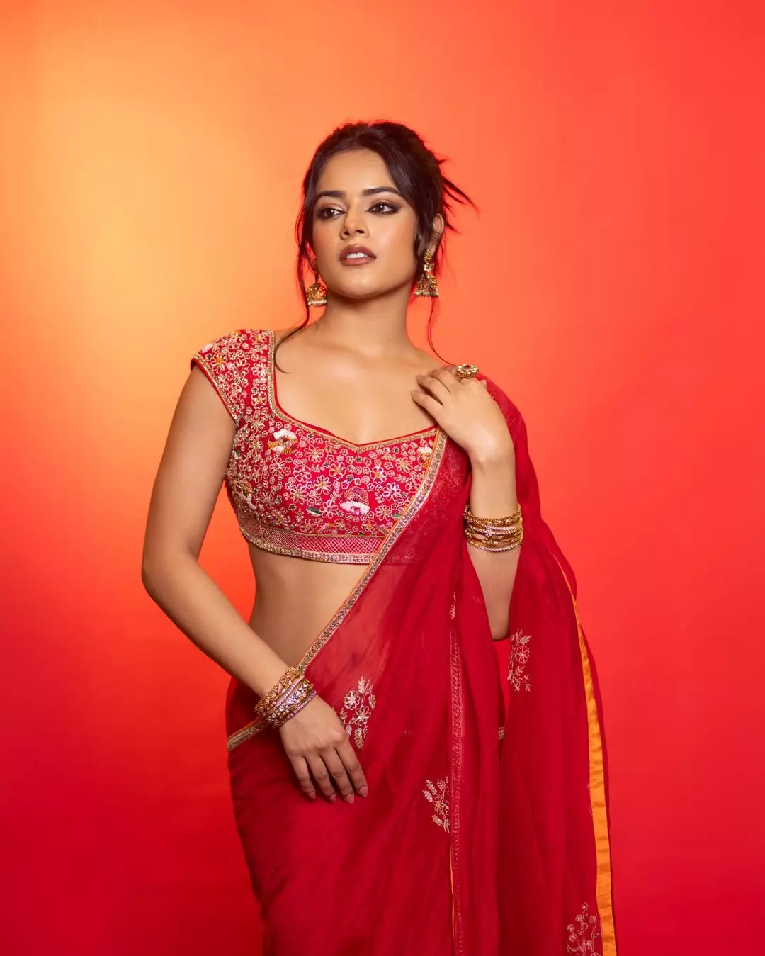 In the pictures, Riddhi Kumar is seen posing confidently against a red background. Her saree featured fine embroidery and the blouse had a stylish back design that stood out.