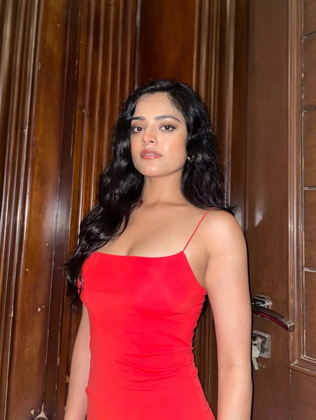 Riddhi Kumar Shines in Red at The Raja Saab Press Conference