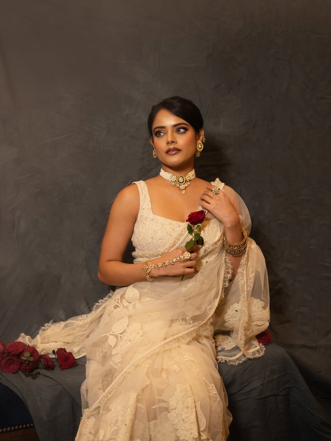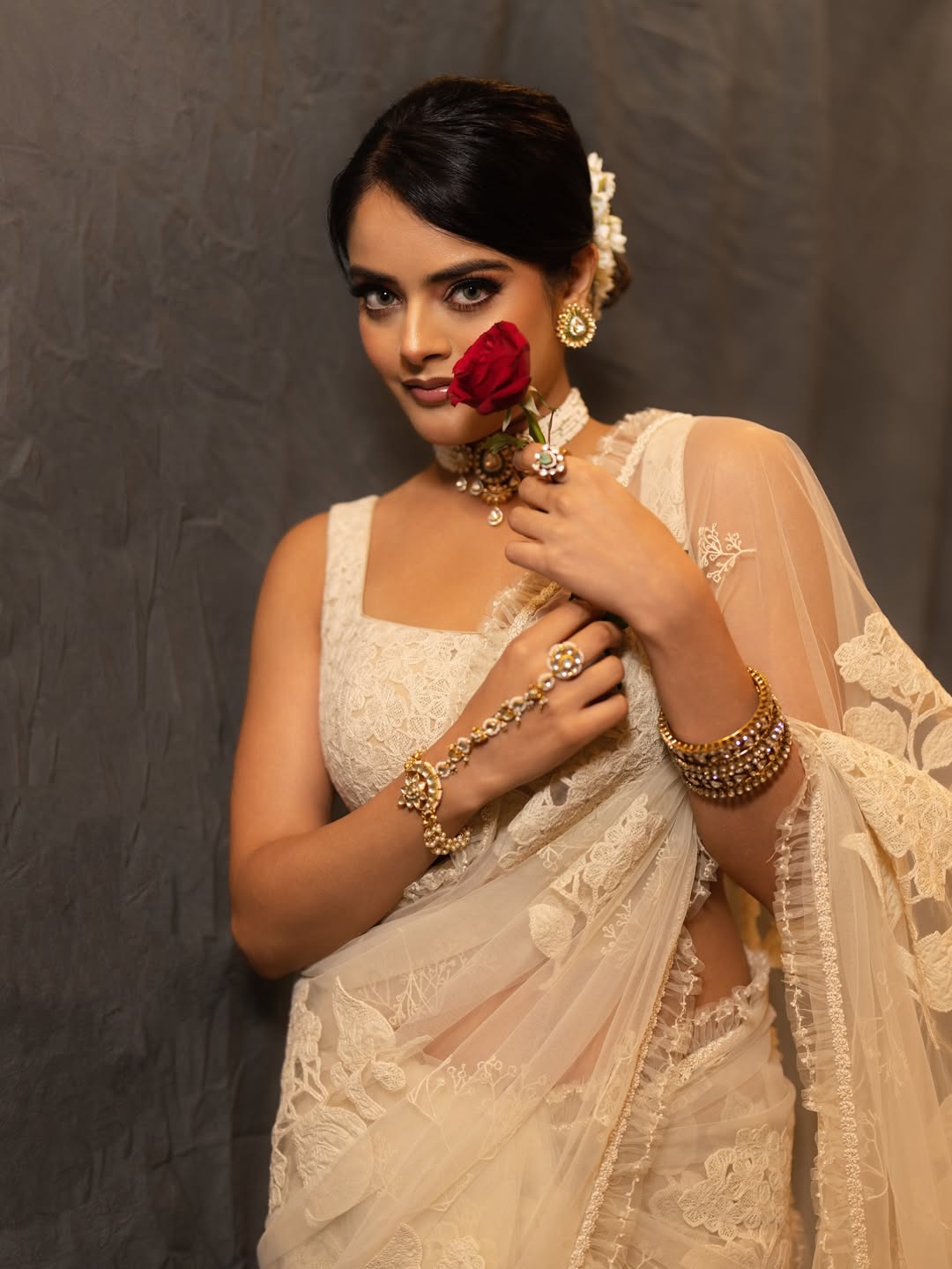 Riddhi Kumar recently caught everyone’s attention after sharing a graceful picture from a special evening linked to the pre-release event of The Raja Saab. In the image, Riddhi is seen holding a red rose and wearing a soft white saree. The actress shared these pics on instagram.