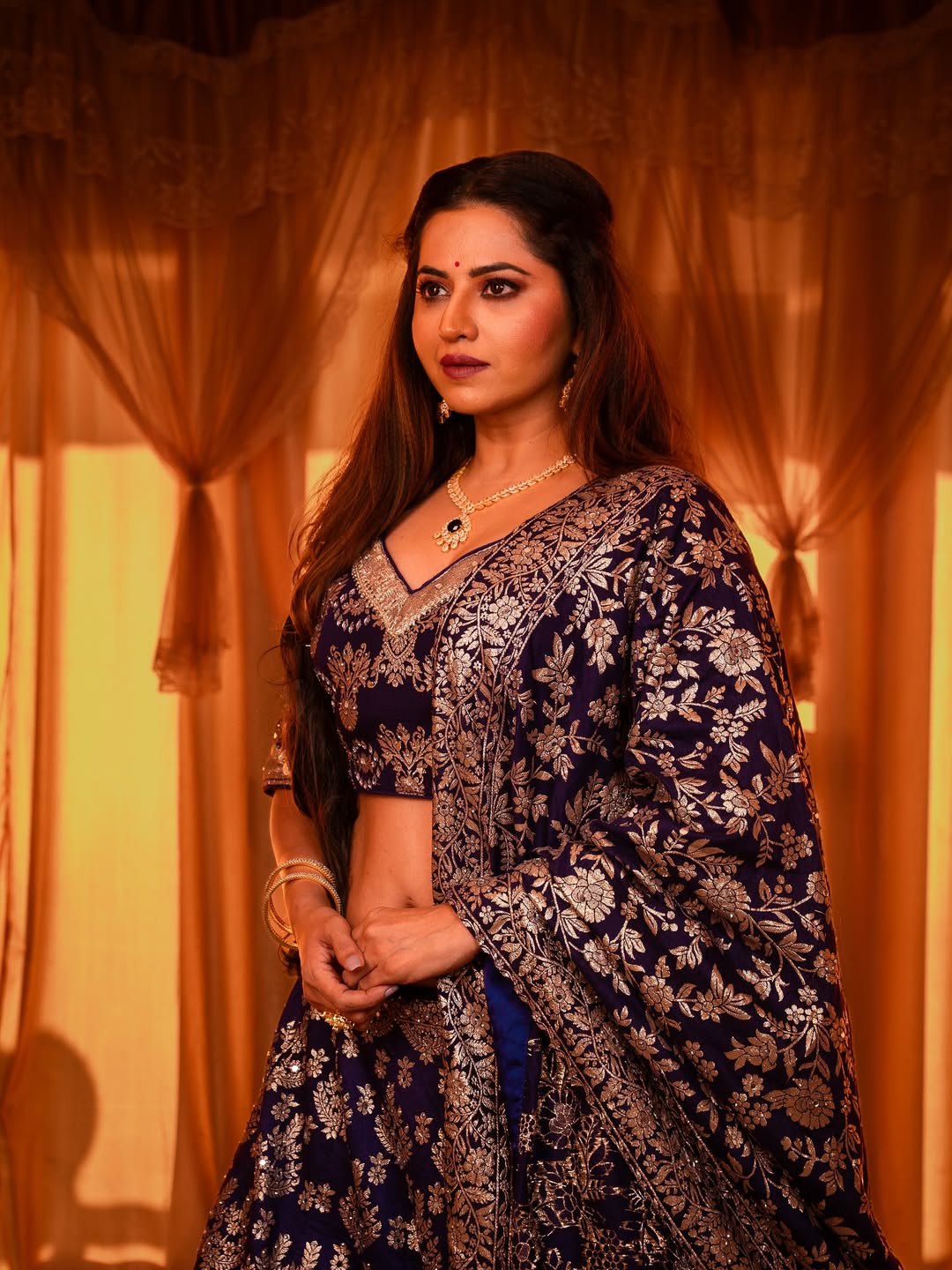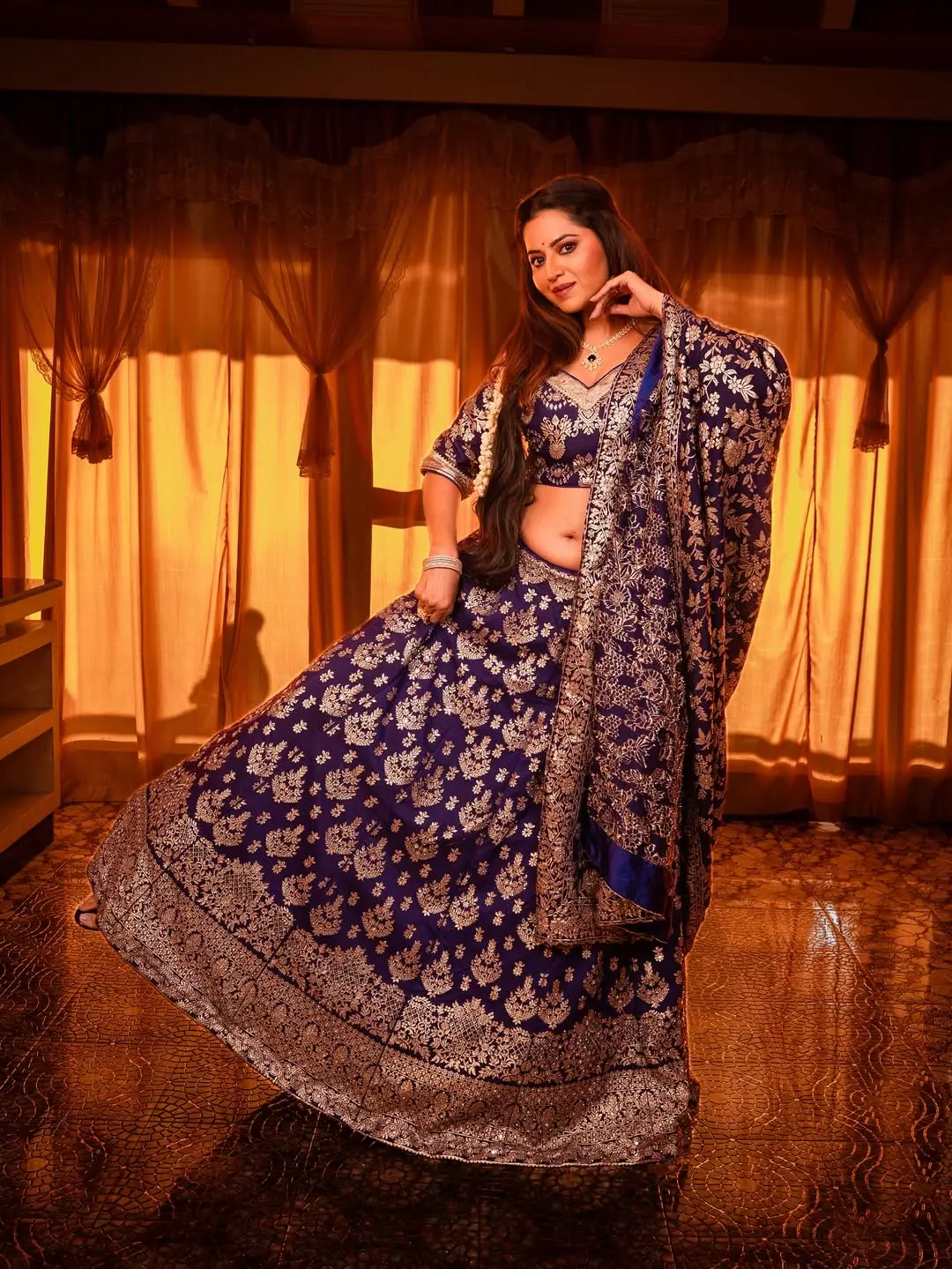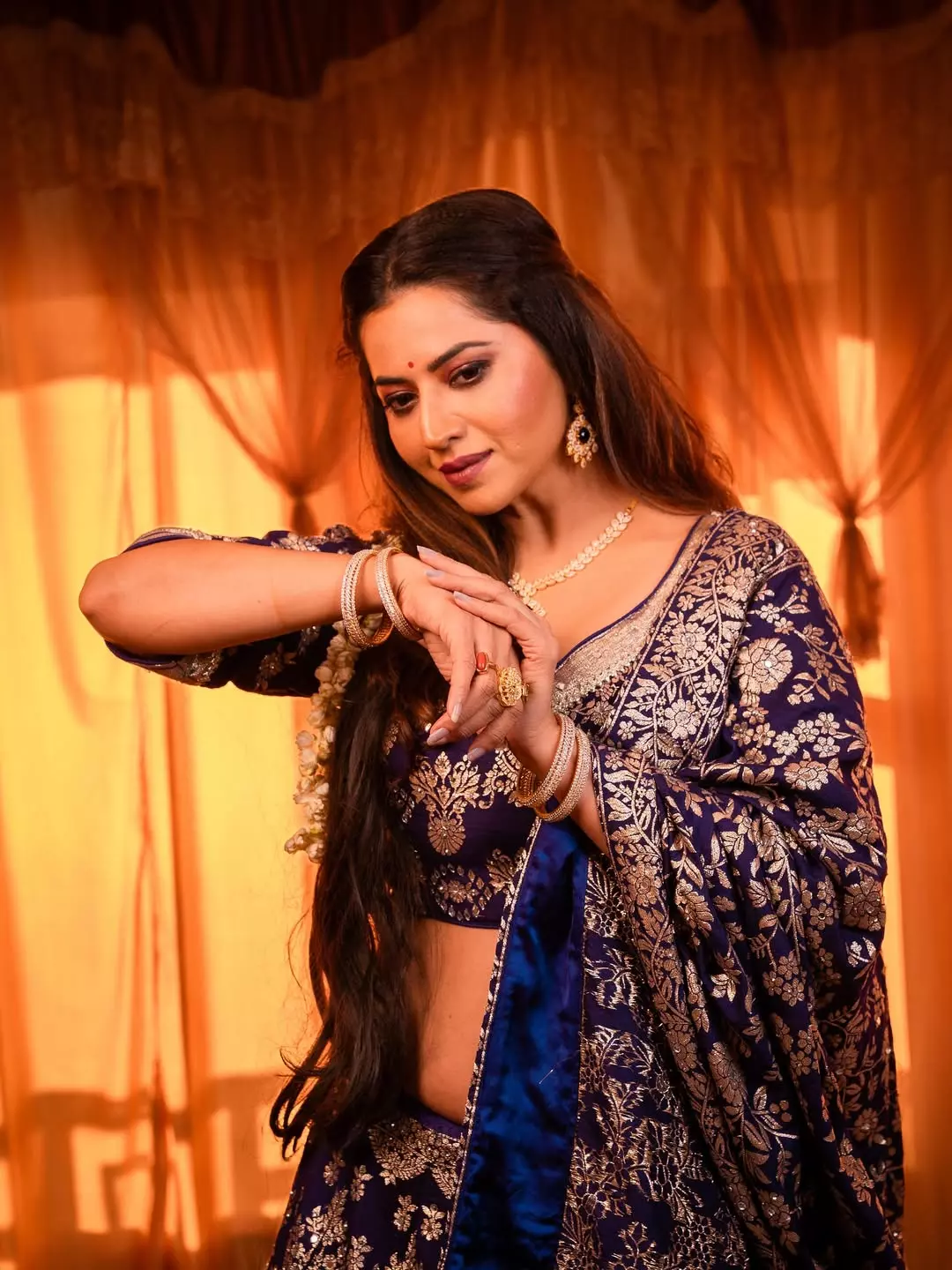 “When your outfit becomes the mood 🤷🏻‍♀️” Actress Ridhiema Tiwari perfectly summed up her latest look in a breathtaking royal blue and gold lehenga by @iha_designs. The ensemble radiates opulence with its intricate zari work, rich textures, and elegant drape. Styled with traditional @parakkat_jewels and flawless makeup and hair by @tessyalosiousofficial, Ridhiema embodies grace, confidence, and timeless beauty.