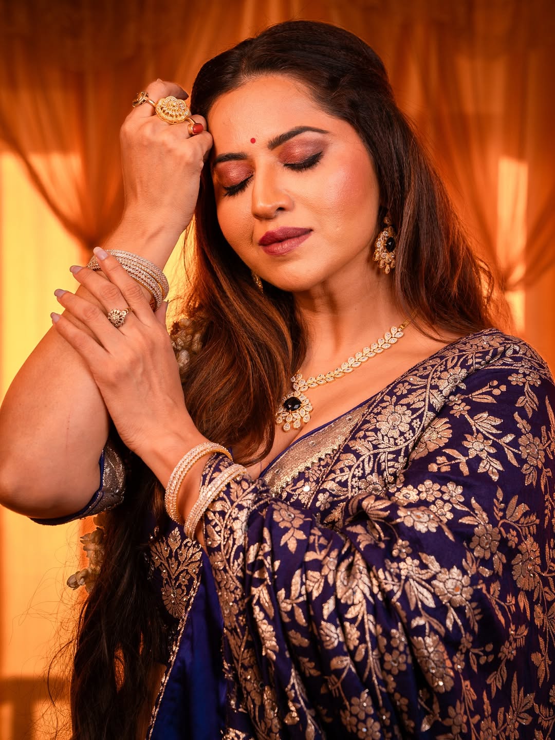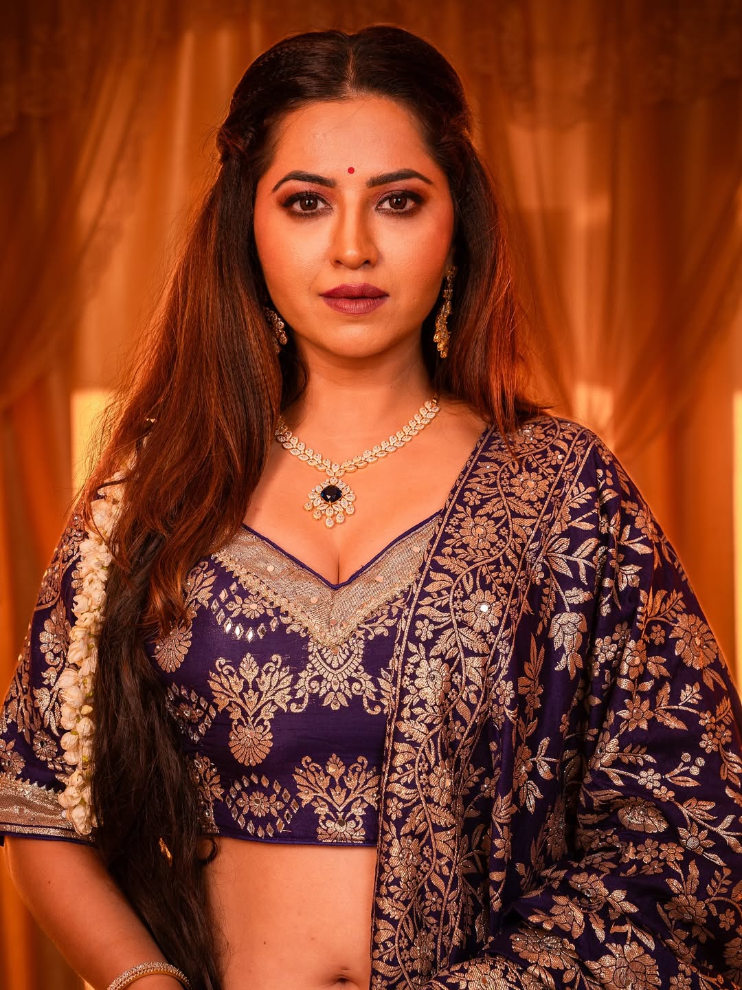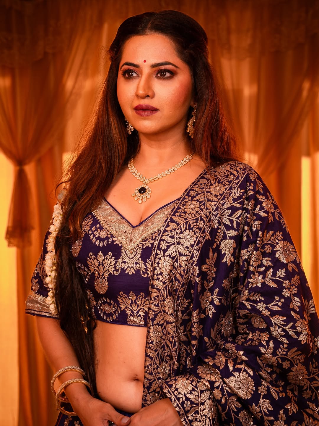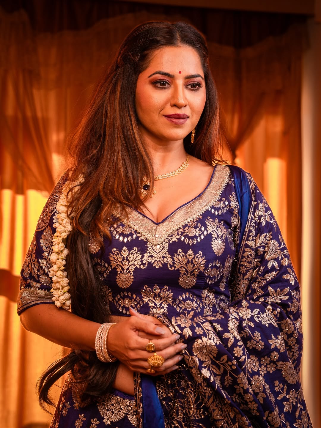 “When your outfit becomes the mood 🤷🏻‍♀️” Actress Ridhiema Tiwari perfectly summed up her latest look in a breathtaking royal blue and gold lehenga by @iha_designs. The ensemble radiates opulence with its intricate zari work, rich textures, and elegant drape. Styled with traditional @parakkat_jewels and flawless makeup and hair by @tessyalosiousofficial, Ridhiema embodies grace, confidence, and timeless beauty.