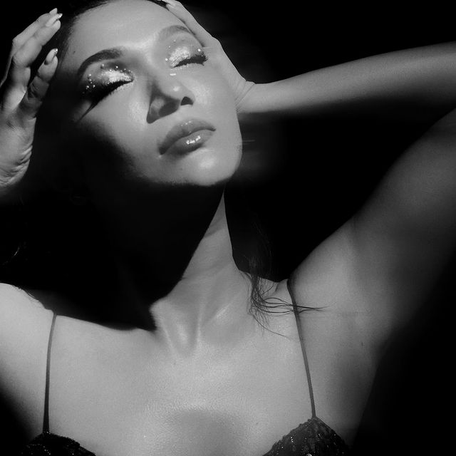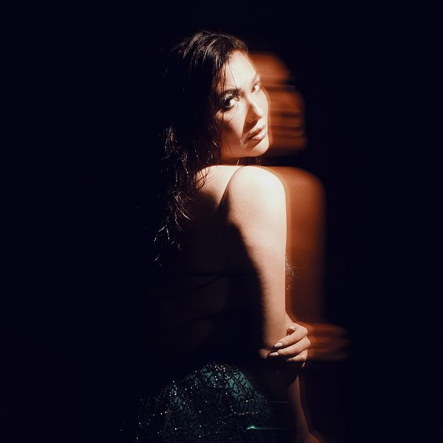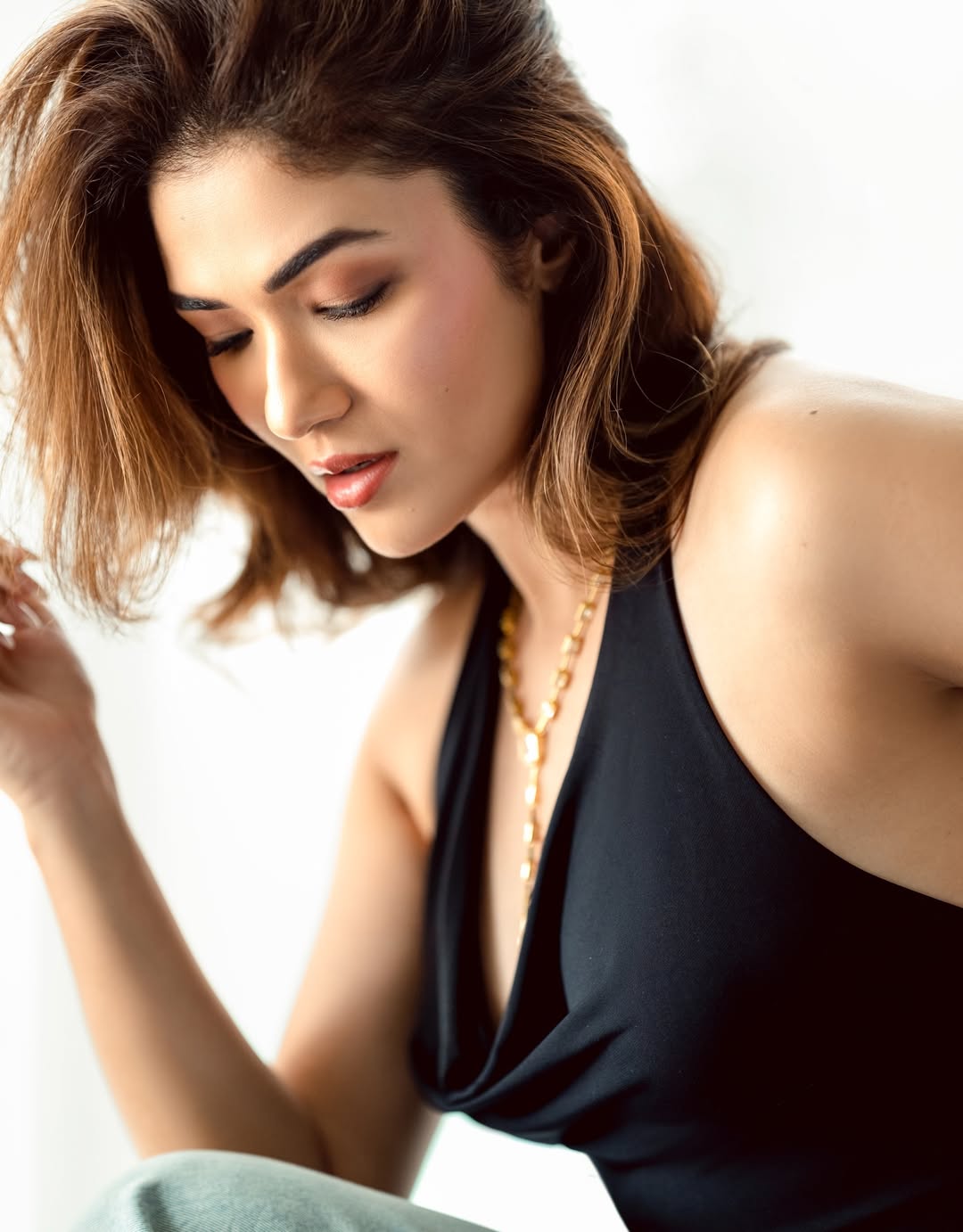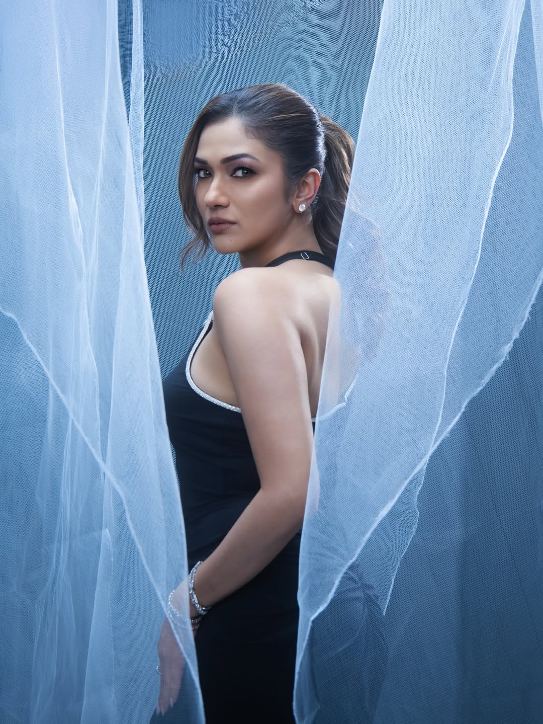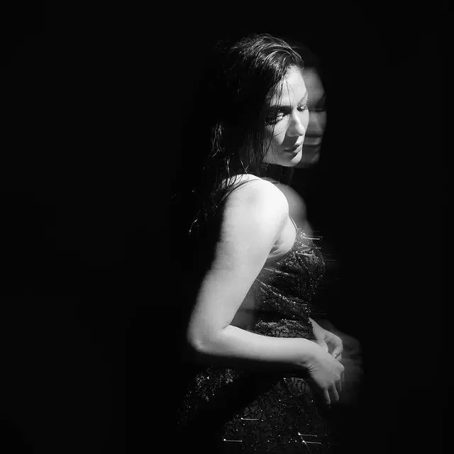 She stuns in a sleek black sleeveless top featuring a chic cowl-neck or halter-neck design, radiating sophistication and contemporary elegance.