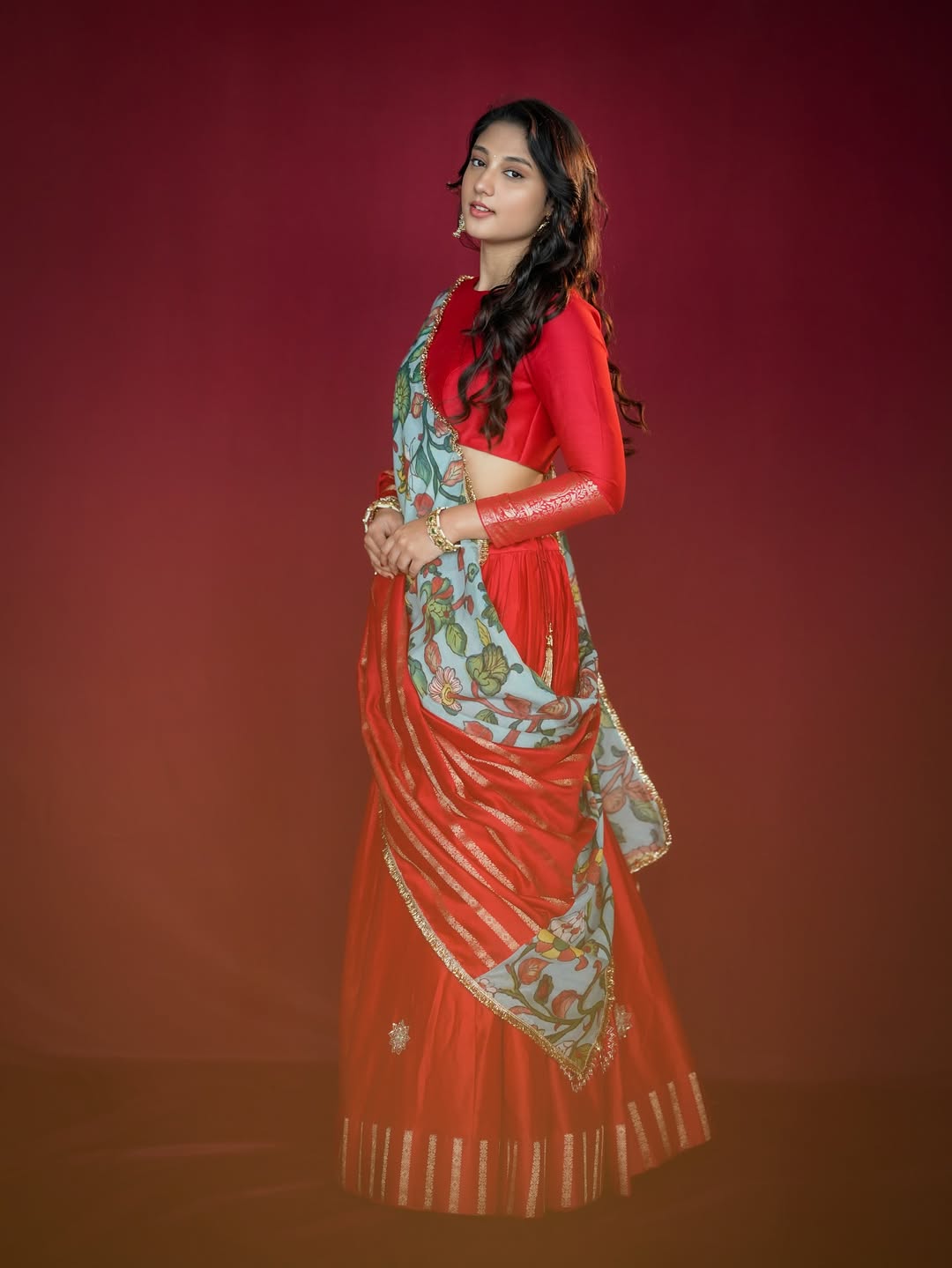 The vibrant shade perfectly reflects her radiant personality, striking a balance between traditional elegance and modern charm.