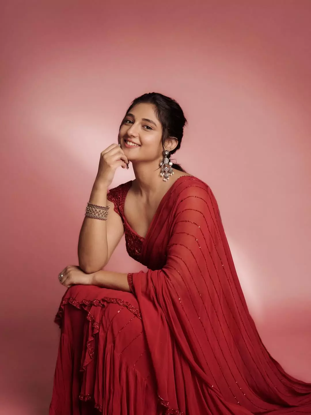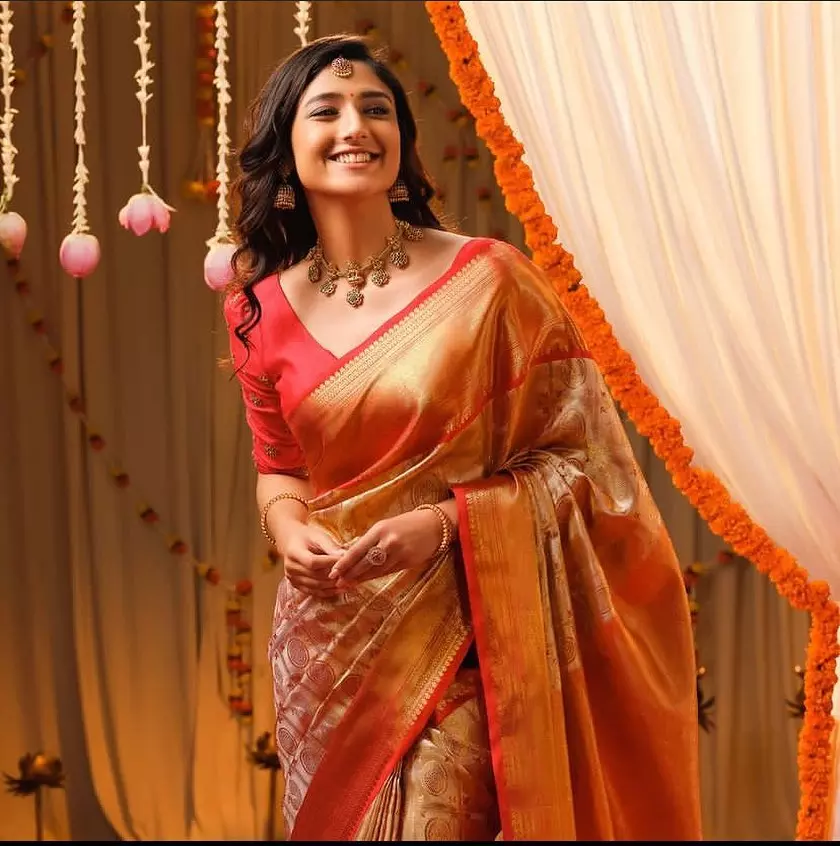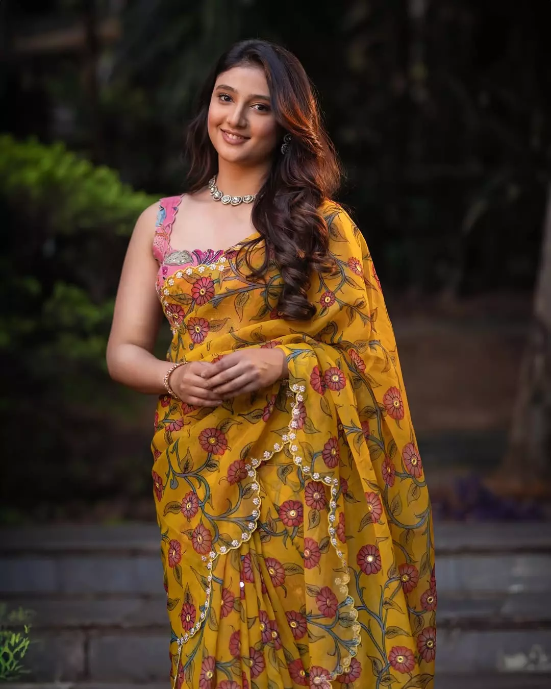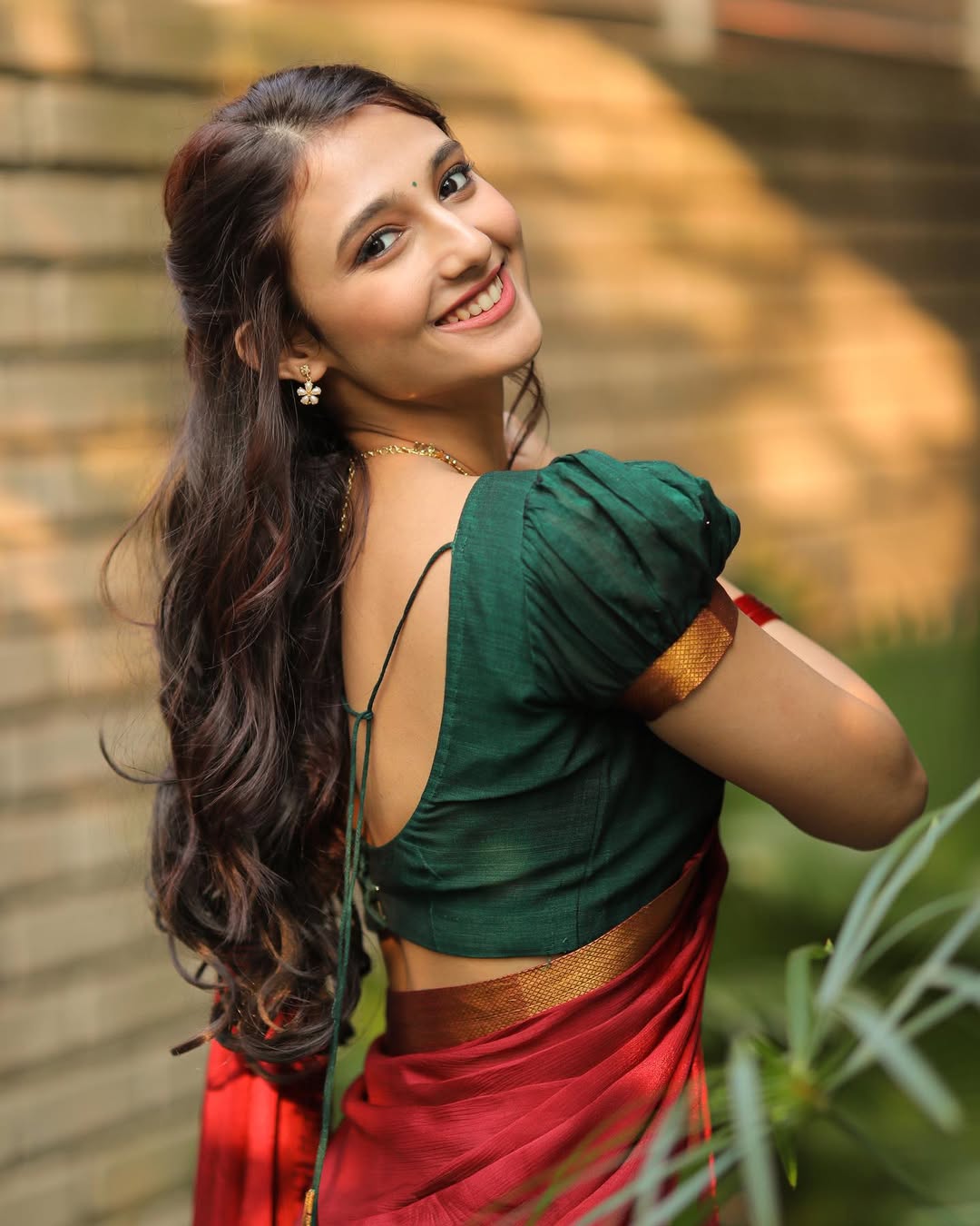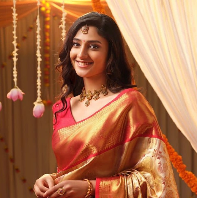 In her latest saree clicks she embodies effortless elegance—draped in flowing silk, adorned with fine jewellery, and styled to embrace nature’s palette. With styling by @vinnu_baby9, saree from @gowrisignatures, jewellery by @tyaanijewellery, makeup by @makeupandhairbyshuchi and hair by @paidi.sapna, each frame captures her graceful transition from screen-star to style-icon.