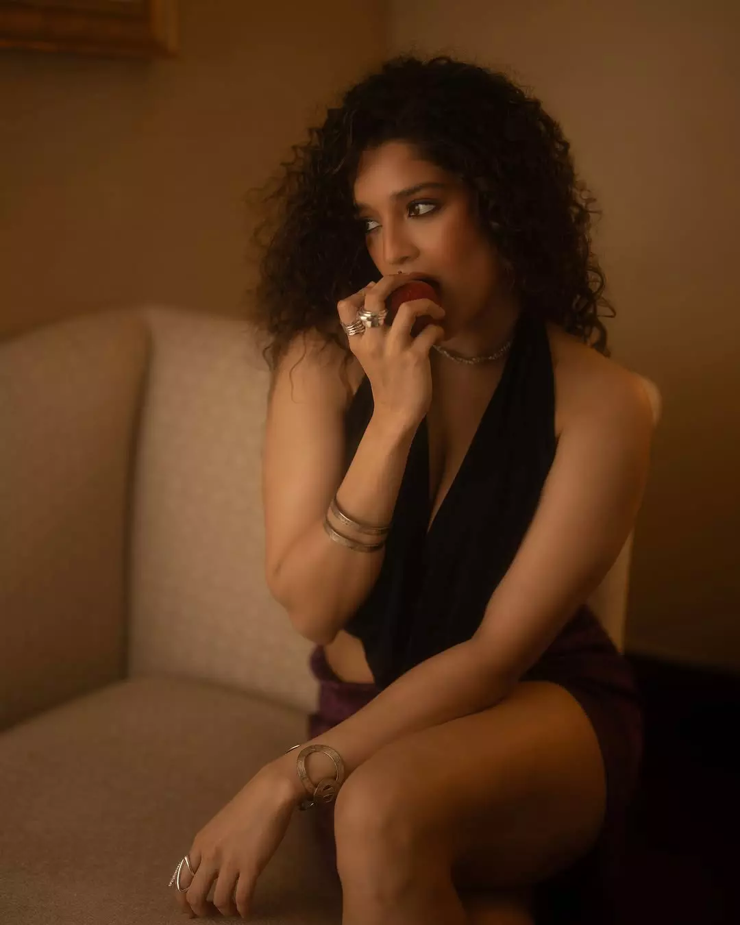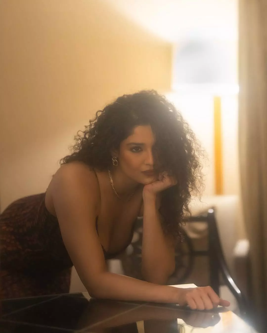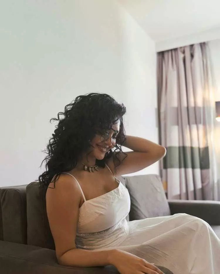 Ritika Singh, the talented Indian actress and former mixed martial artist, recently shared a captivating indoor portrait. Leaning forward with voluminous curly hair cascading around her face, a deep neckline, and a thoughtful gaze resting on her hand, she exuded quiet intensity and effortless sensuality in the warm, softly lit frame.