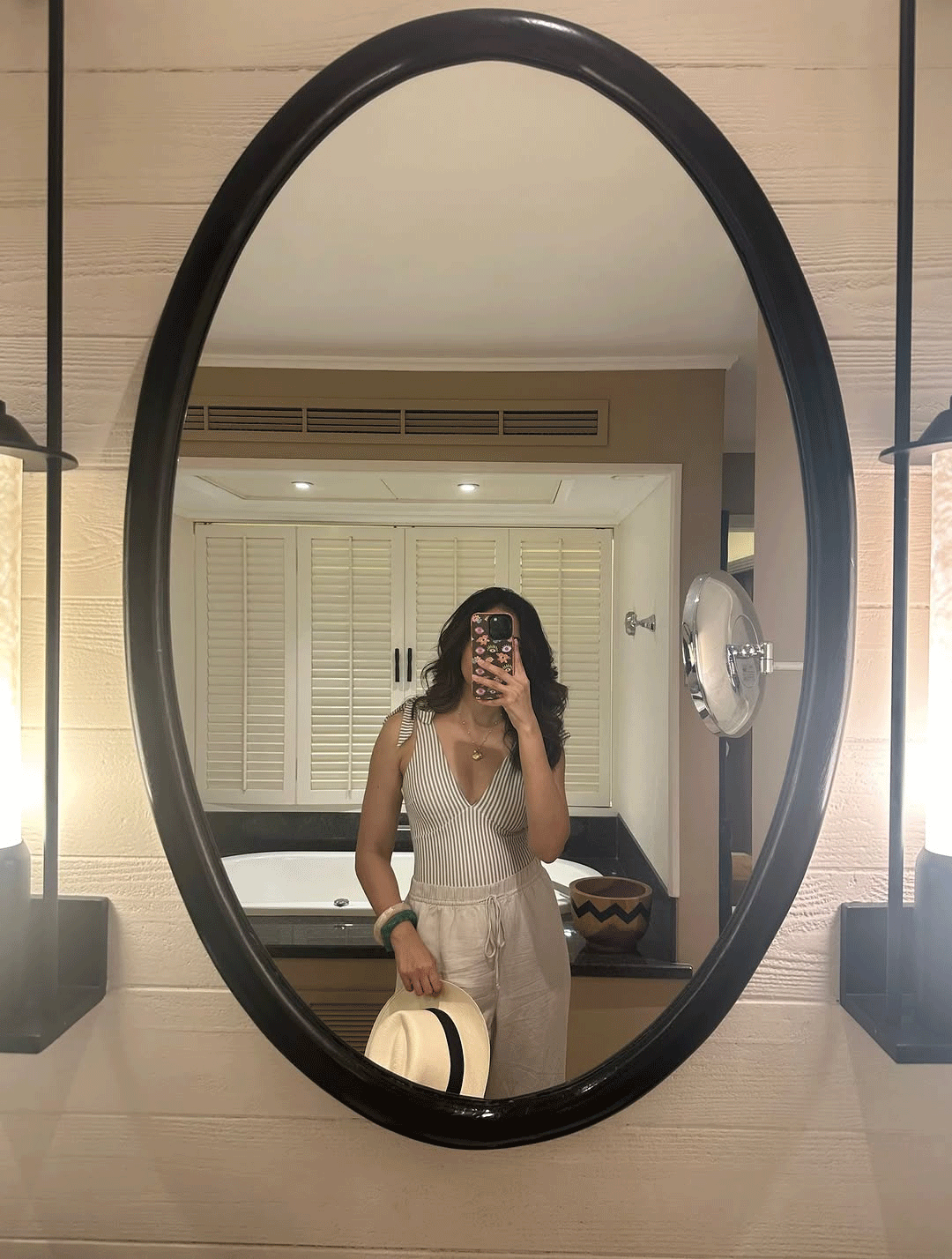 She wore a white shirt paired with dark trousers. Her natural expression gave the photo a graceful touch. The picture was clicked by @pranav.foto.