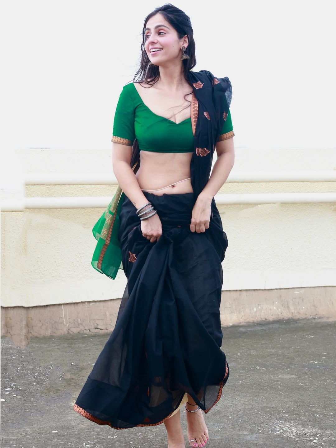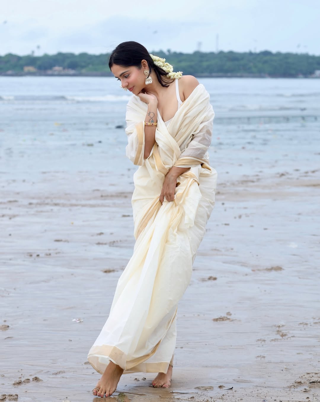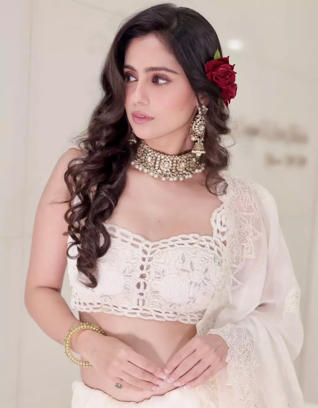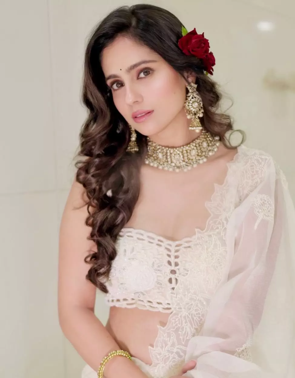 Rose Sardana once again proves why she is admired for her effortless beauty and graceful screen presence. In this latest photoshoot, she looks breathtaking in a soft white saree paired with intricate jewelry and subtle makeup that highlights her natural charm. The rose tucked into her hair adds a romantic touch, enhancing the overall elegance of her look. Rose carries traditional attire with remarkable ease, blending classic aesthetics with contemporary confidence.