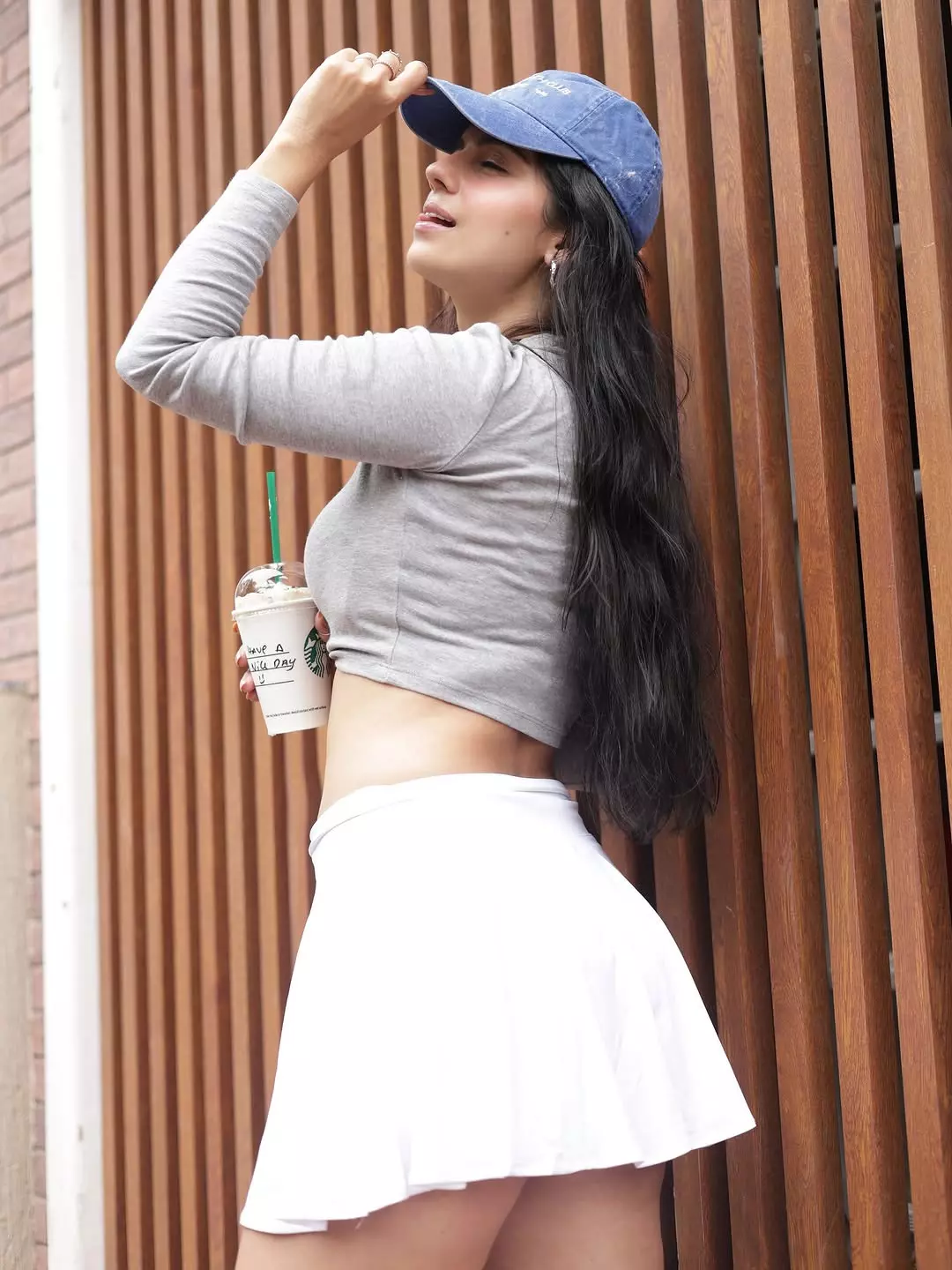 In the photo, Rose is seen sitting on a chair in a relaxed pose. She is wearing a simple grey full-sleeve crop top and a white skirt. She has paired her look with a blue cap and light accessories. The background has wooden panels, which give the picture a warm and classy feel.