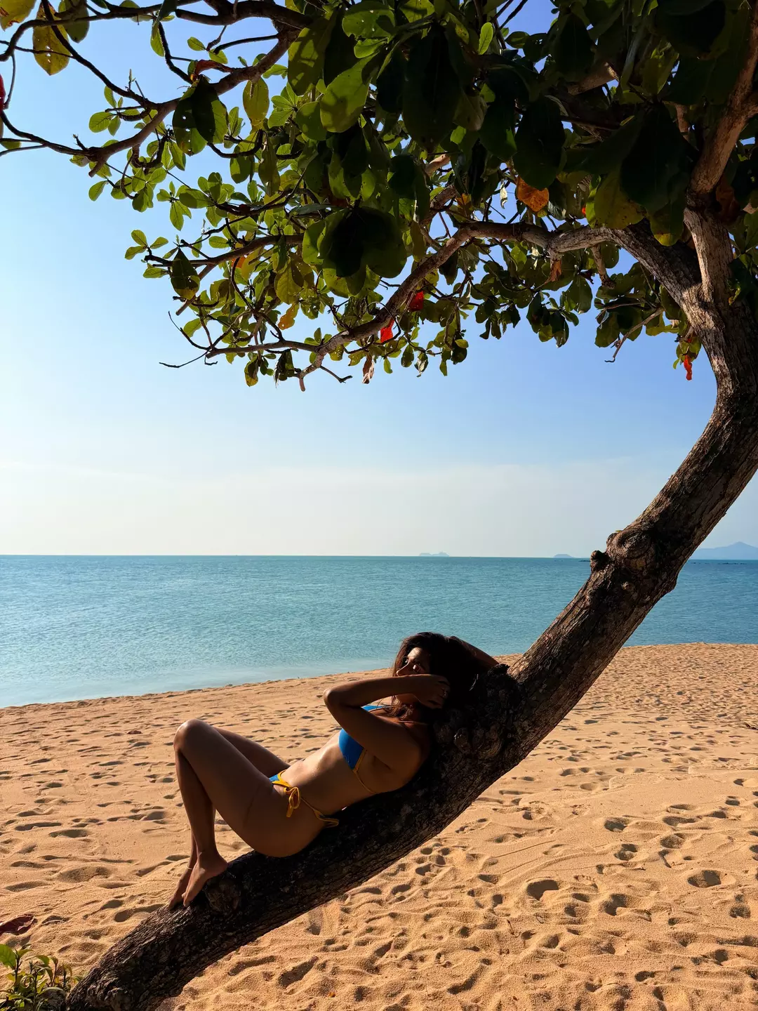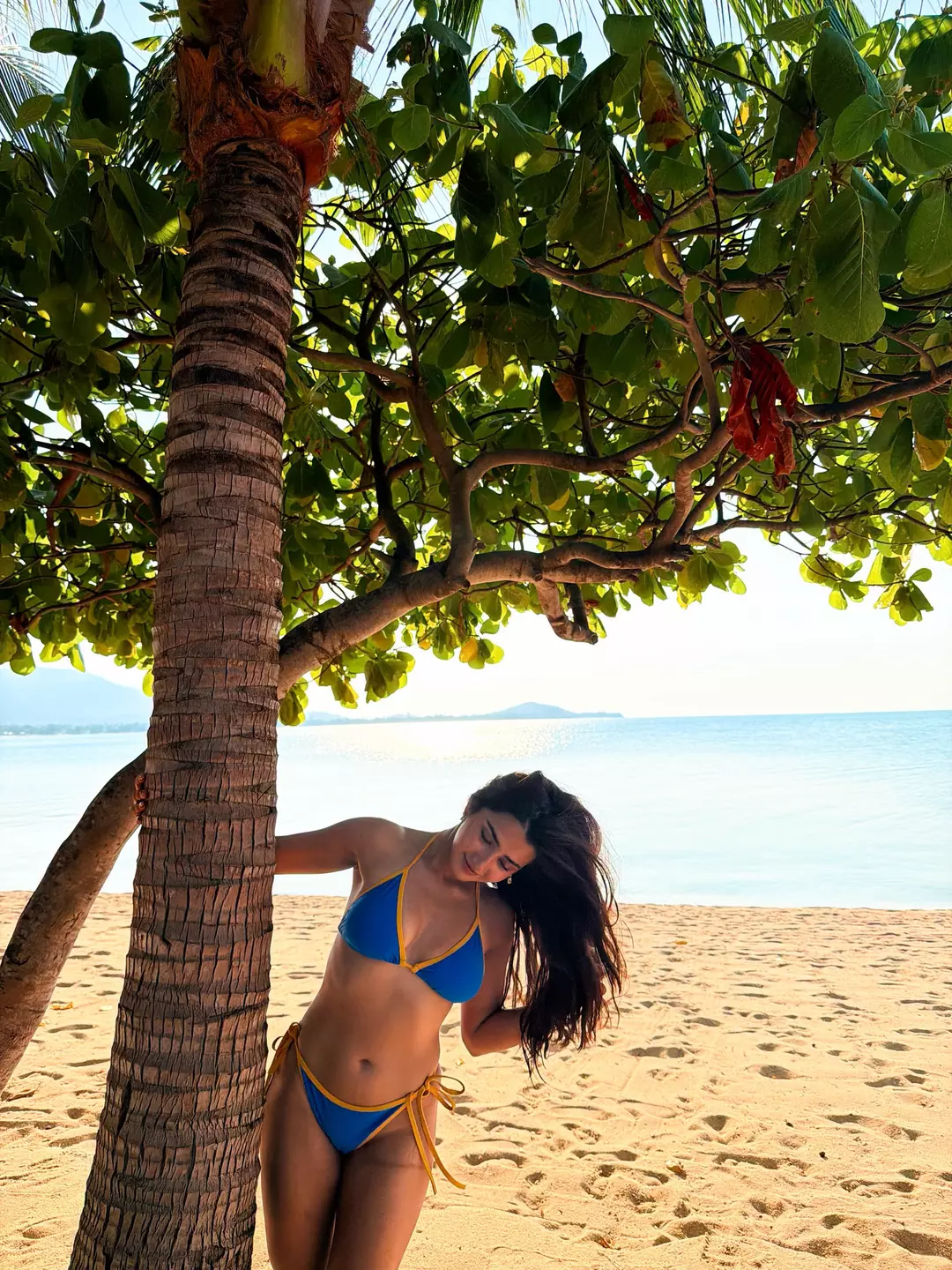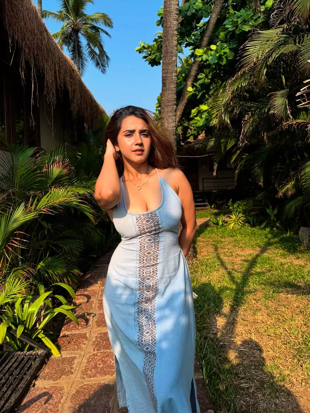 Roshni Walia turns up the heat in this breezy beachside frame, effortlessly blending glamour with carefree charm. Set against a serene shoreline and shaded by lush green palms, she walks confidently along the sand in a vibrant blue bikini, capturing a perfect mix of elegance and bold summer energy. The natural lighting enhances her glowing skin tone, while the calm ocean backdrop adds a refreshing, vacation-like vibe to the composition.