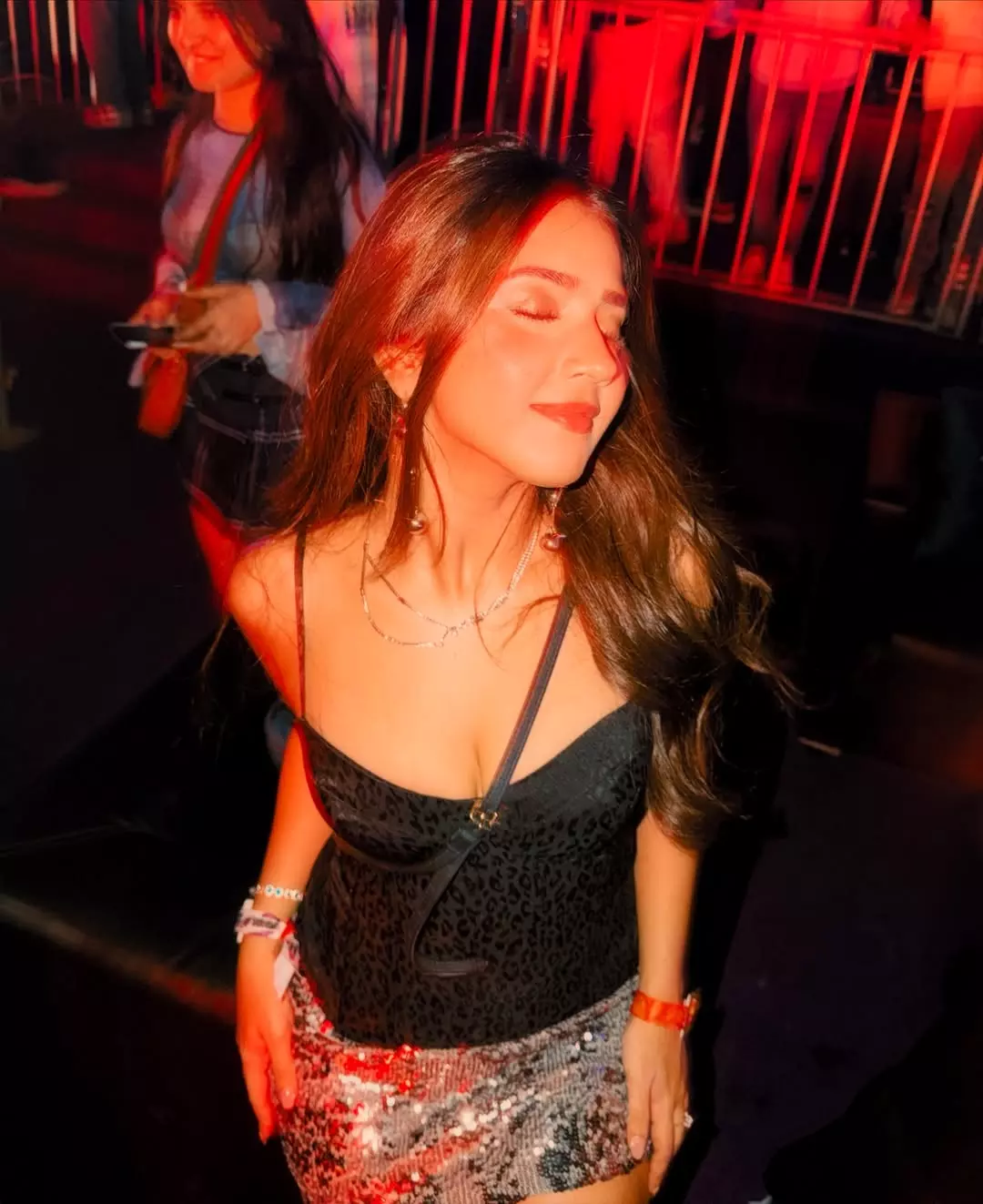 Roshni Walia lights up the night with infectious joy, glowing against a wild neon graffiti wall splashed in electric pinks and purples. Rocking a sleek black satin corset top paired with a shimmering sequined mini skirt, she channels pure party energy—hair tousled, eyes sparkling, and that radiant smile stealing the entire frame. Effortlessly cool, bold, and unapologetically fun.