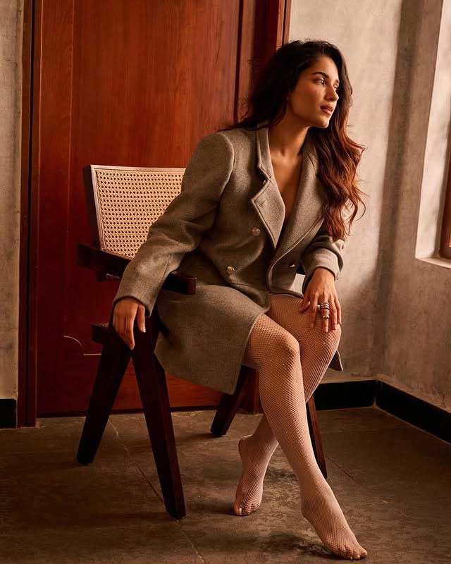 Ruhani Sharma, known for her charm and nuanced performances, continues to make waves in the Indian film industry. In this stunning black-and-white portrait, she exudes effortless confidence and modern edge. Dressed in a stylish black bralette paired with high-waisted tactical pants and a casual oversized jacket, Ruhani blends street style with elegance. Her wavy hair and poised expression highlight her natural allure and strong screen presence.