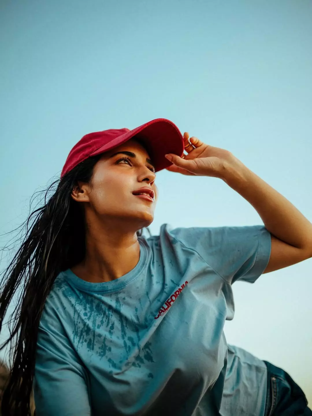 In this vibrant beach photoshoot, Ruhani Sharma radiates effortless charm and summer energy. Kneeling on the sand with windswept wet hair, a red cap, and a casual light blue "California" t-shirt paired with ripped denim shorts, she strikes a cool, carefree pose while soaking in the golden hour glow. A chilled drink in the foreground perfectly captures the relaxed vibe.Current mood