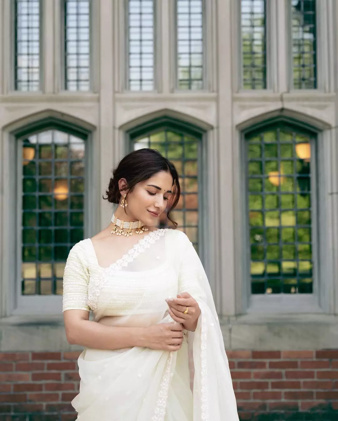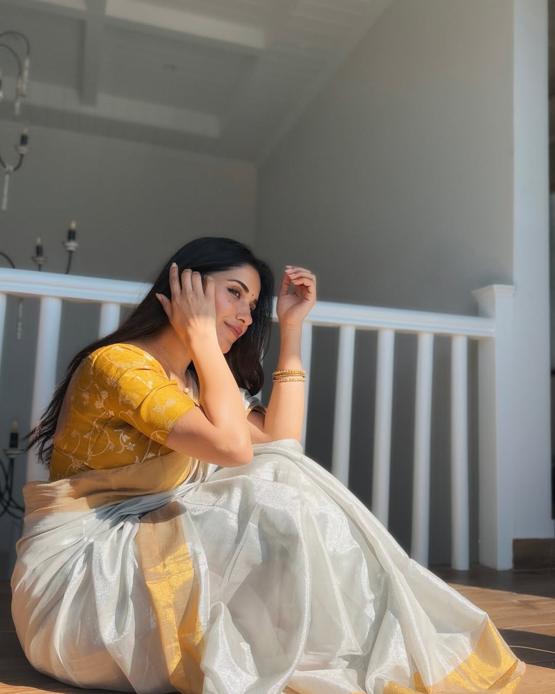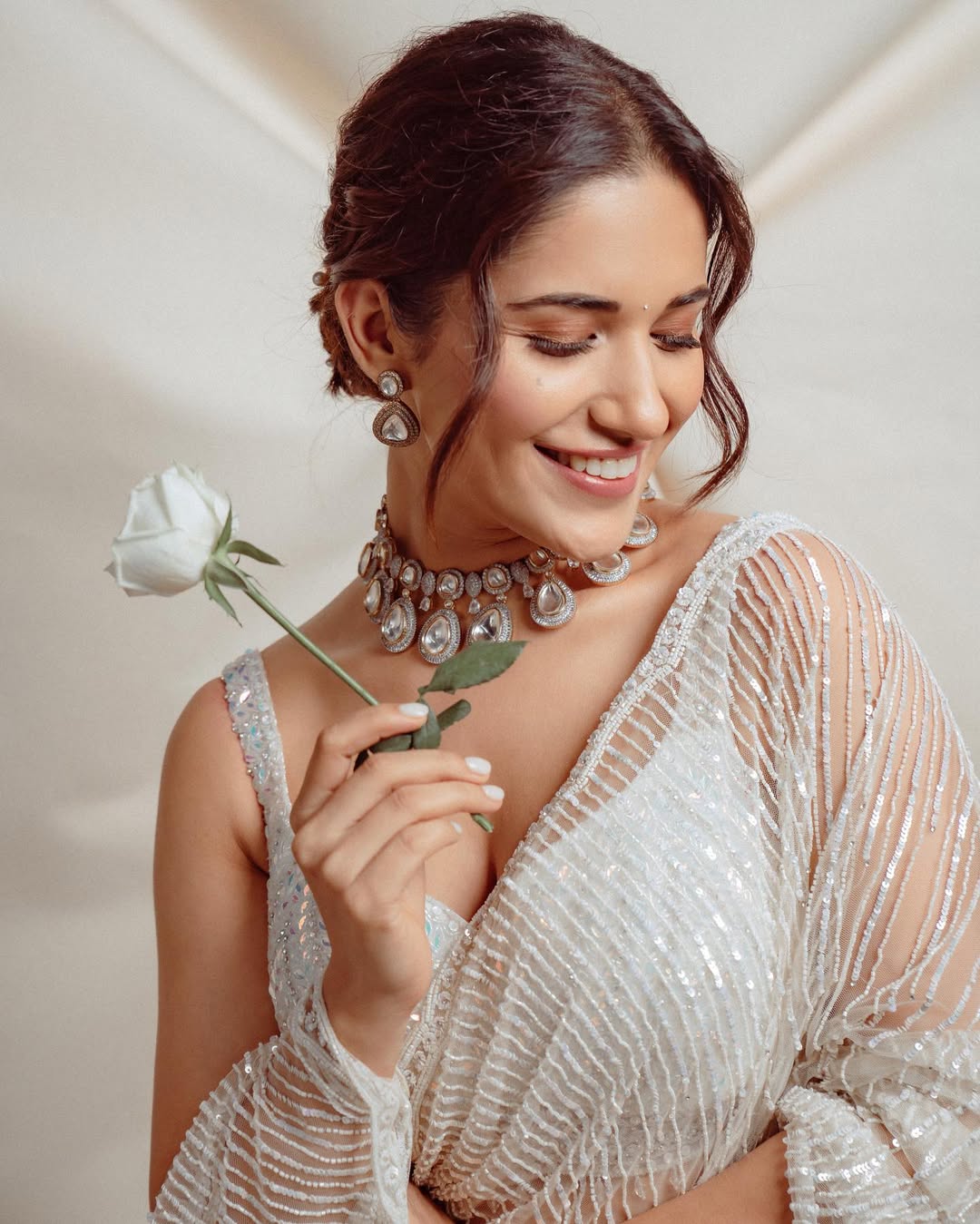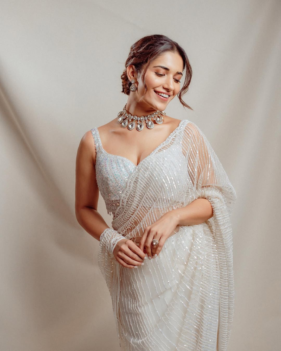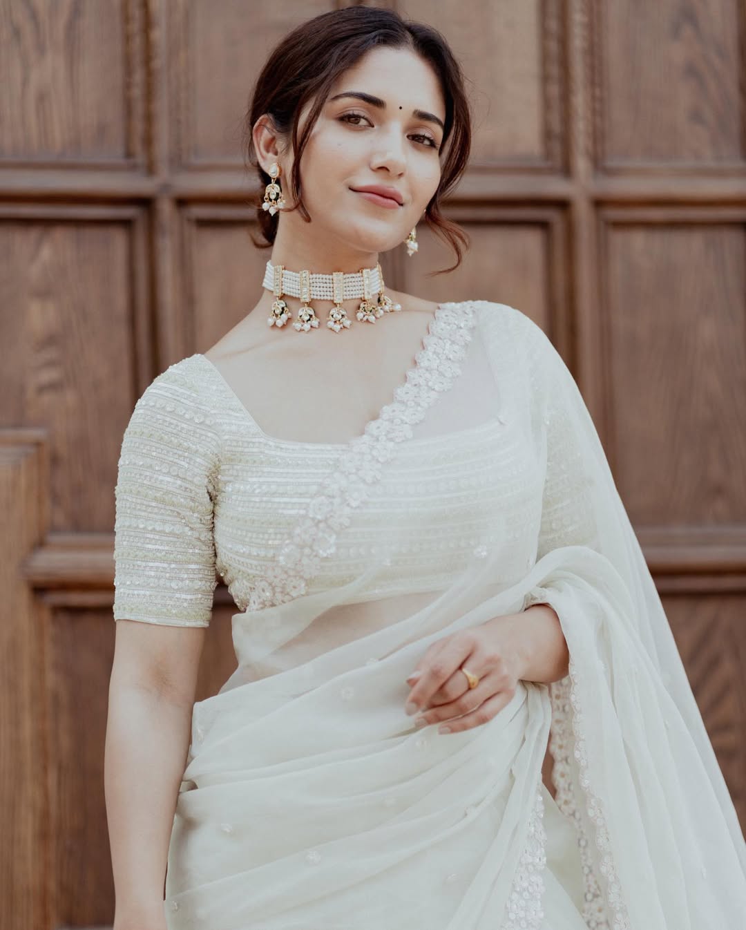 Ruhani Sharma radiates ethereal charm in this stunning saree, blending delicate femininity with regal sophistication. The sheer fabric, adorned with intricate silver floral embroidery, flows gracefully, while the contrasting .The subtle scalloped border and fine detailing enhance the overall ensemble, making it perfect for festive occasions or high-profile events. With minimal accessories, dewy makeup, and soft, voluminous hair swept back, Ruhani lets the saree’s beauty shine while maintaining an effortlessly graceful aura.