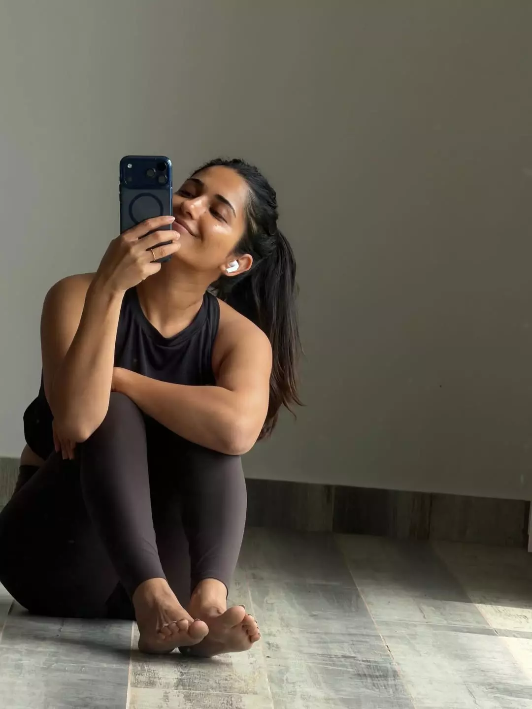 The subtle lighting and neutral background draw all attention to her expressive face and confident stance. With her hair tied back and makeup kept soft, Ruhani embraces simplicity, letting her personality shine through. The caption “April so far 🦋” perfectly reflects her current vibe — calm, graceful, and evolving with each passing day.